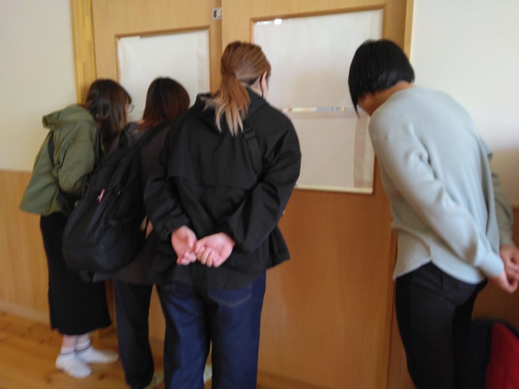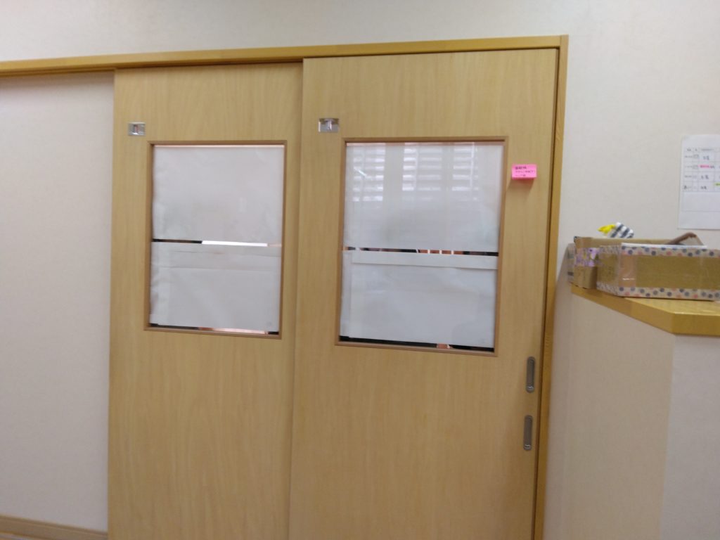 朝、登園した子どもたちはいつものように遊んで、午前寝が必要な子どもたちは短い睡眠をとります。その間に保護者の方が来て目張りされているお部屋を覗きます。