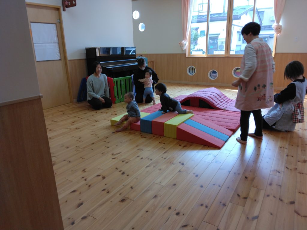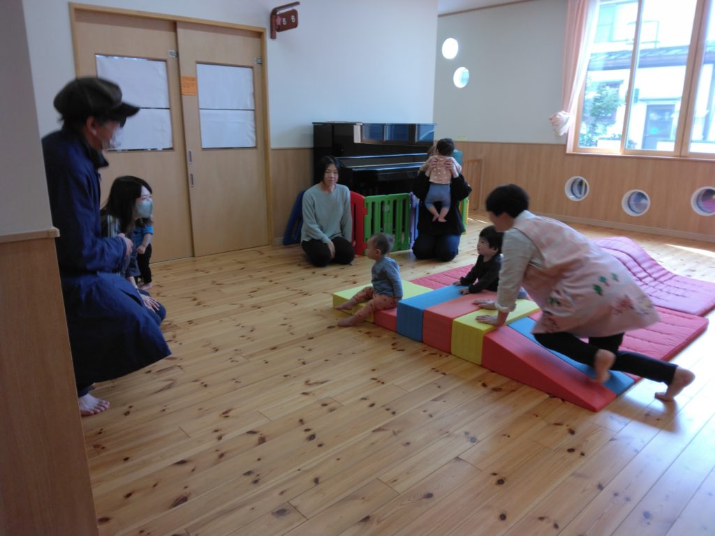 そして、今日は小ホールで遊びました。その様子を保護者の方に見てもらいました。