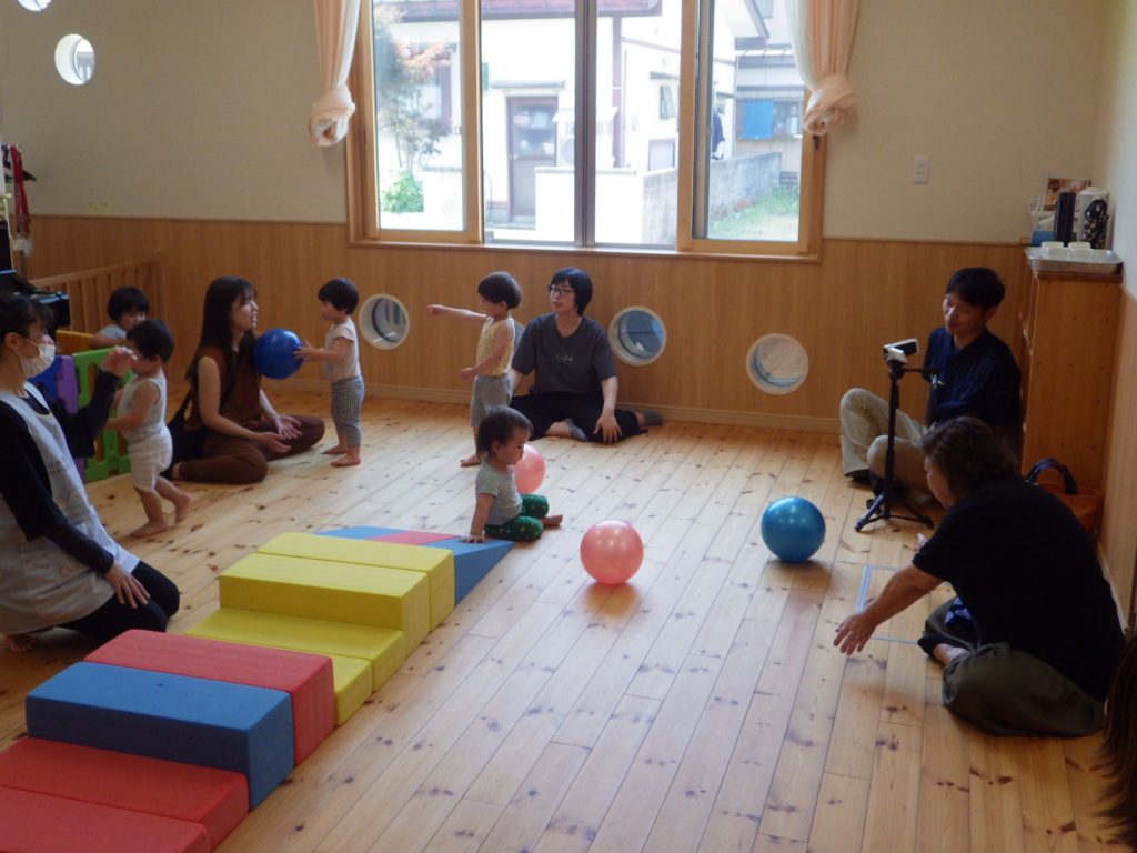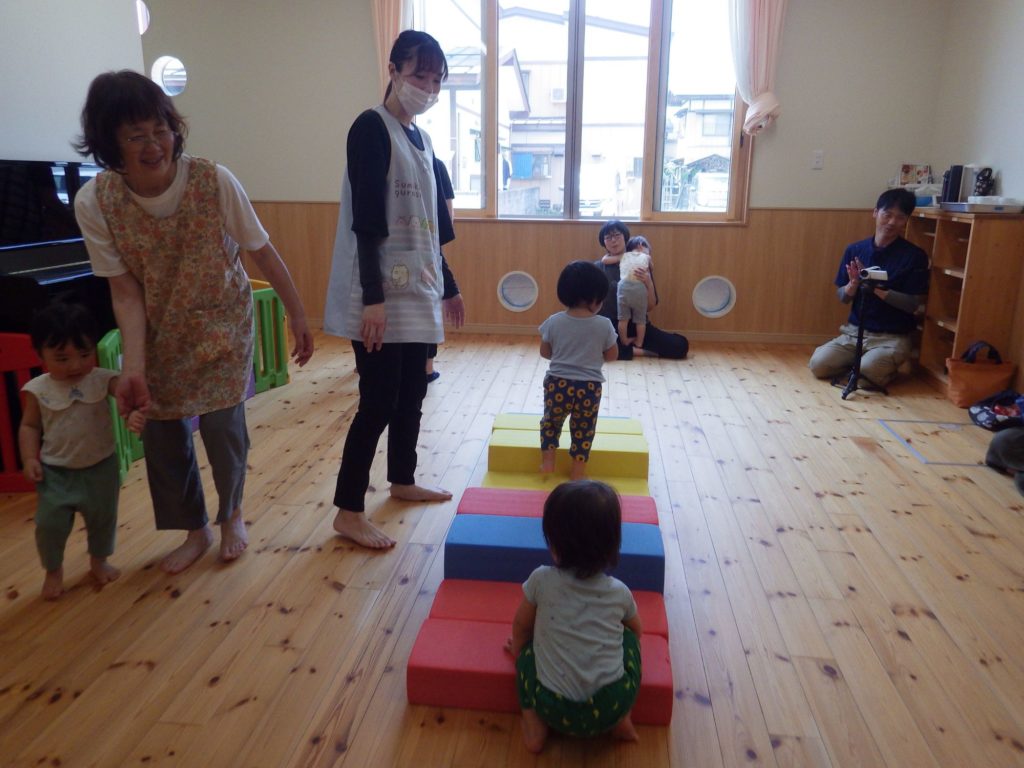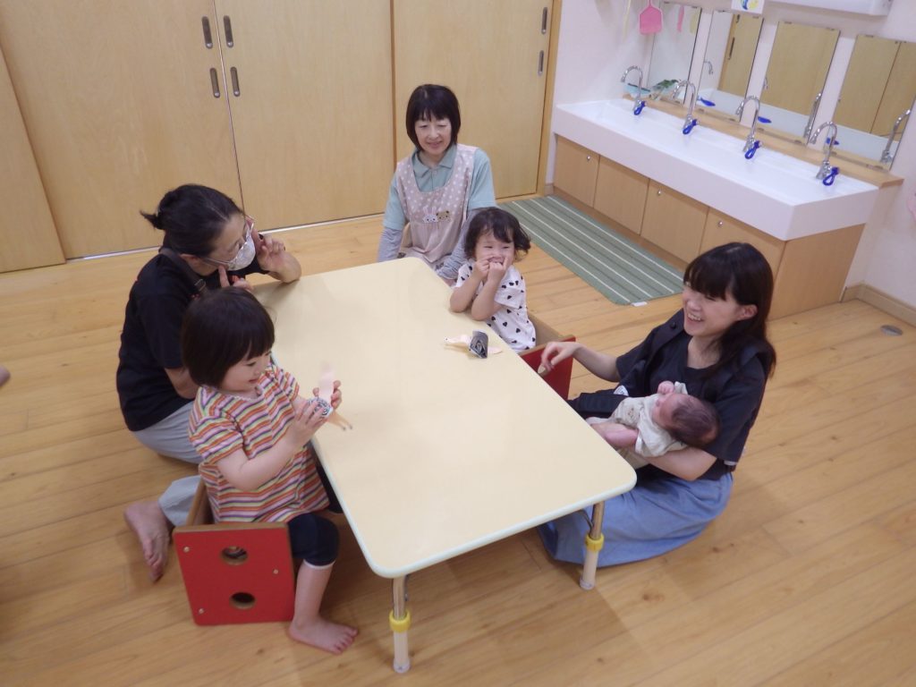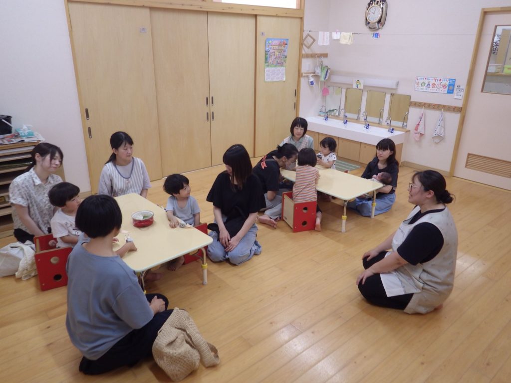 保育参観(未満児) 2025.06.20 最初はお部屋のガラスに貼られた紙の隙間からお子さんの姿をこっそり覗いて見てもらいました。 途中からはおうちの方にも一緒に入ってもらい、もも組はお部屋でシーツブランコやわらべうたなどをしました。 すずらん組は小ホールで体を動かして楽しみました。 ひまわり組はお部屋でかたつむり作りをおうちの方と一緒に楽しみました。 遊んだ後は各クラスで懇談会もしました。お子さんと一緒におうちの方の顔を見ながらよい時間を過ごせました。