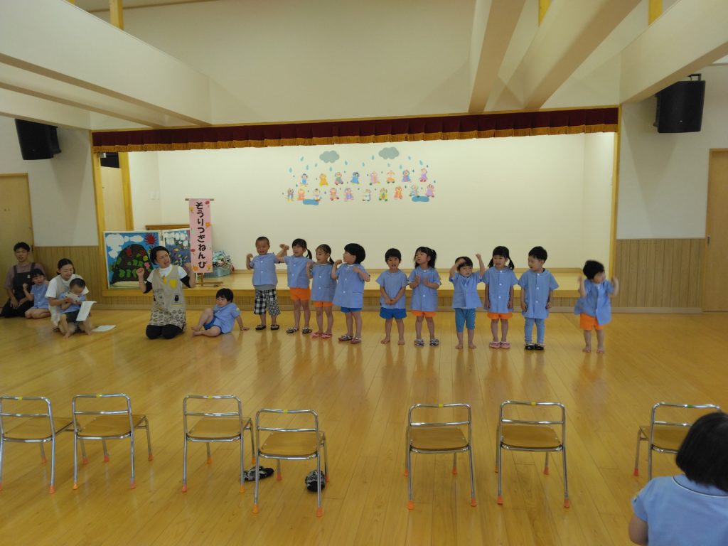 雑巾を使って椅子や床も綺麗にしていました。掃除が終わると遊戯室に集まってみんなでお祝い会をしました。