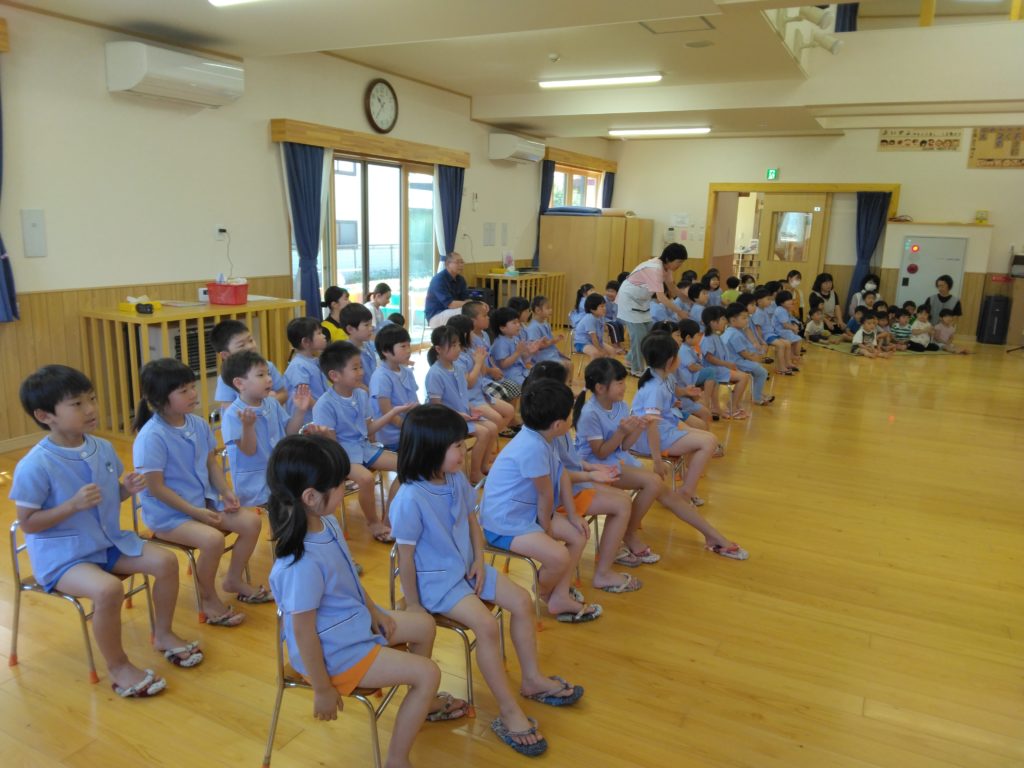 園長先生のお話ではアメリカから宣教師のクレーグ先生が来て教会を建てたことやこひつじを建てたことなどをお話をしてくださり、子どもたちは静かに聞いていました。