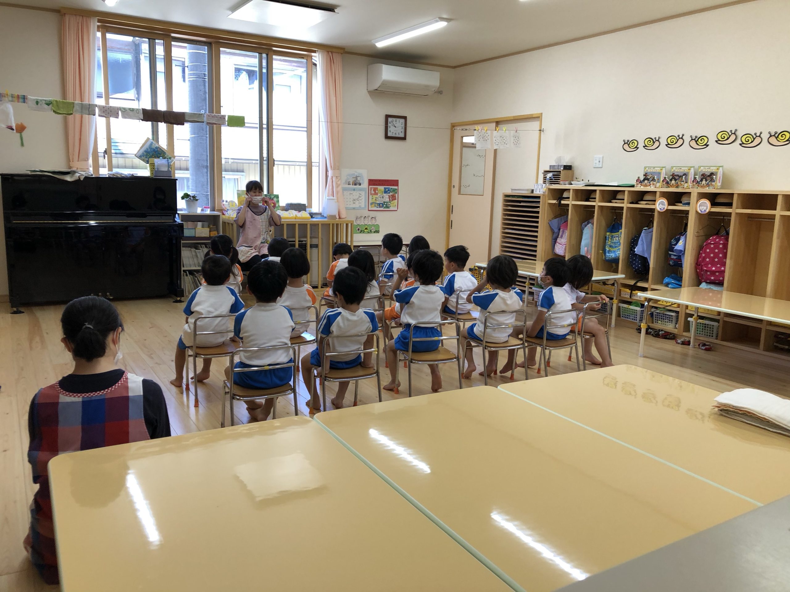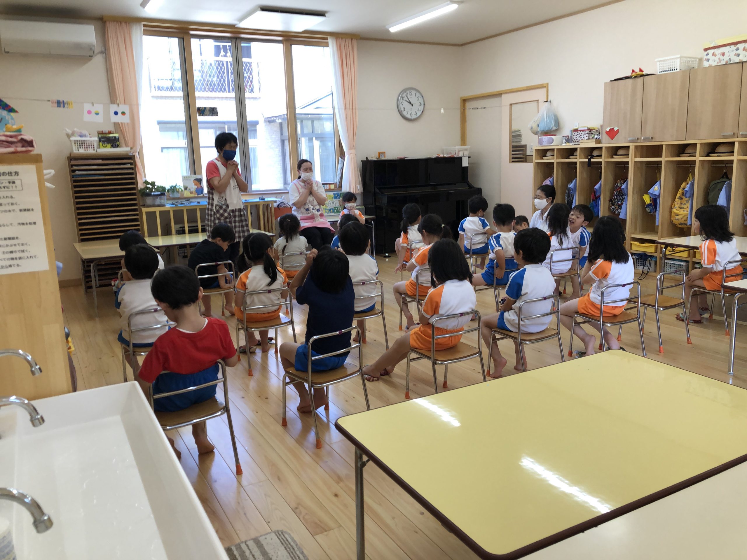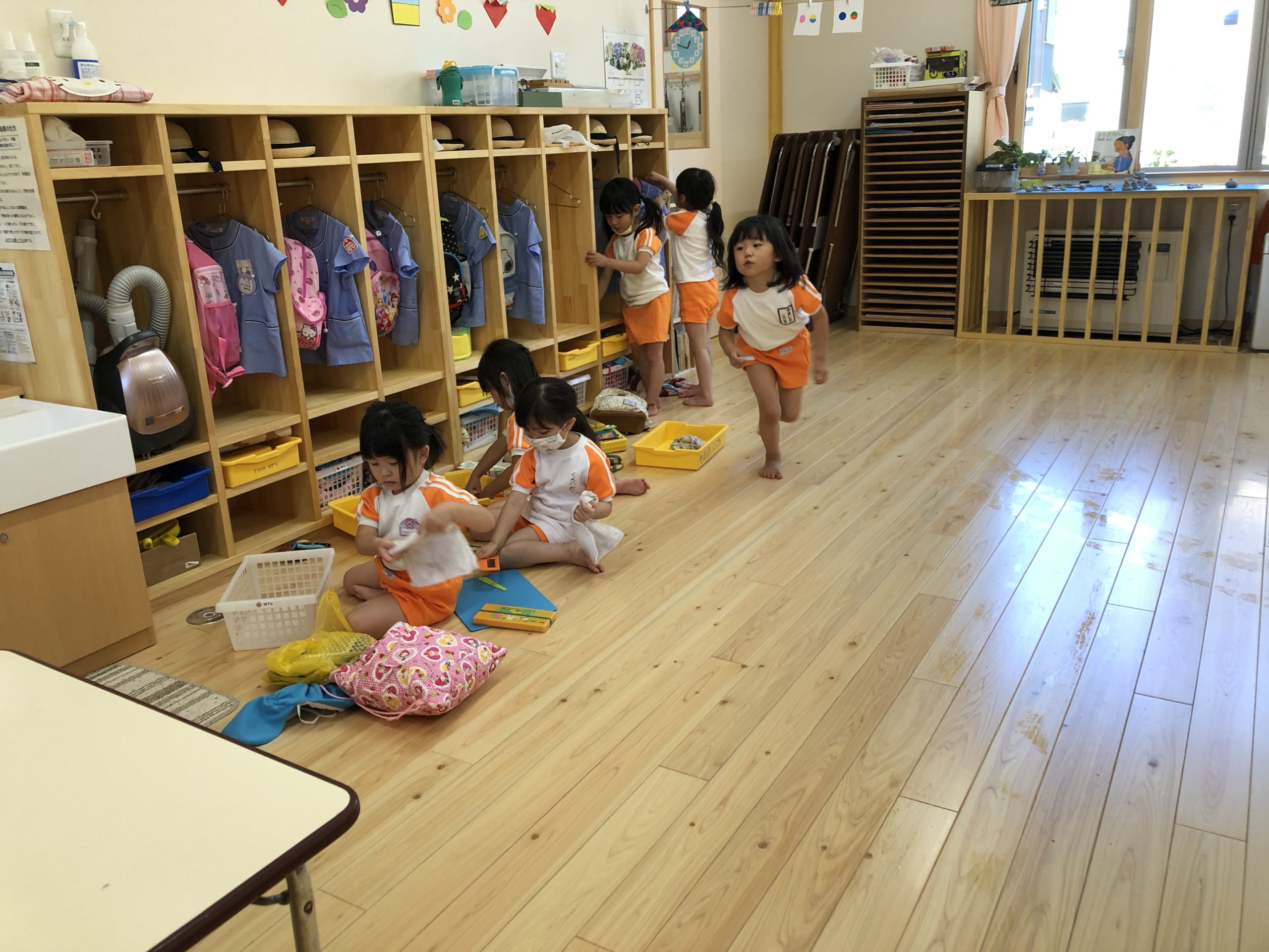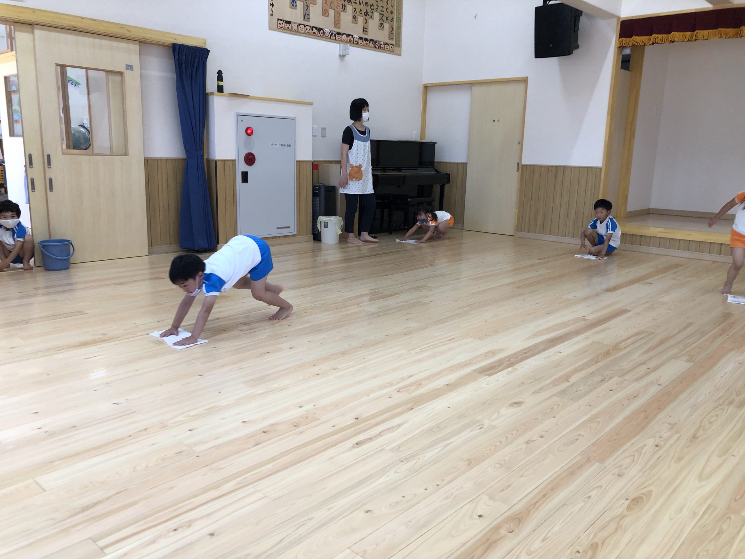お話の後は以上児クラスの子どもたちはお部屋の棚、廊下、遊戯室などをきれいに掃除をしました。