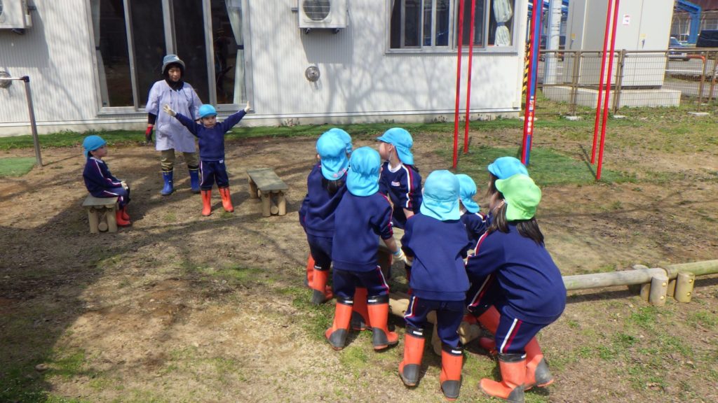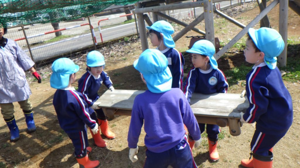 11日(木)に、ゆり組さんが園庭に平均台やテーブル、ベンチなどを出してくれました。大人が持つのも大変なくらい、とても重いのですから1人では運べません。そして、友だちのことも考えながら動く必要があります。そんなこともあり、いろいろな声があちらこちらから聞こえてきました。