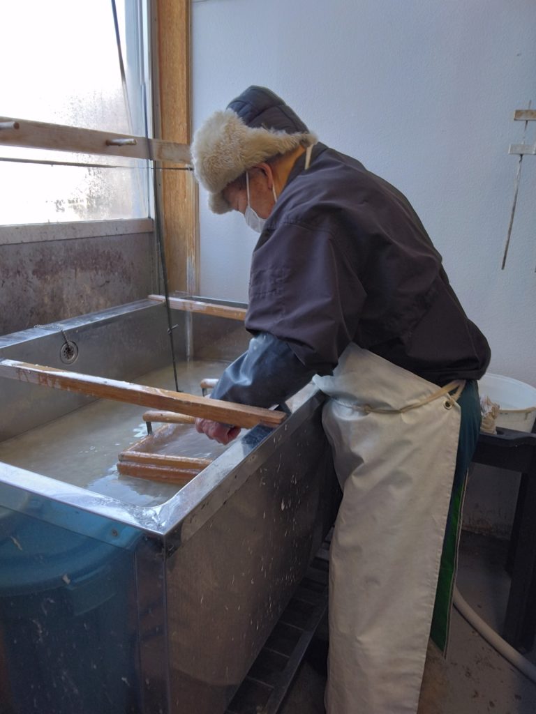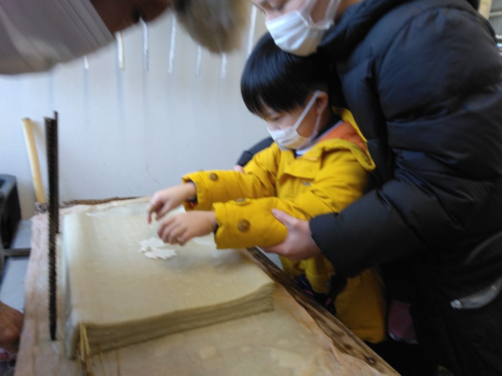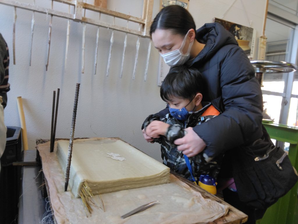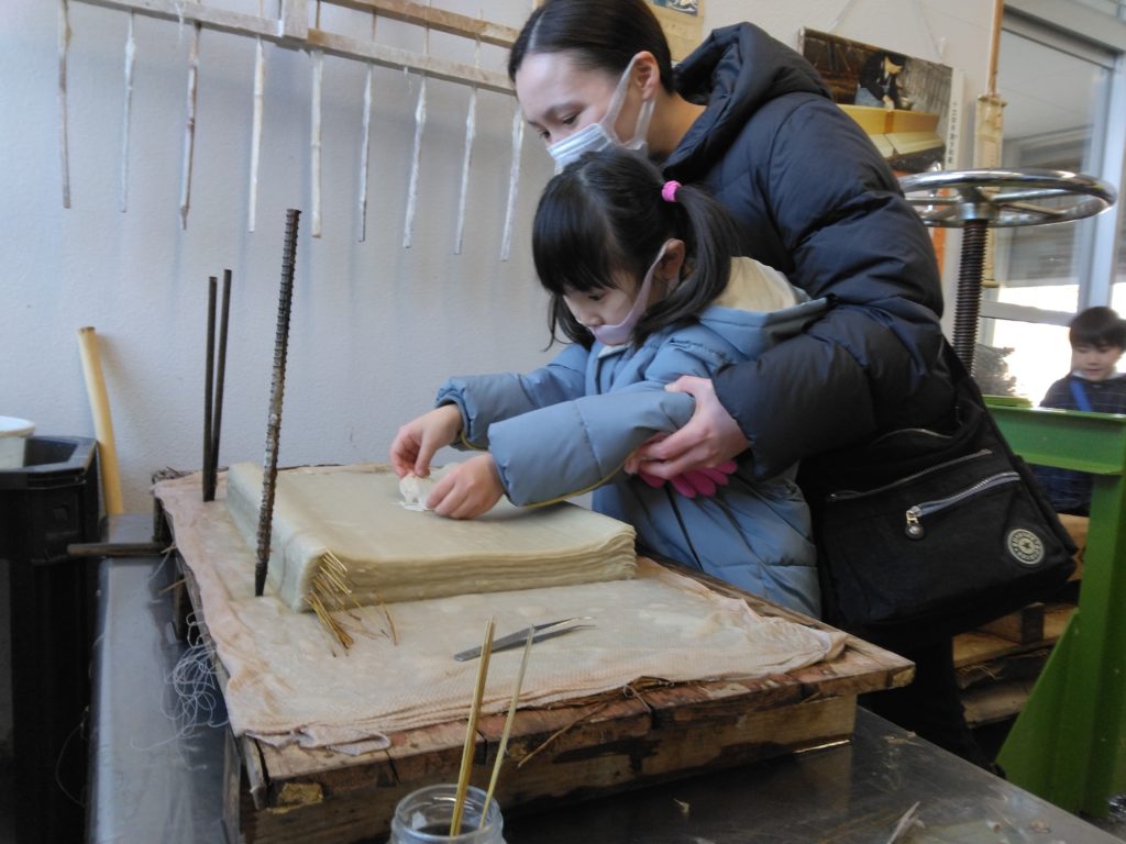 すいた和紙は柔らかで何かが触れたりすると穴が空いてしまいます。子どもたちのジャンパーの袖などにが振れないように気を遣います。