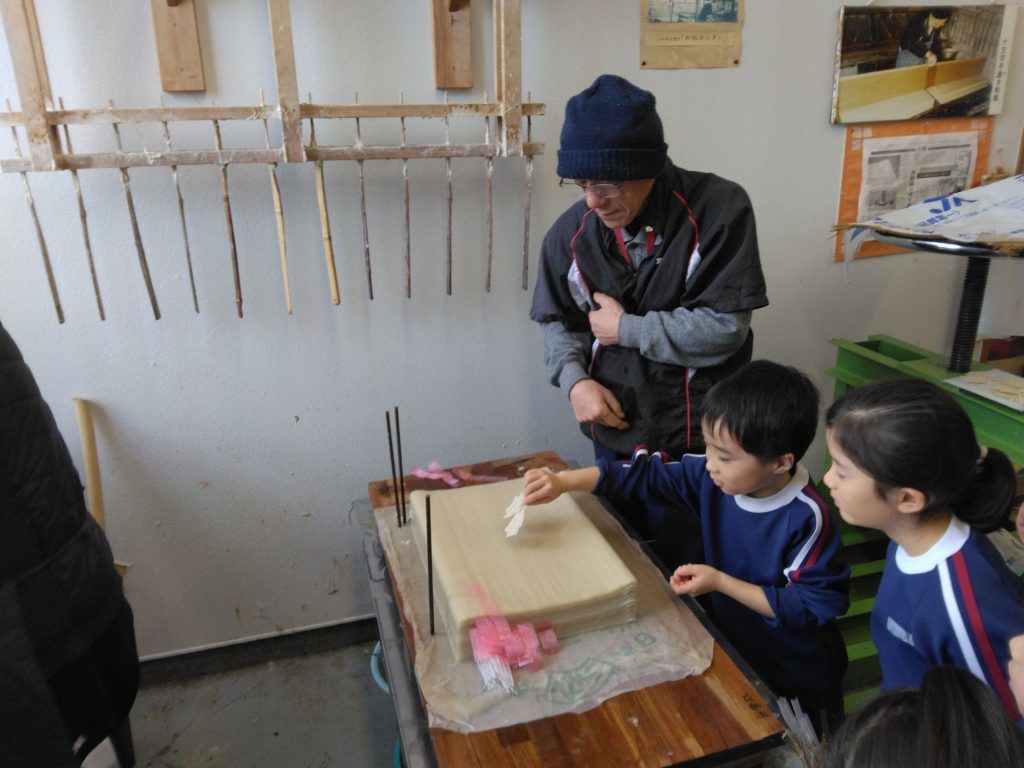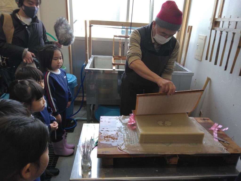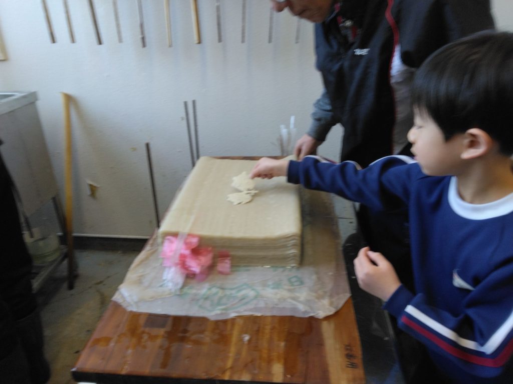 卒園証書作り 2025.01.27 今日年長さんは西地区交流センターに行って、卒園証書作りをしてきました。 二百年以上前から続く伝統的な手作業によって作られている十文字和紙です。 その和紙で作った園のマークを子どもたちは紙漉をした上にそっと乗せる作業をしてきました。 素敵な卒園証書が出来上がりますように…。