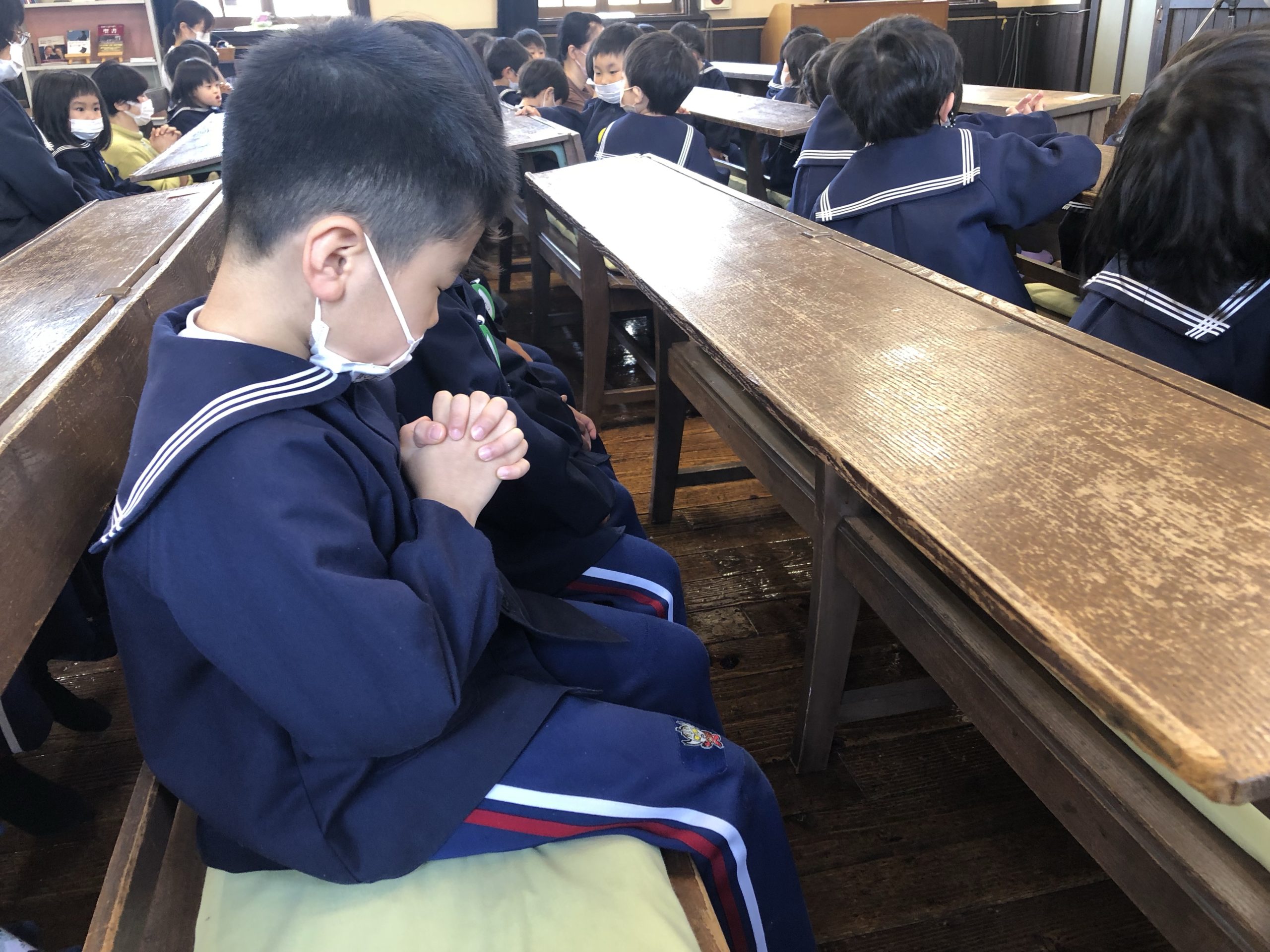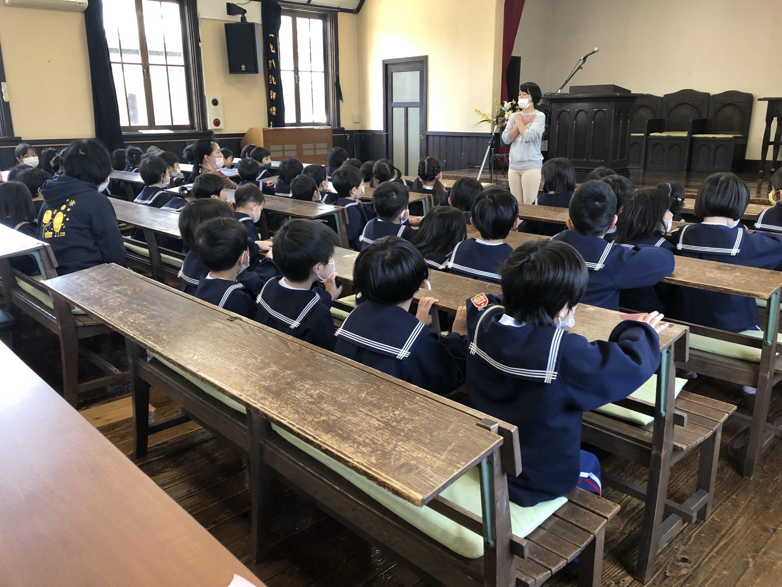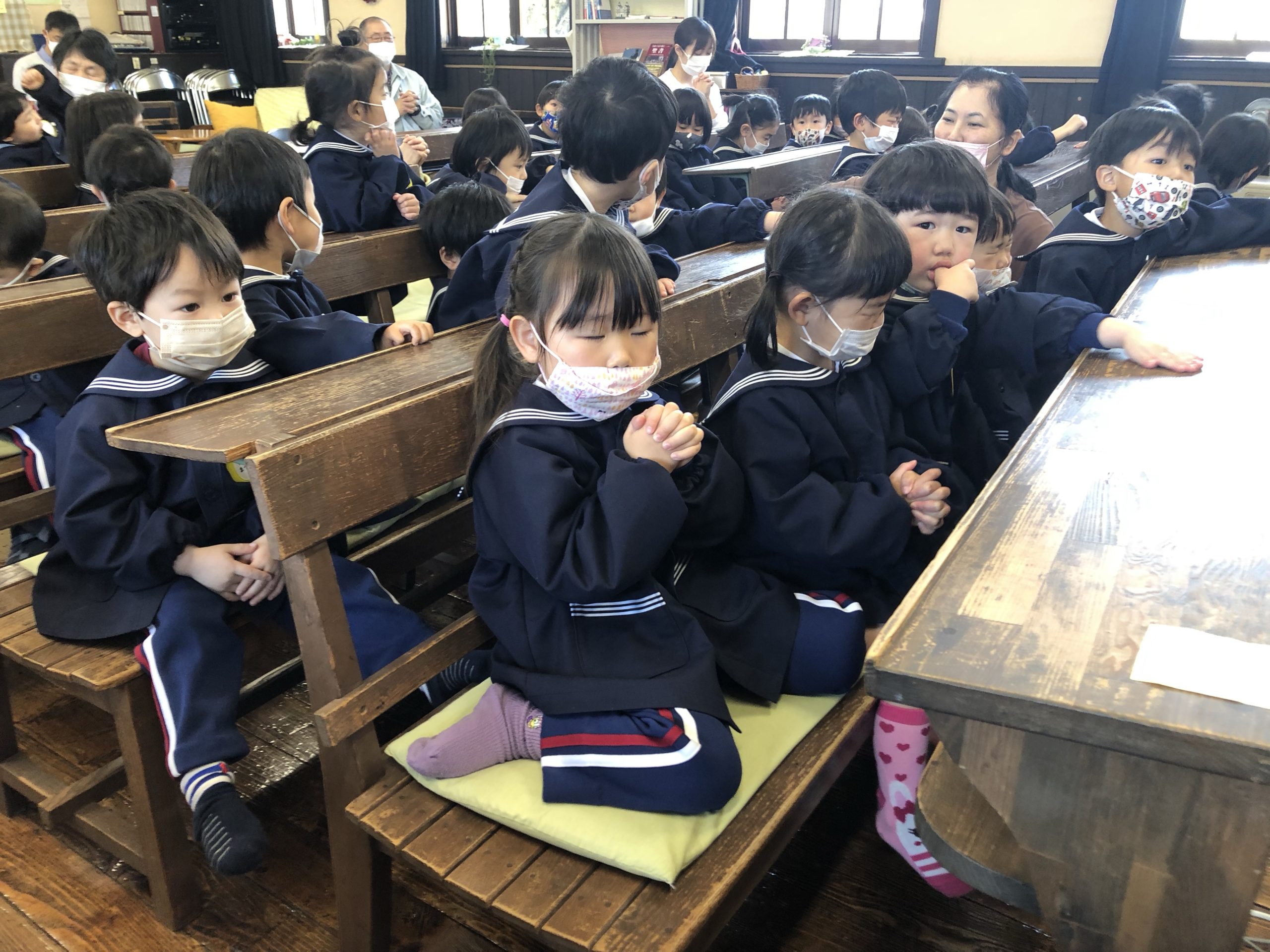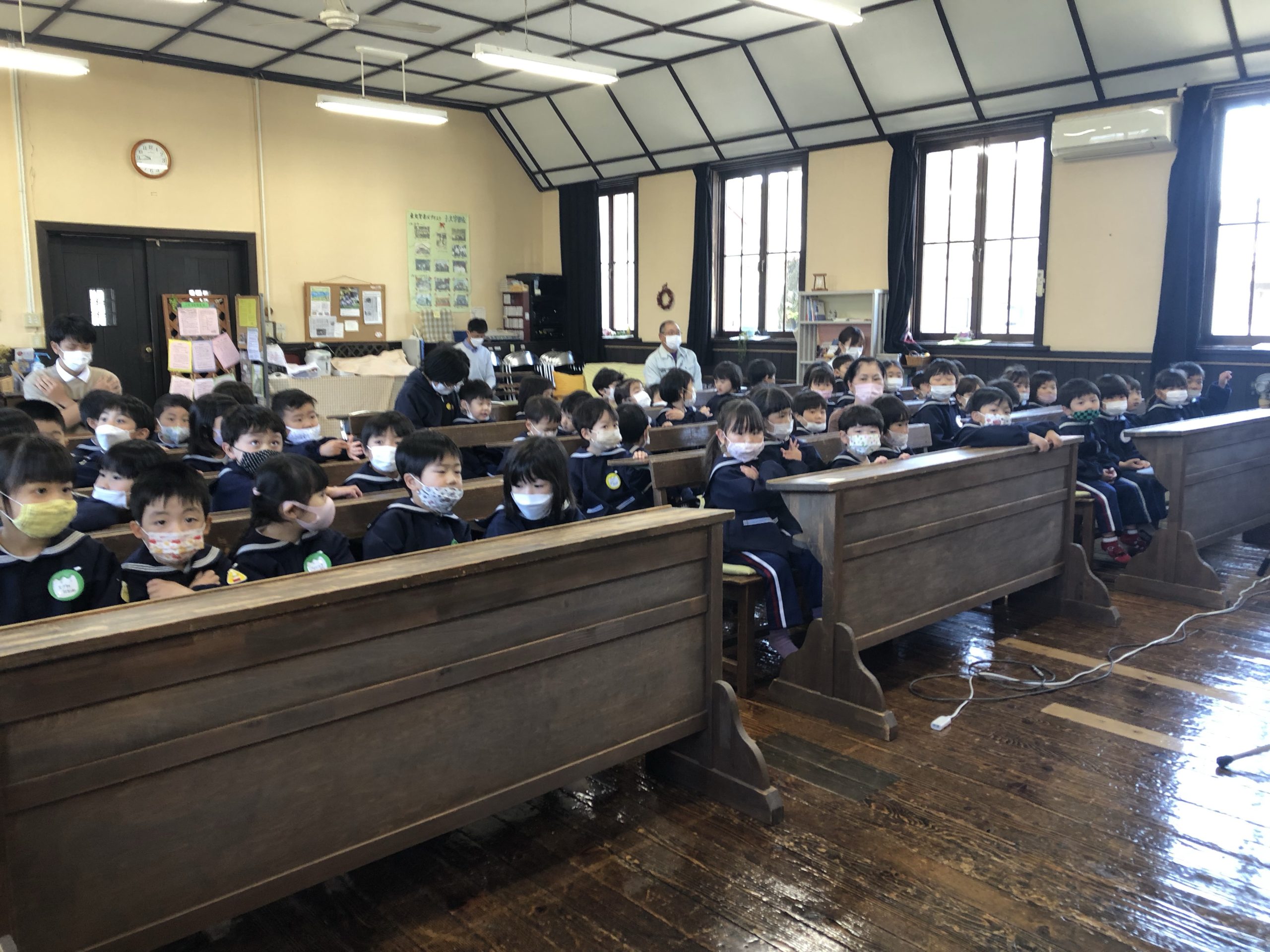 合同礼拝 2022.04.28 久しぶりで合同礼拝をチャペルですることできました。旧園舎の時はチャペルと園舎が渡り廊下でつながっていたので礼拝はいつもチャペルで行っていました。 新園舎になってから久しぶりのチャペルでの礼拝に初めてチャペルに入る子どもたちの表情はここはどこ?なに?と、不思議そうな顔をしていました。 聖書のお話を聞く時の子どもたちはとても静かにお話を聞いていました。 これからもチャペルで礼拝をしていきたいと思っています。