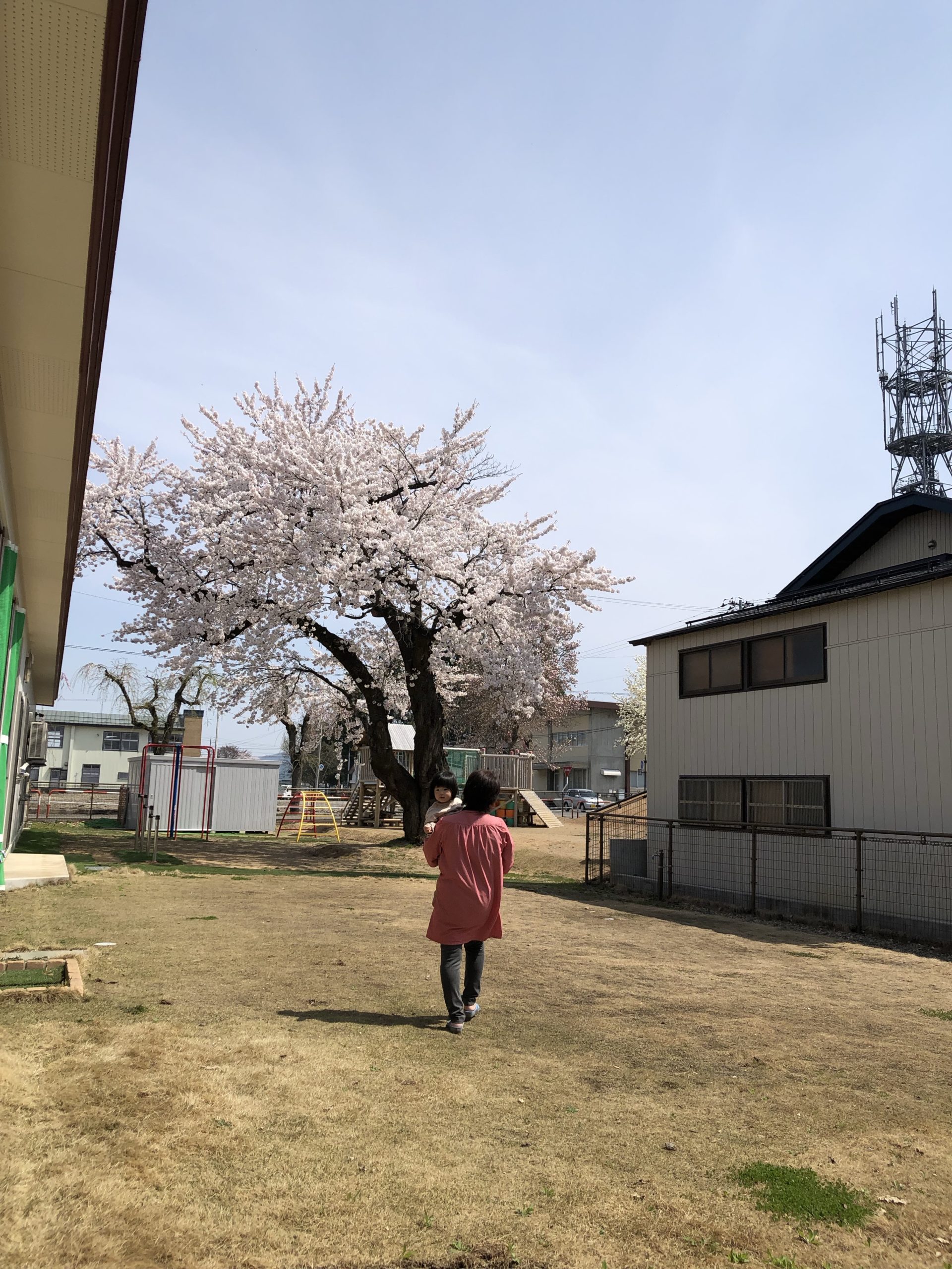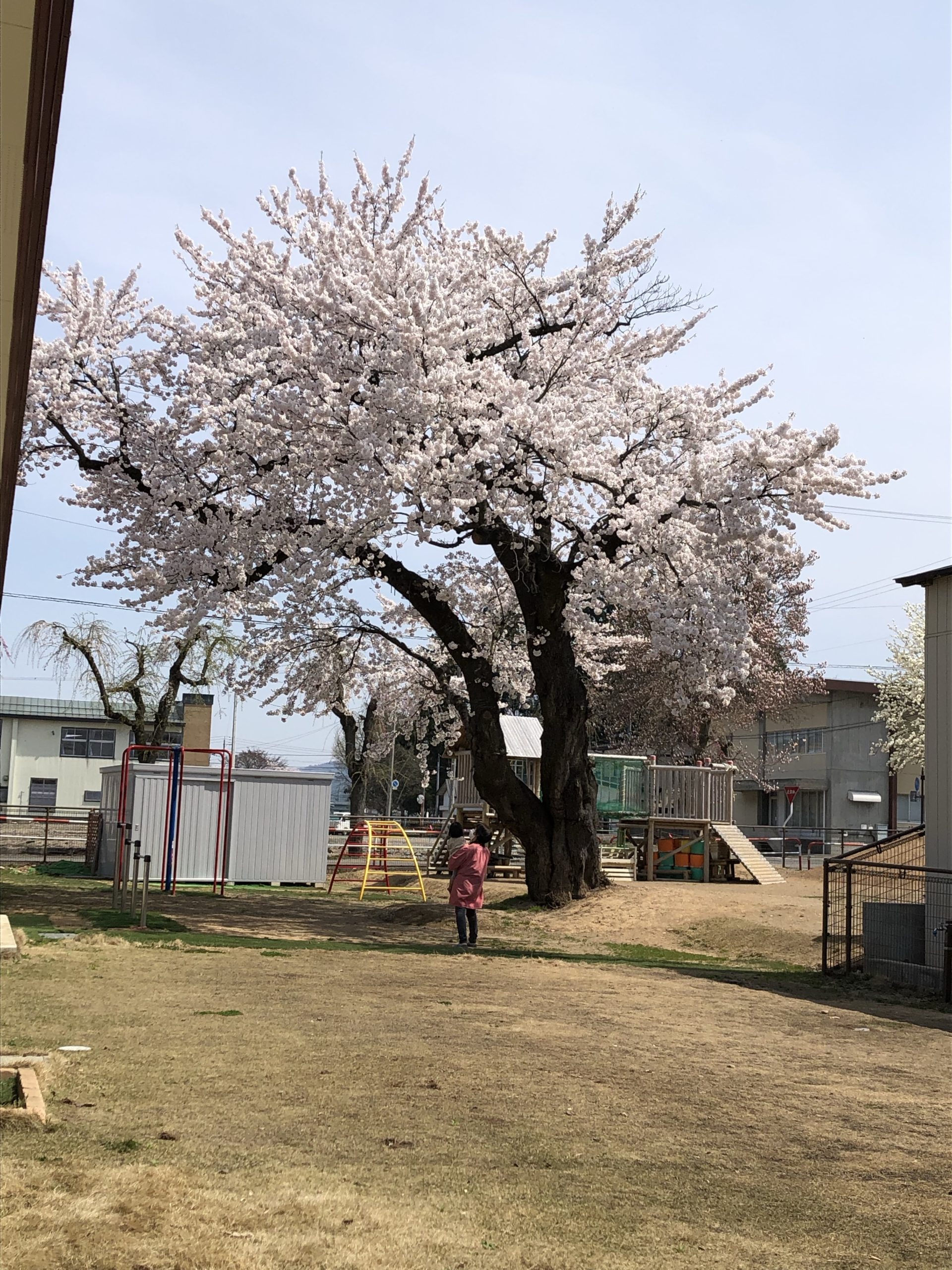 園庭を見ていると園長先生が桜の木を見上げています。