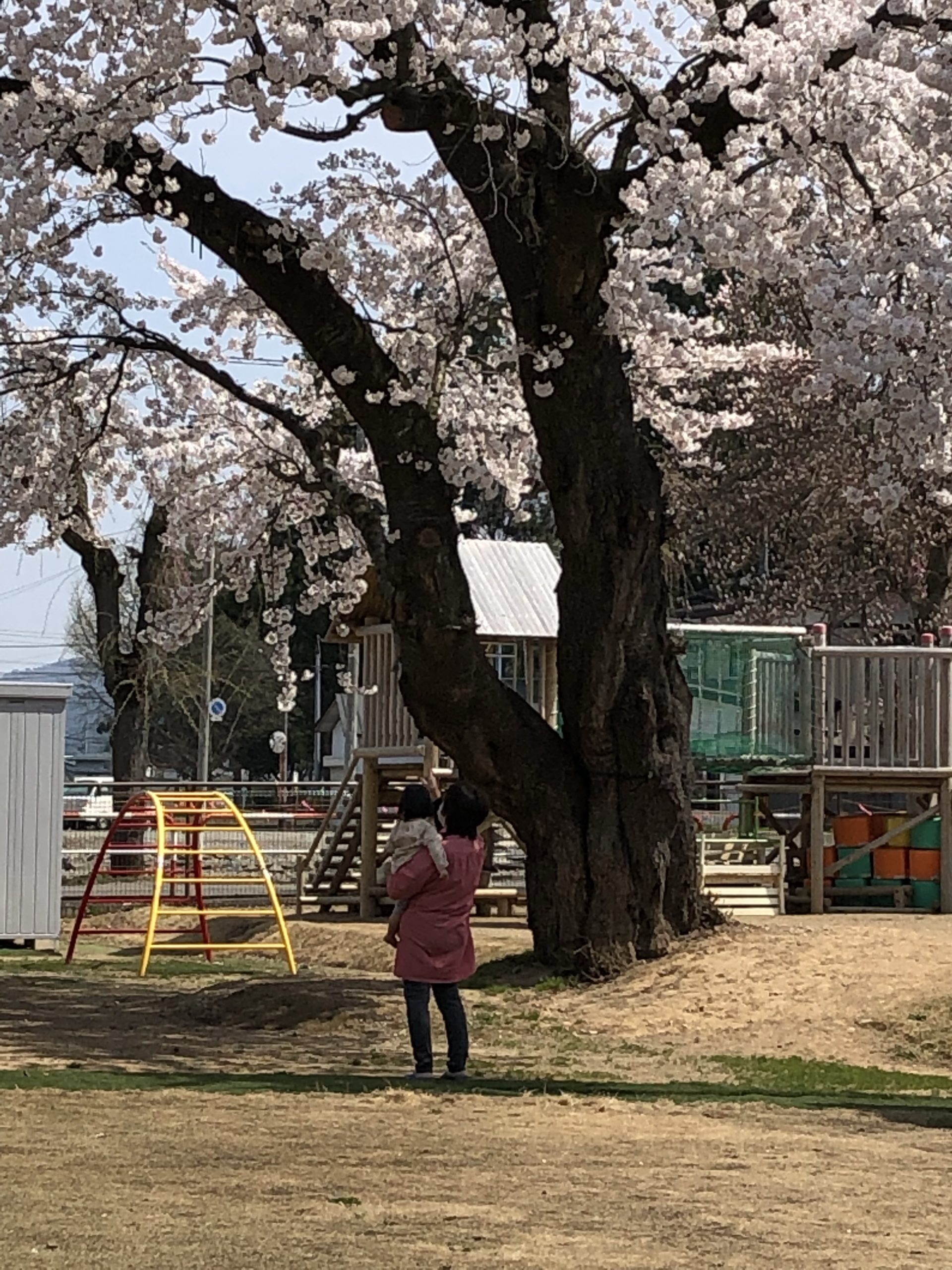 次々に園長先生に抱っこされ桜の木の下でハチの飛ぶ様子や音に耳を傾けていました。