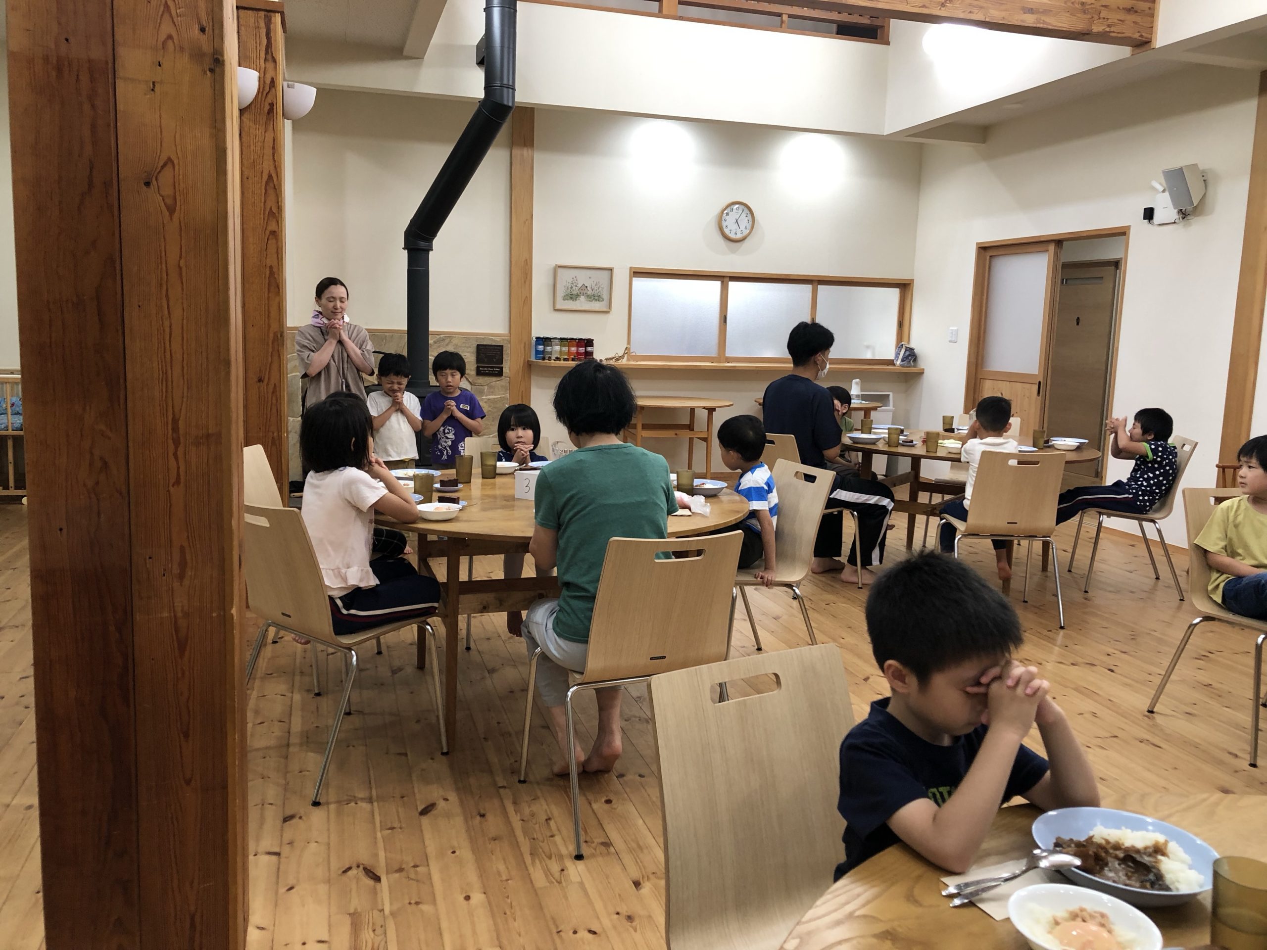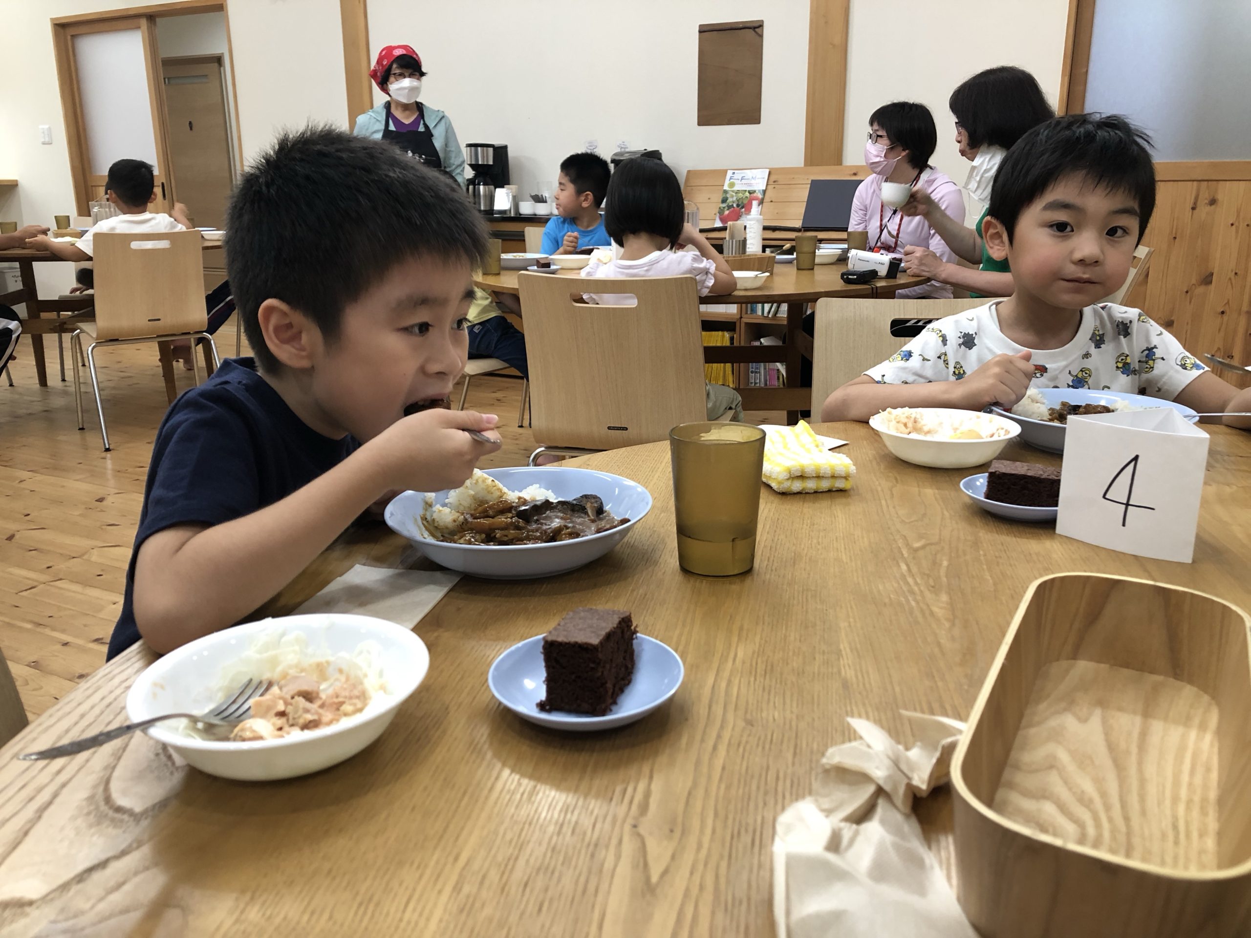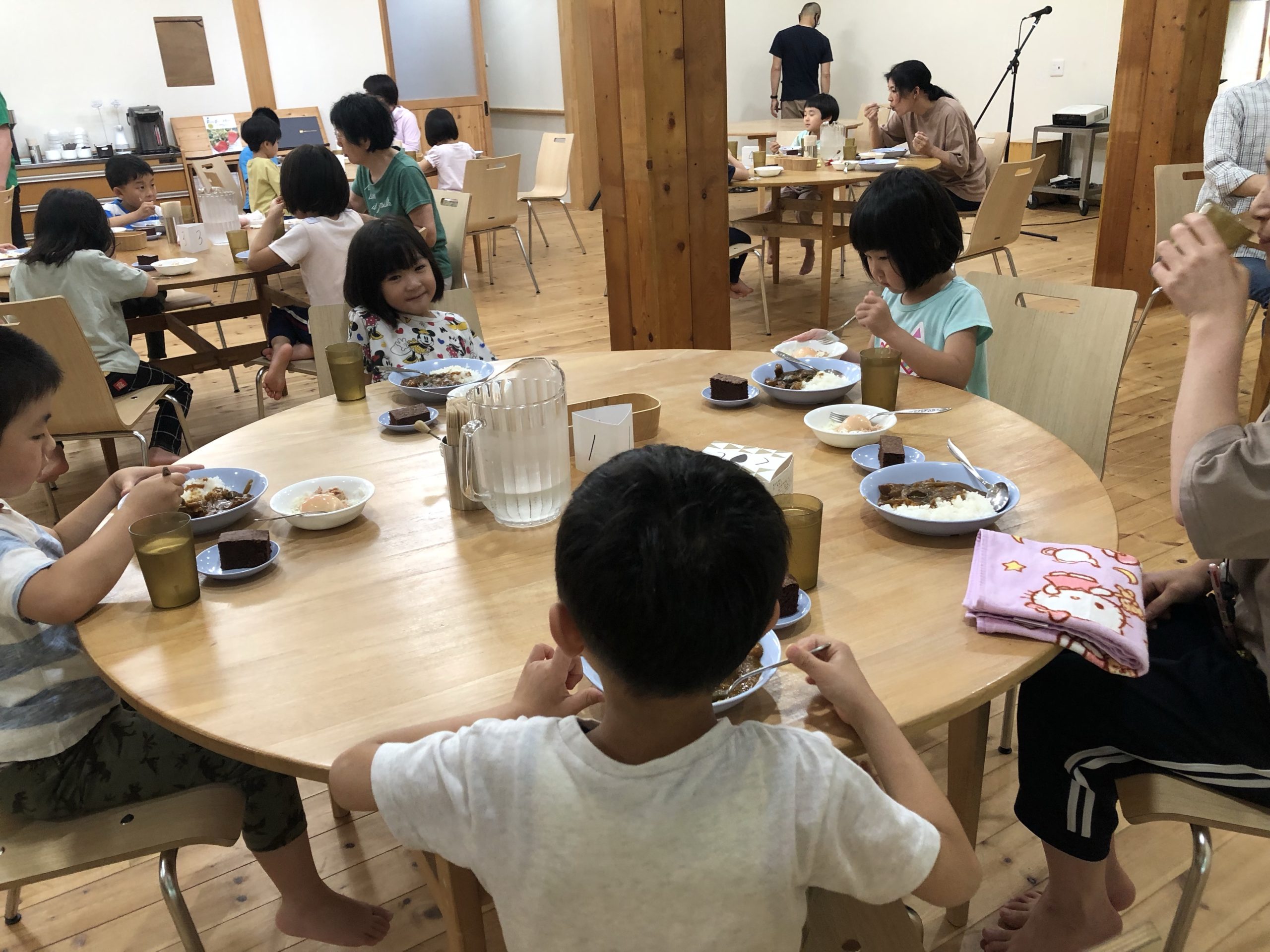 夕食(一泊キャンプ) 2022.07.15 夕食はカレーライス!! 野菜サラダとデザートもぺろり食べました!! くじを引いた番号とテーブルの番号を確認して座りました。(さすが年長さんですさっさと引いた番号とテーブルの番号を見つけていました。)