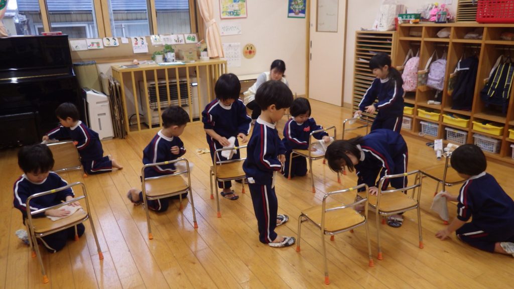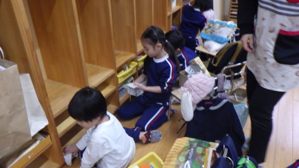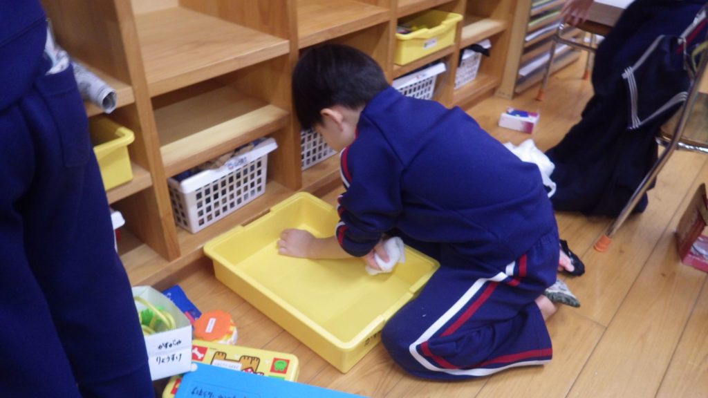 大掃除(以上児) 2025.12.24 今日は2学期最後の日、各クラスで大掃除をしました。 園長先生の放送の合図で子どもたちは張り切って掃除に取りかかりました。いつも使っている椅子やロッカー、お道具箱…雑巾で綺麗に拭いてくれました。 またみんなで気持ちよく使えますね!