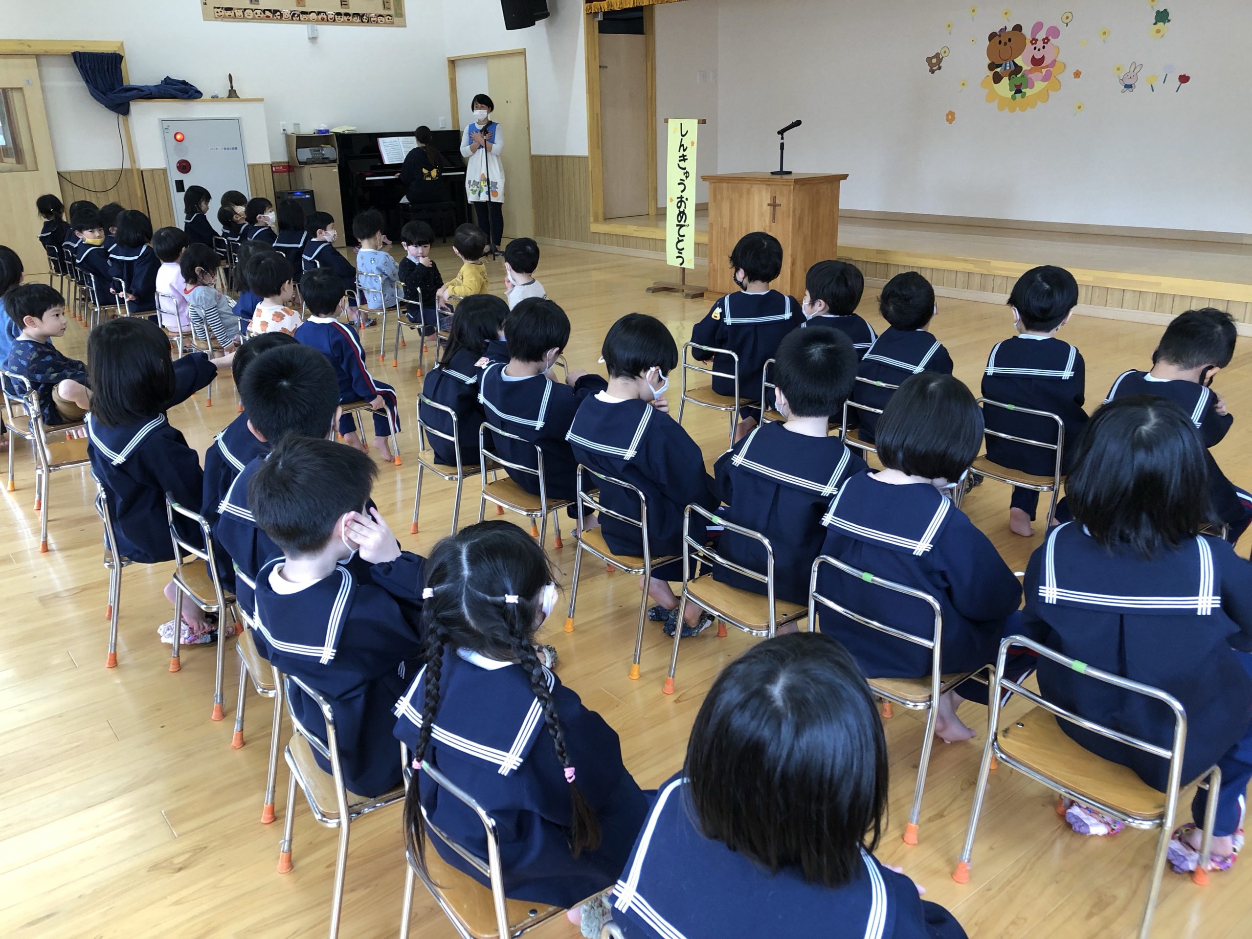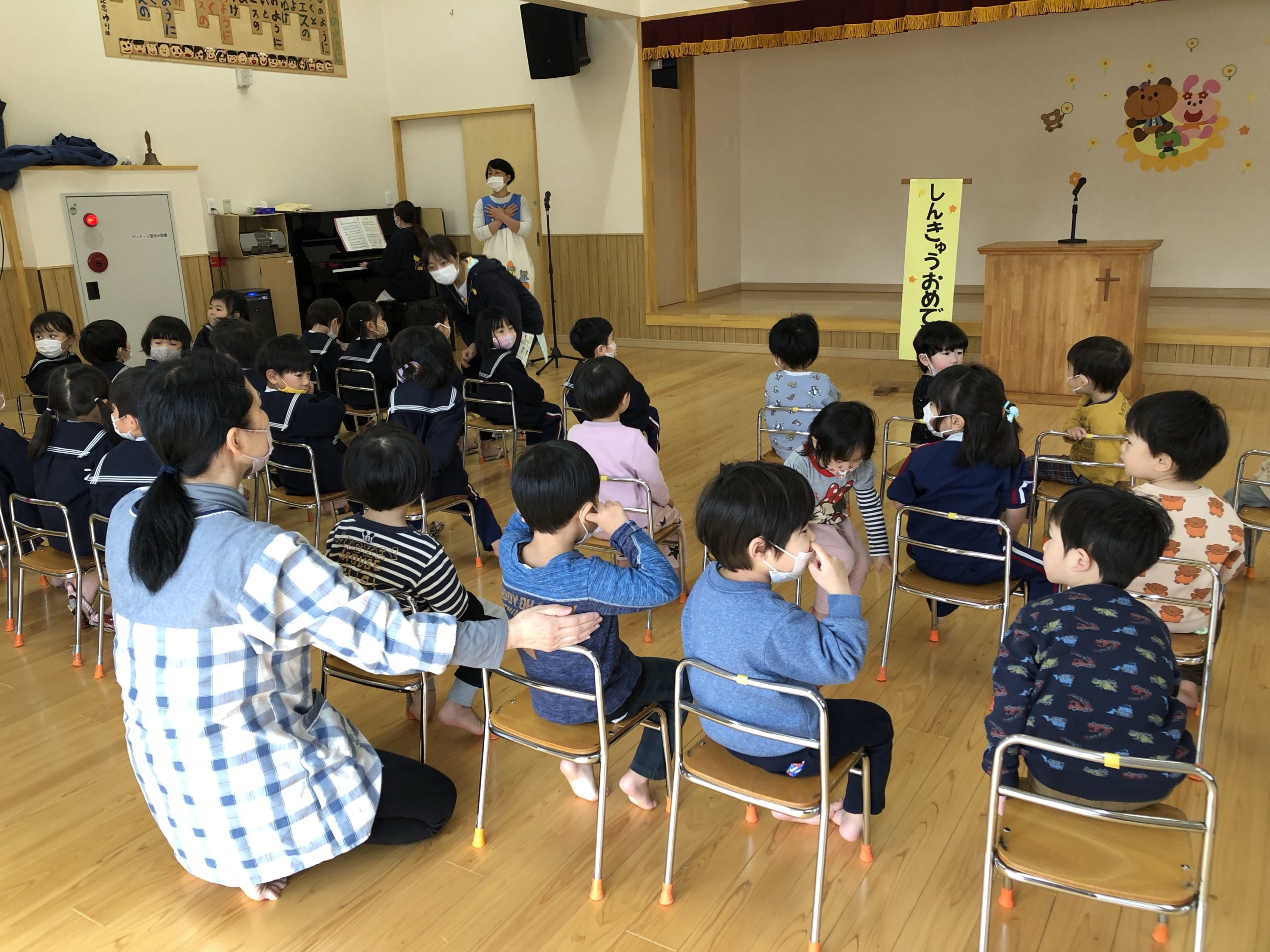 始園式 2022.04.06 今日は2022年度の始園式でした。 春休みが終わり一号認定の子どもたちも久しぶりの登園でした。 クラスがかわり、担任の先生も代わり‥ ドキドキで登園した子どもたち。 始園式では、園長先生からみなさんは神の家族なんですよ。このこひつじで家族としてみんなで助け合いながら、そしていろいろなことを神さまにお話をしていきましょう。と話されました。 2022年度の歩みも神さまの導きが豊かにありますように。