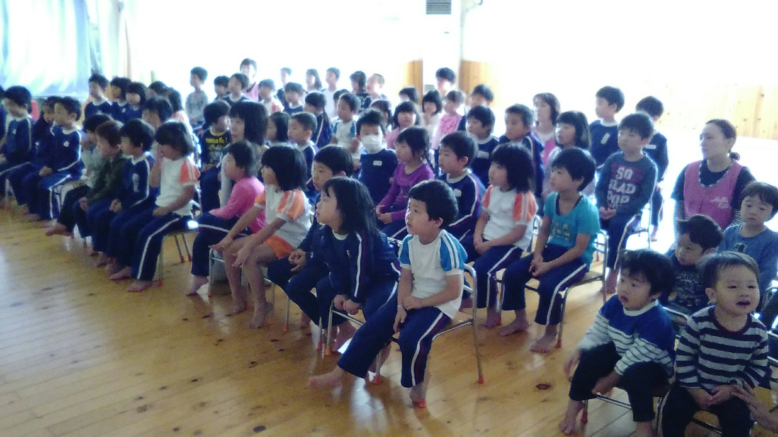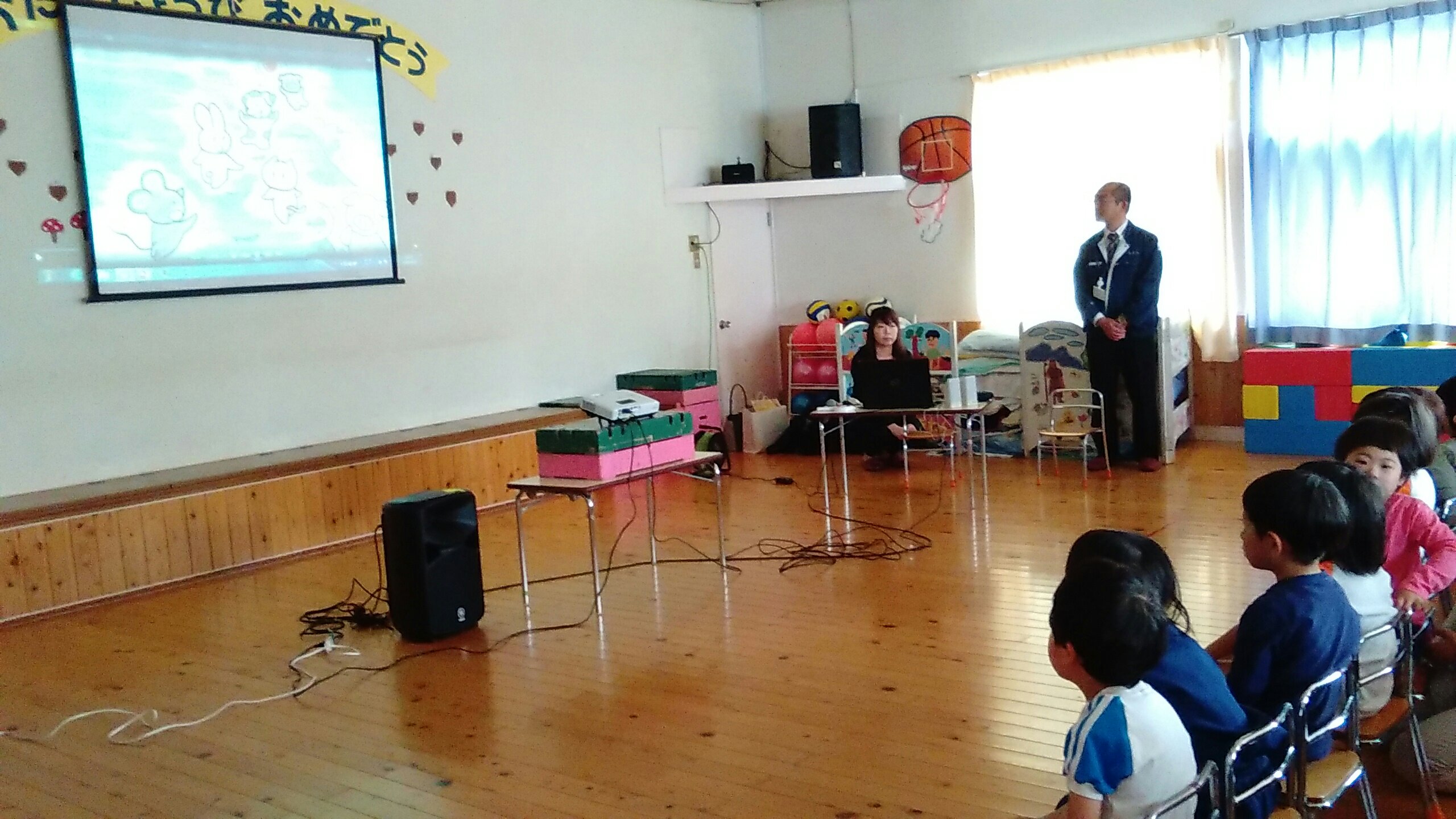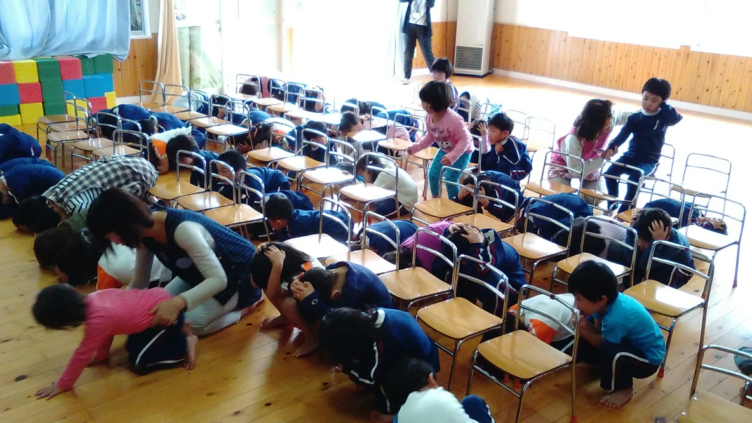 学校安全外部指導 2018.10.10 10月10日 秋田地方気象台の方をお招きして「安全指導」を行いました。 大雨、雷、地震などの自然災害について学び、もし災害が起きた時にどのような行動をとればいいのかなど、たくさんの大切なことを教えていただきました。 災害の内容によって、身の守り方や行動の違いがあり、私たち保育者もとても良い学びの時となりました。 地震が起きた時、揺れが収まるまで体を低くし、頭を守り、だんご虫のように丸くなります。みんなで練習しました!