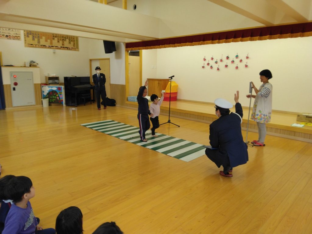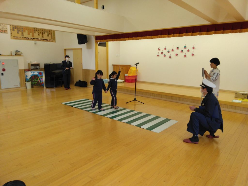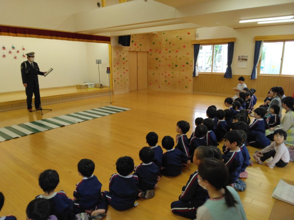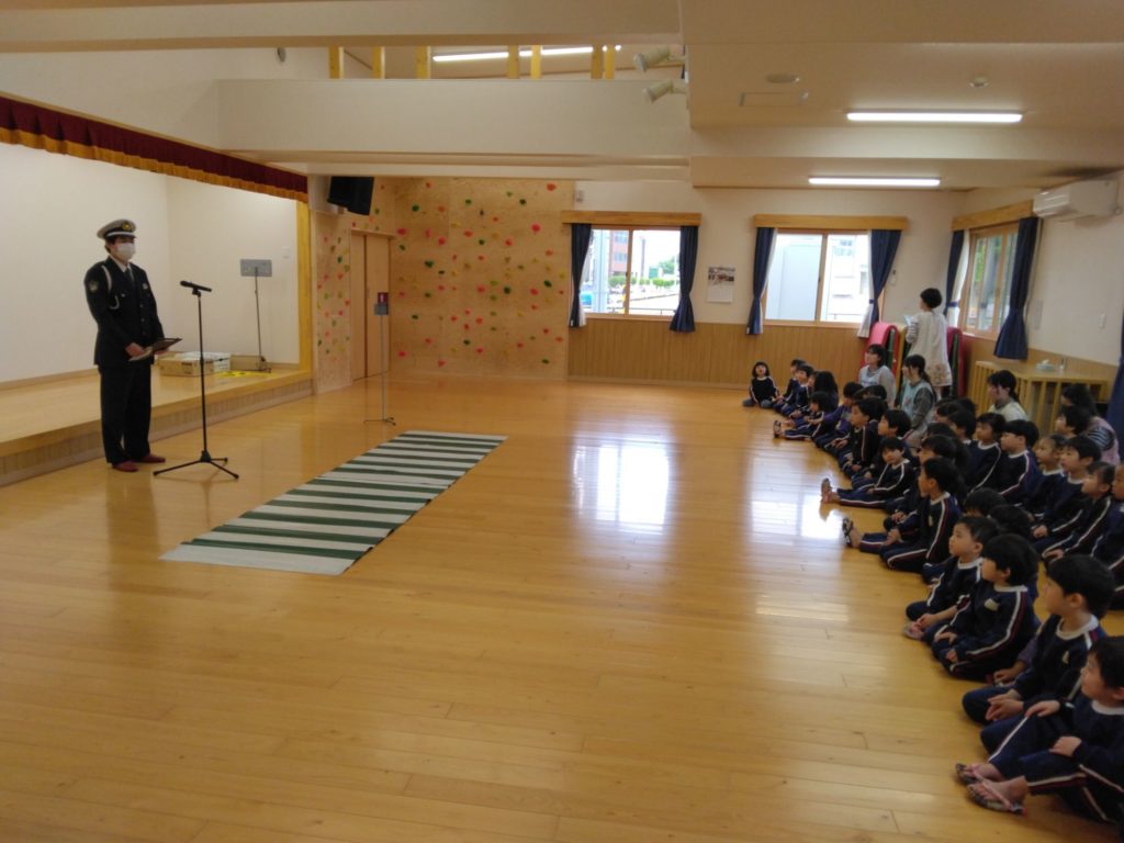 お天気が良ければ外での安全指導の予定でしたが、あいにく天気で遊戯室での指導となりました。