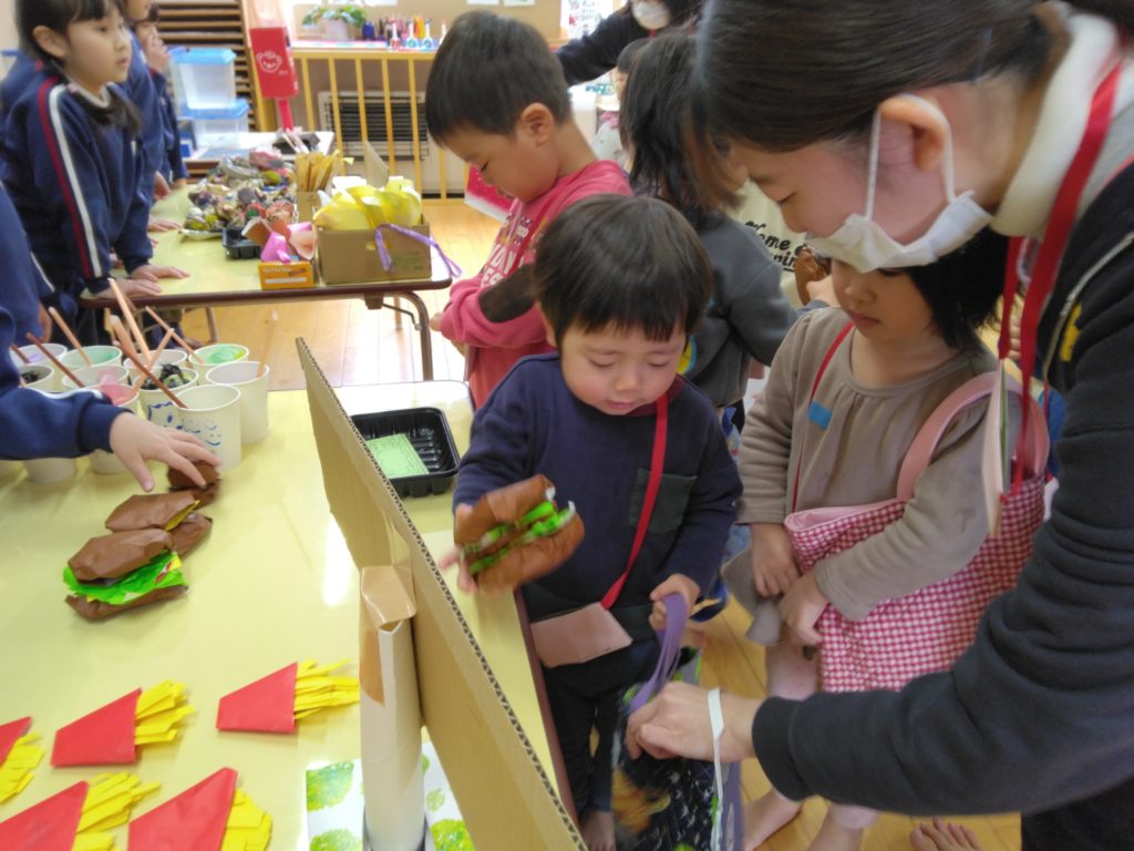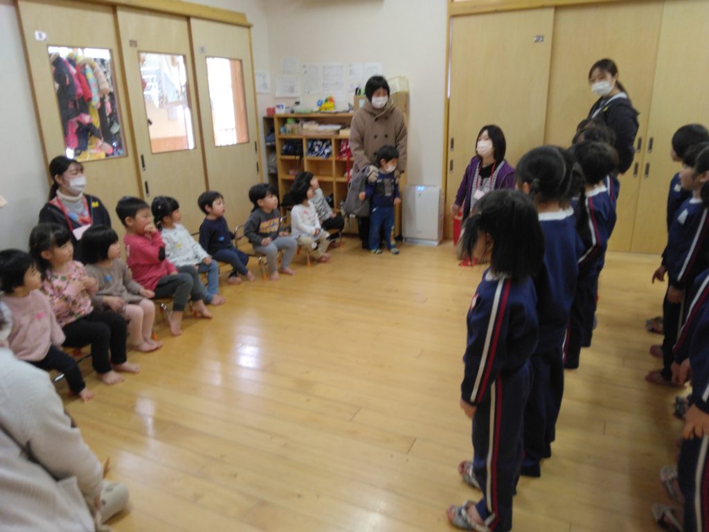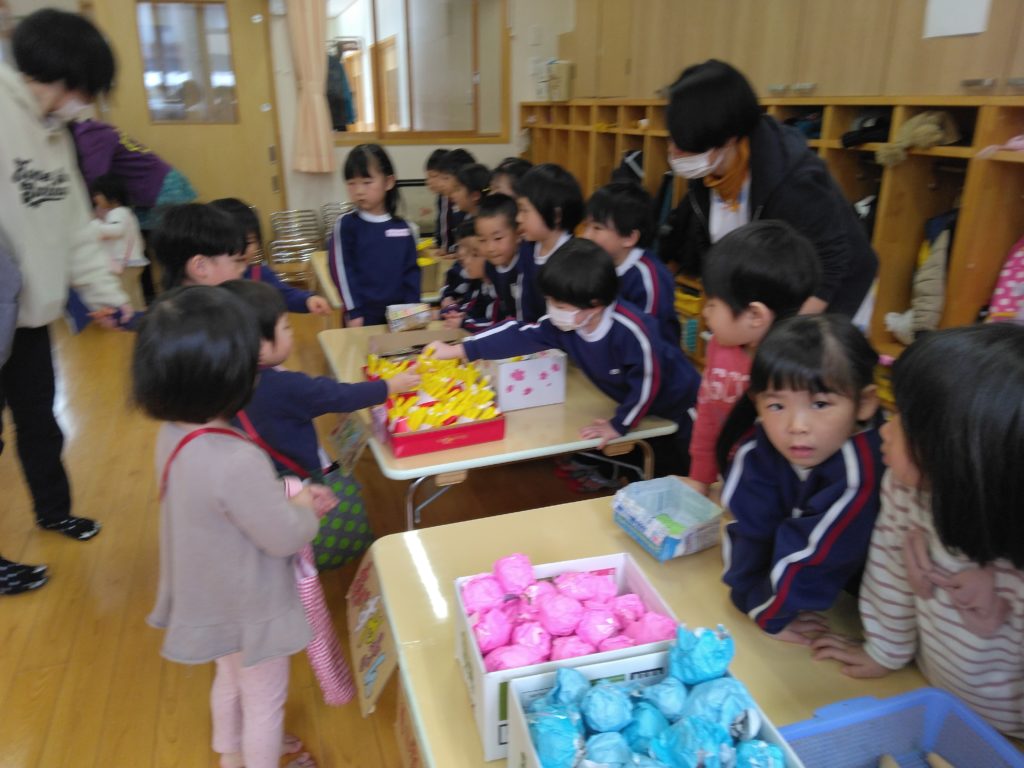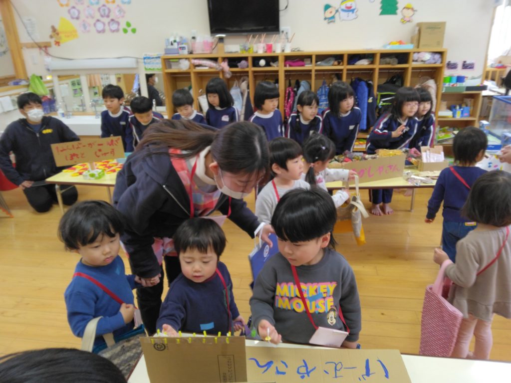宜しくね!! 2023.02.12 ひまわり組のお部屋に4月から一緒に過ごすお友だちが3人、お母さんと一緒に来てくれました。 そこに4月から年長組になるすみれ組の子どもたちが来て、「4月から宜しくね。困ったことがあったらいつでも言ってね」と伝えてプレゼントを渡してくれました。 その後、以上児クラスのお店に行って買い物を楽しみました。