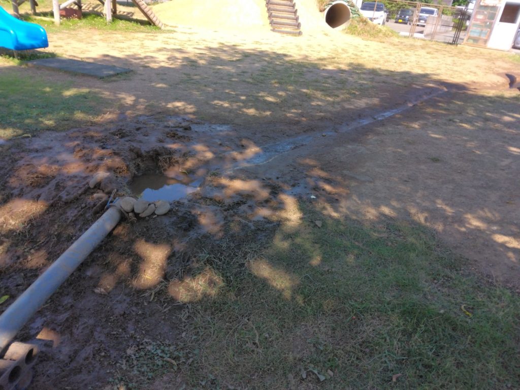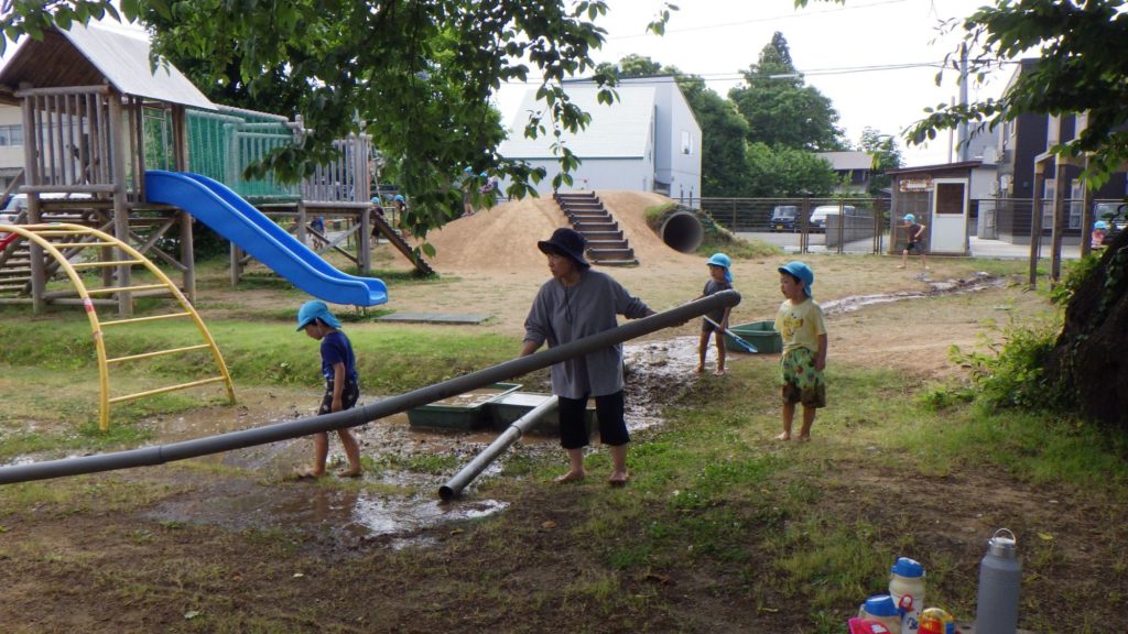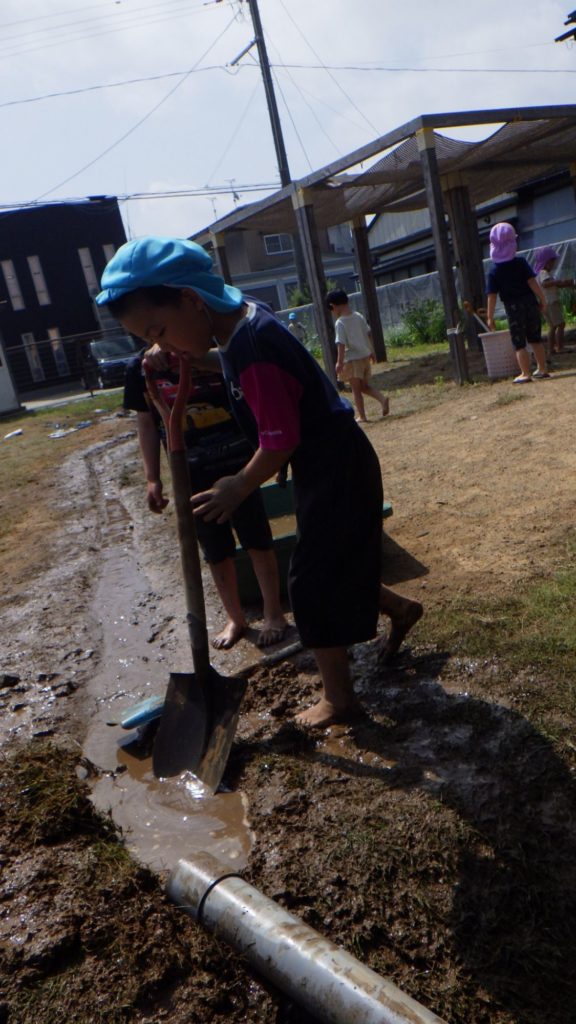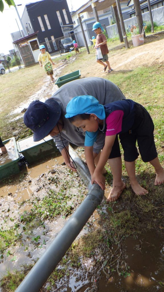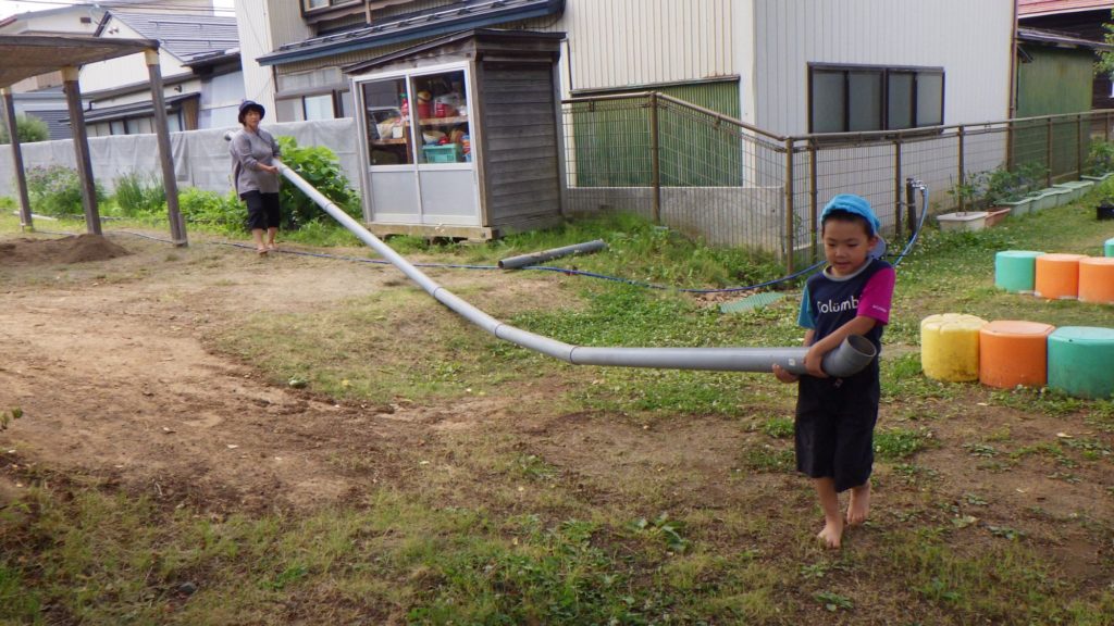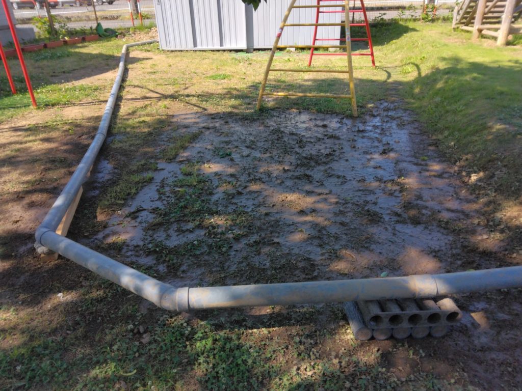 工事中!! 2024.06.14 園庭には井戸水を利用して田んぼや水遊びをしています。 その水は昨年まで園庭の端を流れるようになっておりましたが、課題が見つかり、先日から少しずつ流れる水の通り道を変えていました。今日は年長さんが園長先生と一緒に穴を掘ったり塩ビの筒を運んで設定を手伝っていました。 頼りになる年長さんです!!