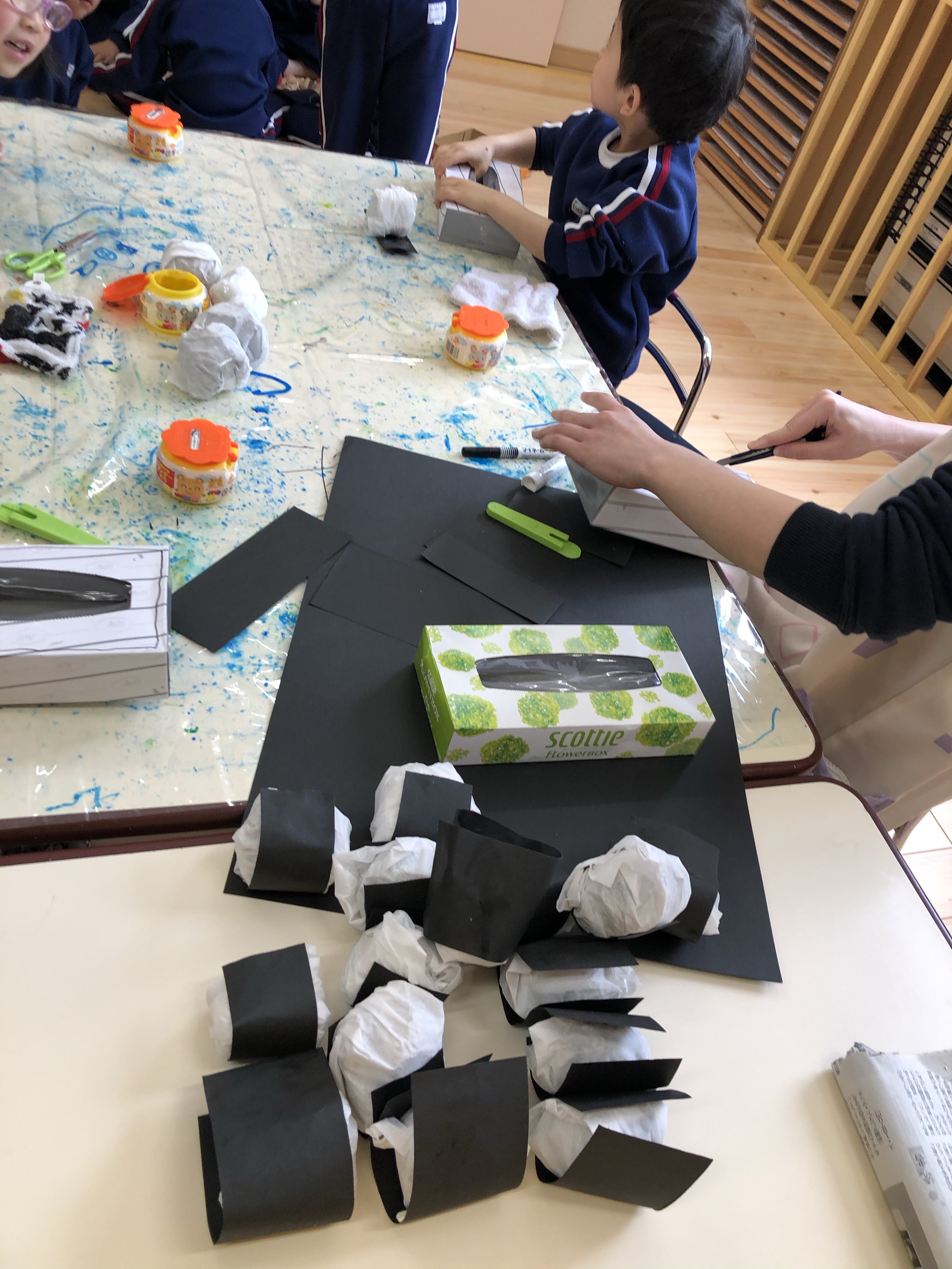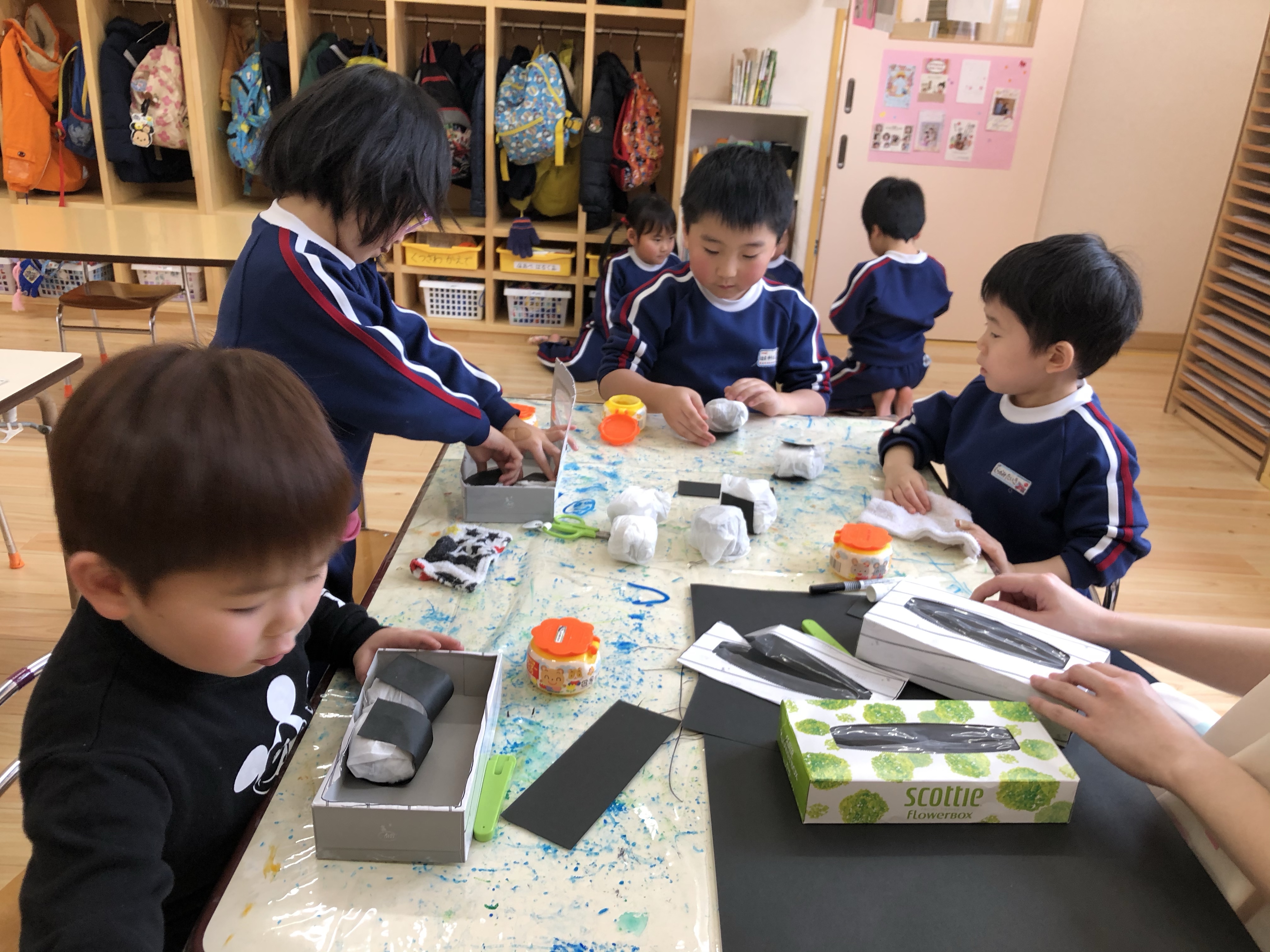 幼児期の遊びが勉強!! 2020.01.21 給食の後すみれ組さんではおにぎり作りをしている子、この間からけん玉に挑戦している子、パズルをしている子‥ みんなイキイキして目を輝かせて遊んでいます。 美味しいおにぎりを作るために海苔に見立てた黒画用紙を貼っていました。