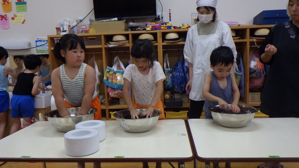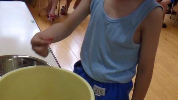 すると、汁が出ます。それを搾ること三回繰り返してから梅の中に入れ、今再びゆり組の部屋で梅はやすんでいます!?