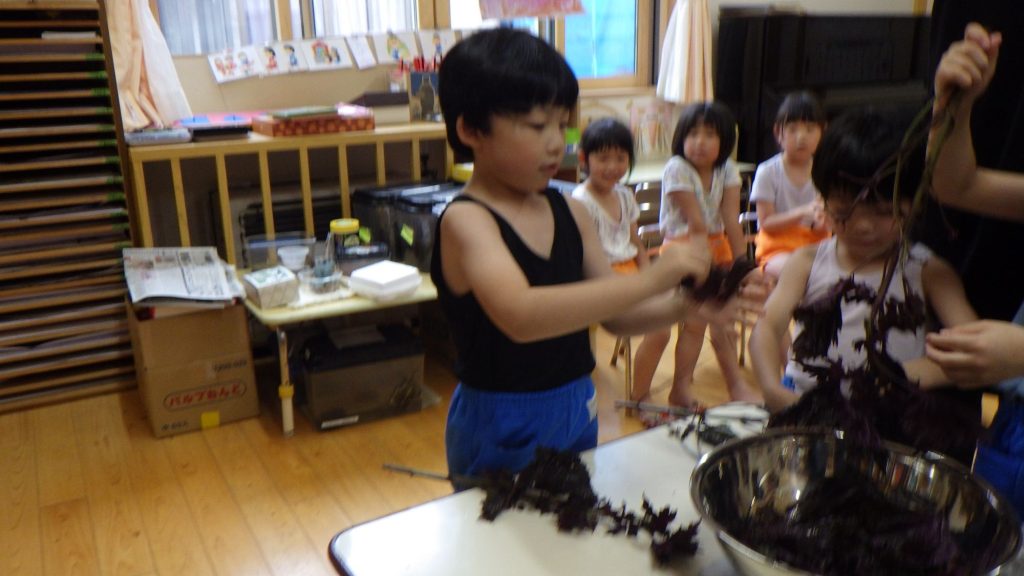 先日、梅を塩で漬けました。約二週間が経ちうまく水分が上がってました。そこで今度は赤紫蘇をみんなで葉っぱの所だけを丁寧に取り、塩を振ってしっかりと揉みました。
