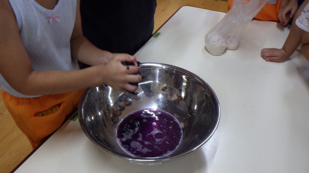 子どもたちは絞った赤紫蘇の味見をしていました。