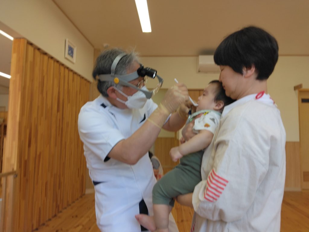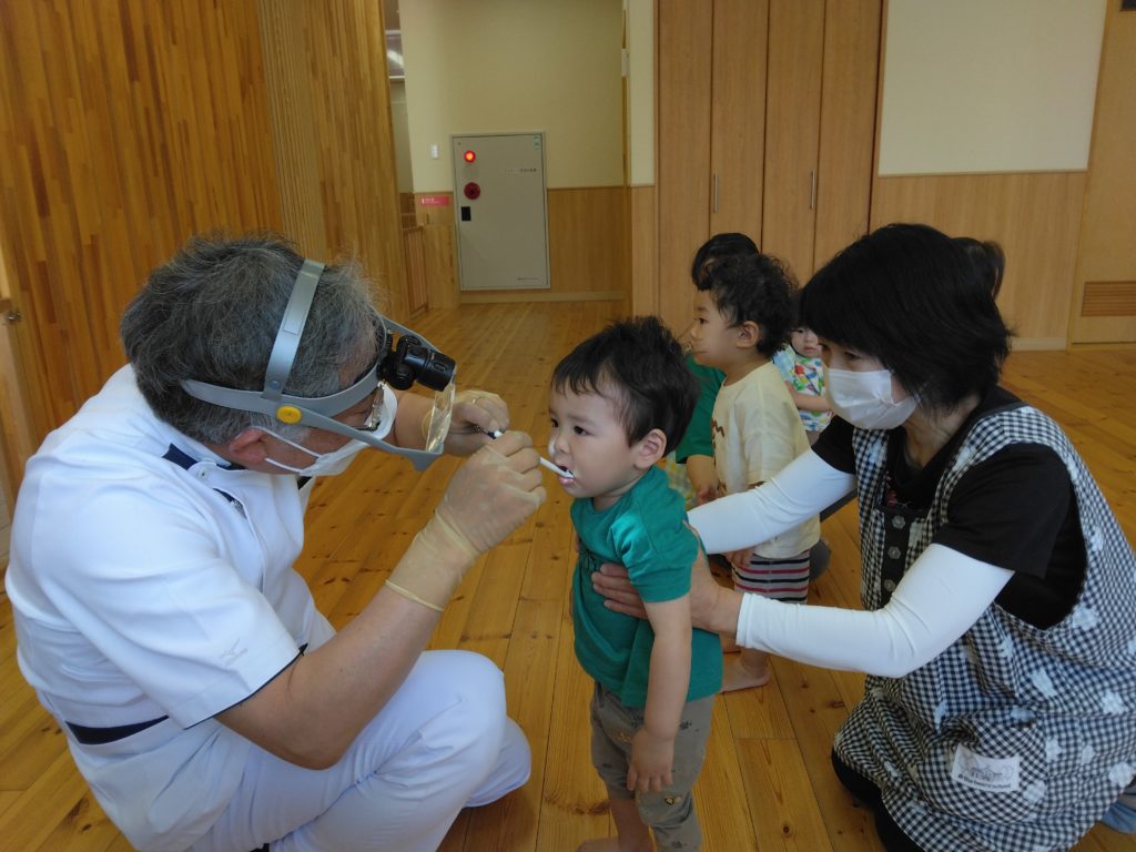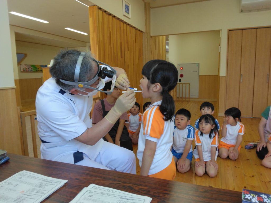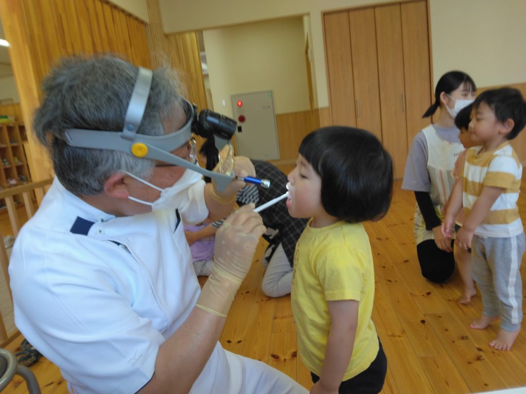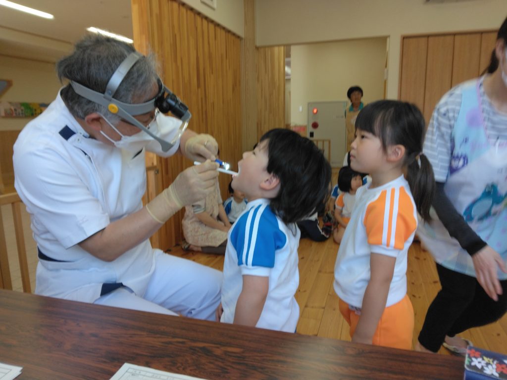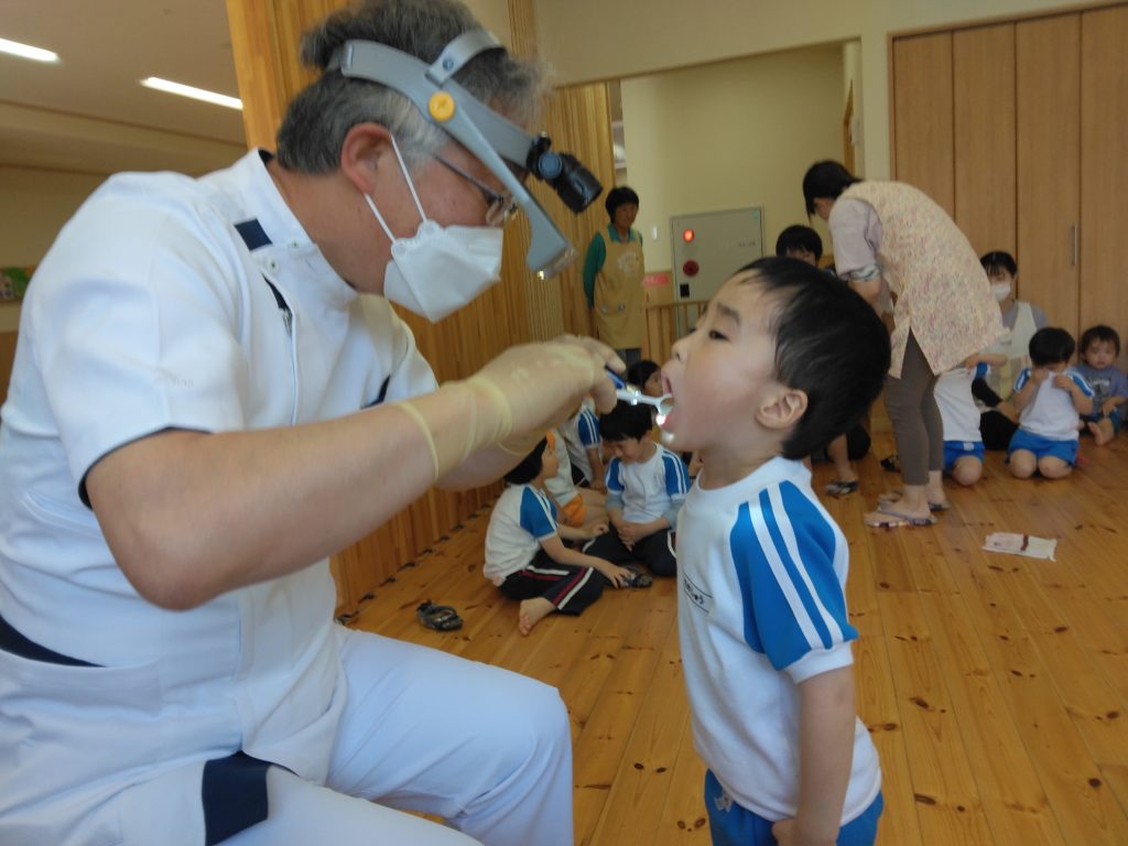 歯科健診 2023.06.07 朝、玄関脇の小ホールに準備されたテーブル 銀の入れ物…。その中には検査用のミラーが入っています。 歯科健診の前には松野先生がしっかりと待機して子どもたちを待ってくれています。 子どもたちは緊張の面持ちで小ホールへ。 まずはお手本となるゆり組のお兄さん、お姉さんから、口をおおきく開けて…。 じょうず!! そのお手本を見て他のクラスメートの子どもたちもスムーズに健診を受けることが出来ました!!
