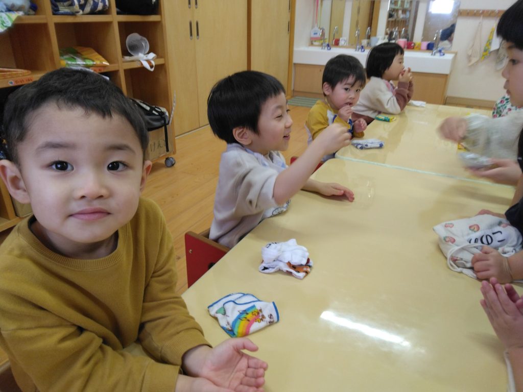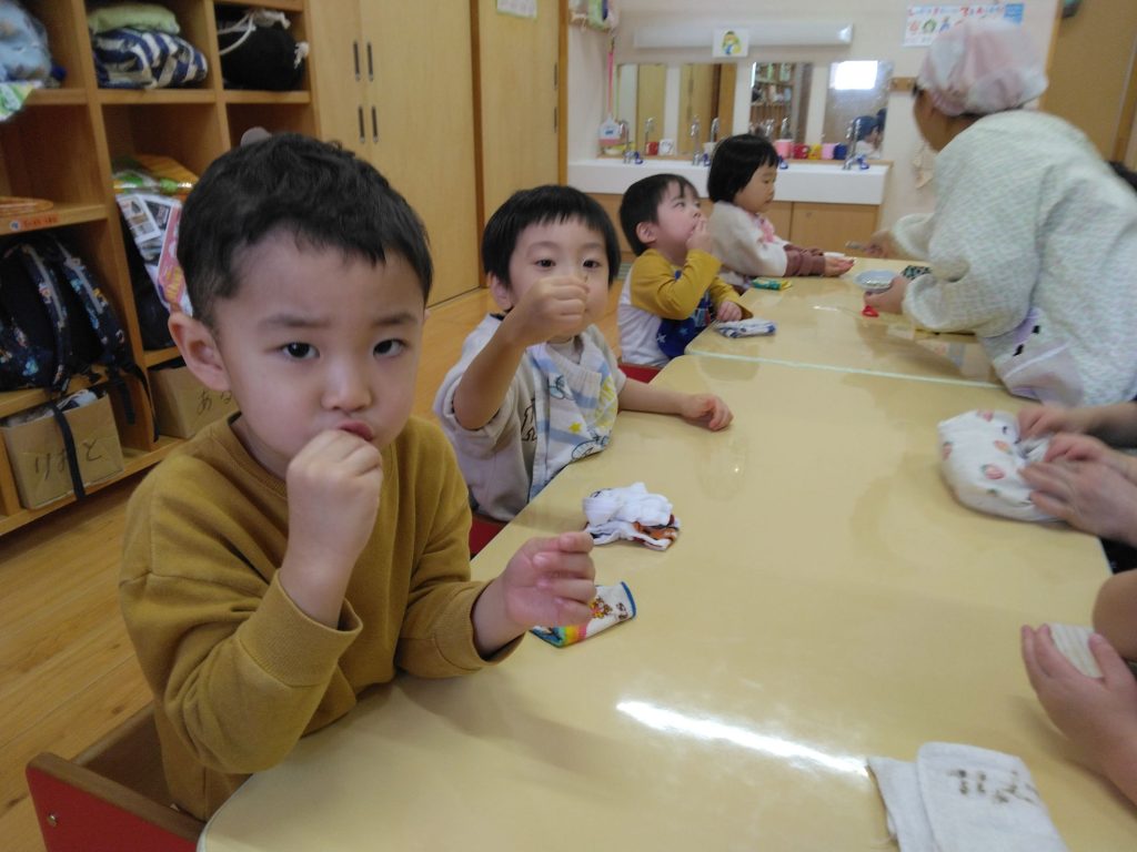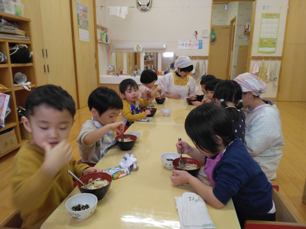 煮干しも美味しい!! 2025.01.31 ひまわり組の給食を覗いてみると、準備が終わって椅子に座って待っている子ども準備中の子どもがいました。 しばらくすると恵みの神さまを賛美してお祈りをすると、子どもたちは小さな両手を差し出して煮干しをもらって「いただきまーす」と言ってむしゃむしゃ食べていました。「スルメも食べてるよ」「私も食べてるよ」と、会話しながら煮干しを2本食べ終わると「食べました!!」 すると、給食が目の前に届きます。「ありがとう」と伝えてうどんを美味しそうに食べていました。