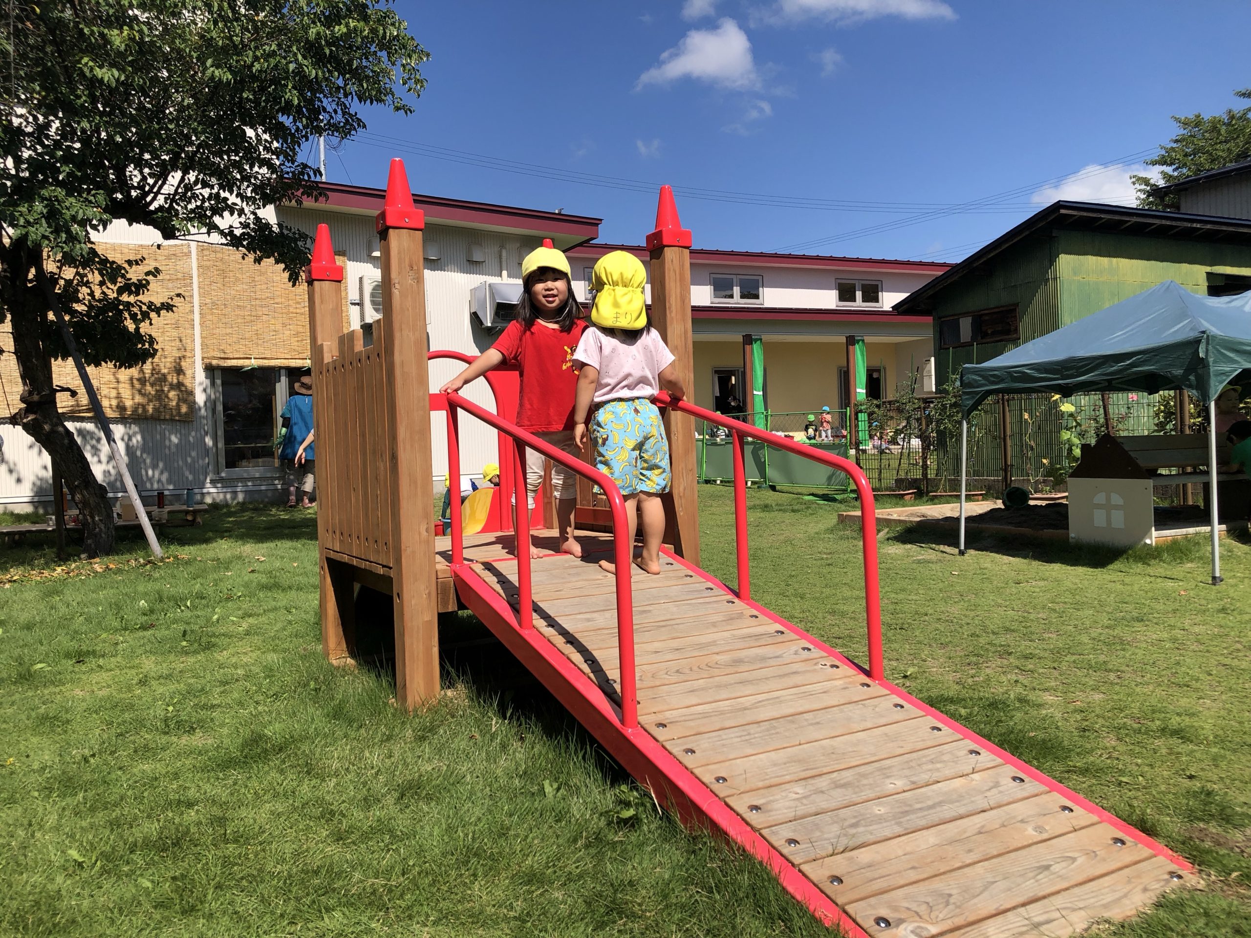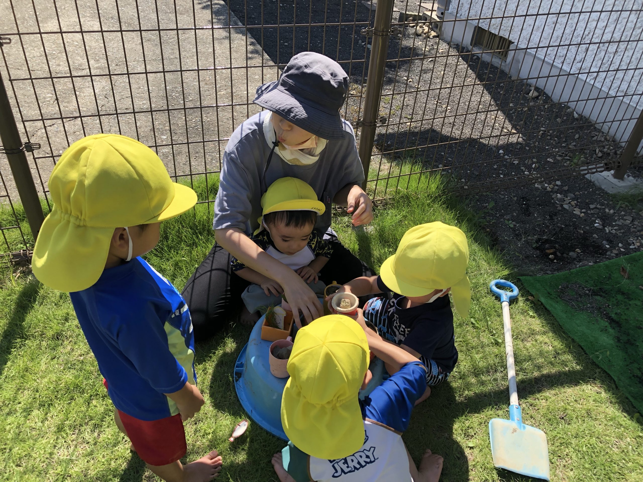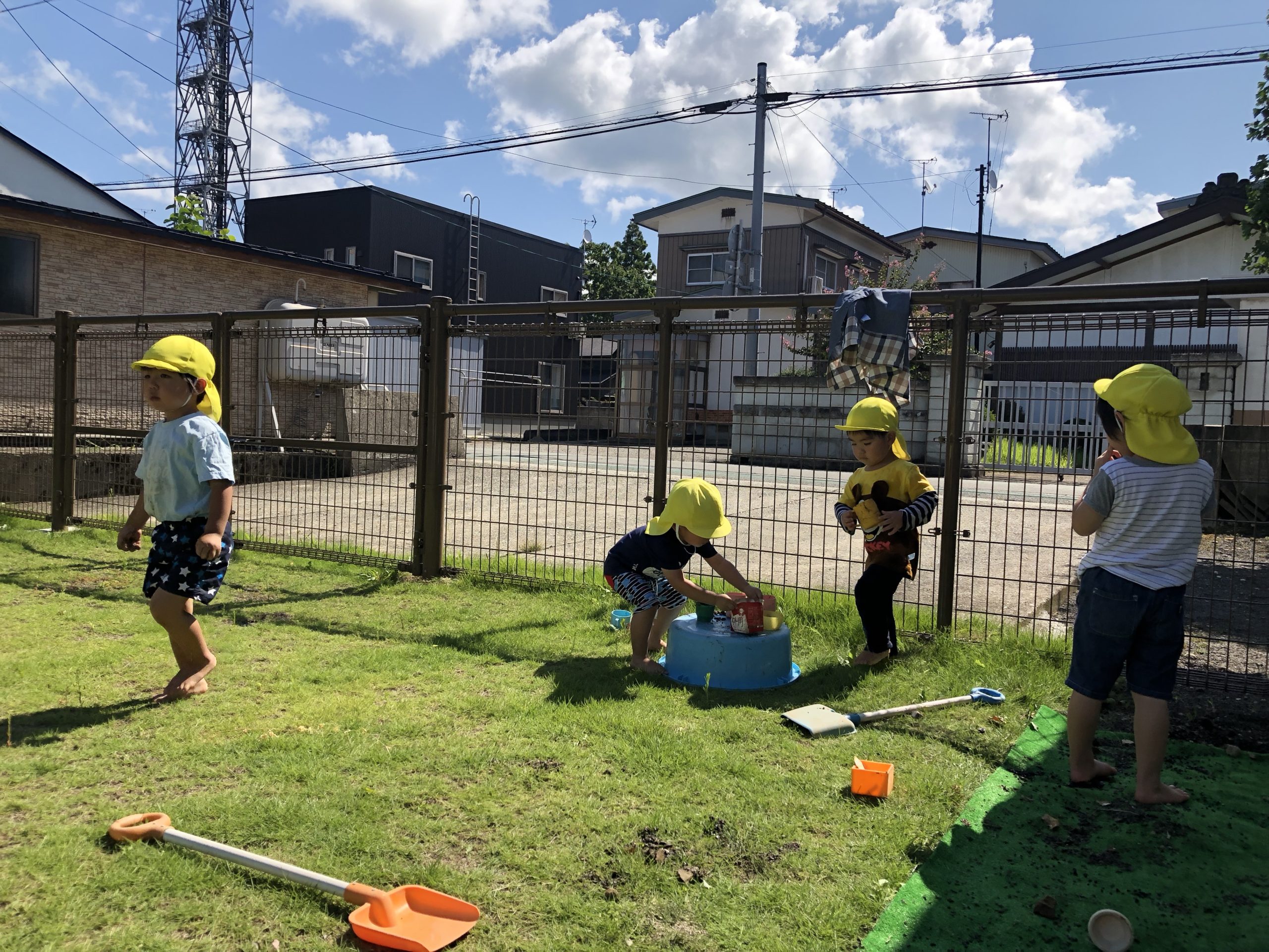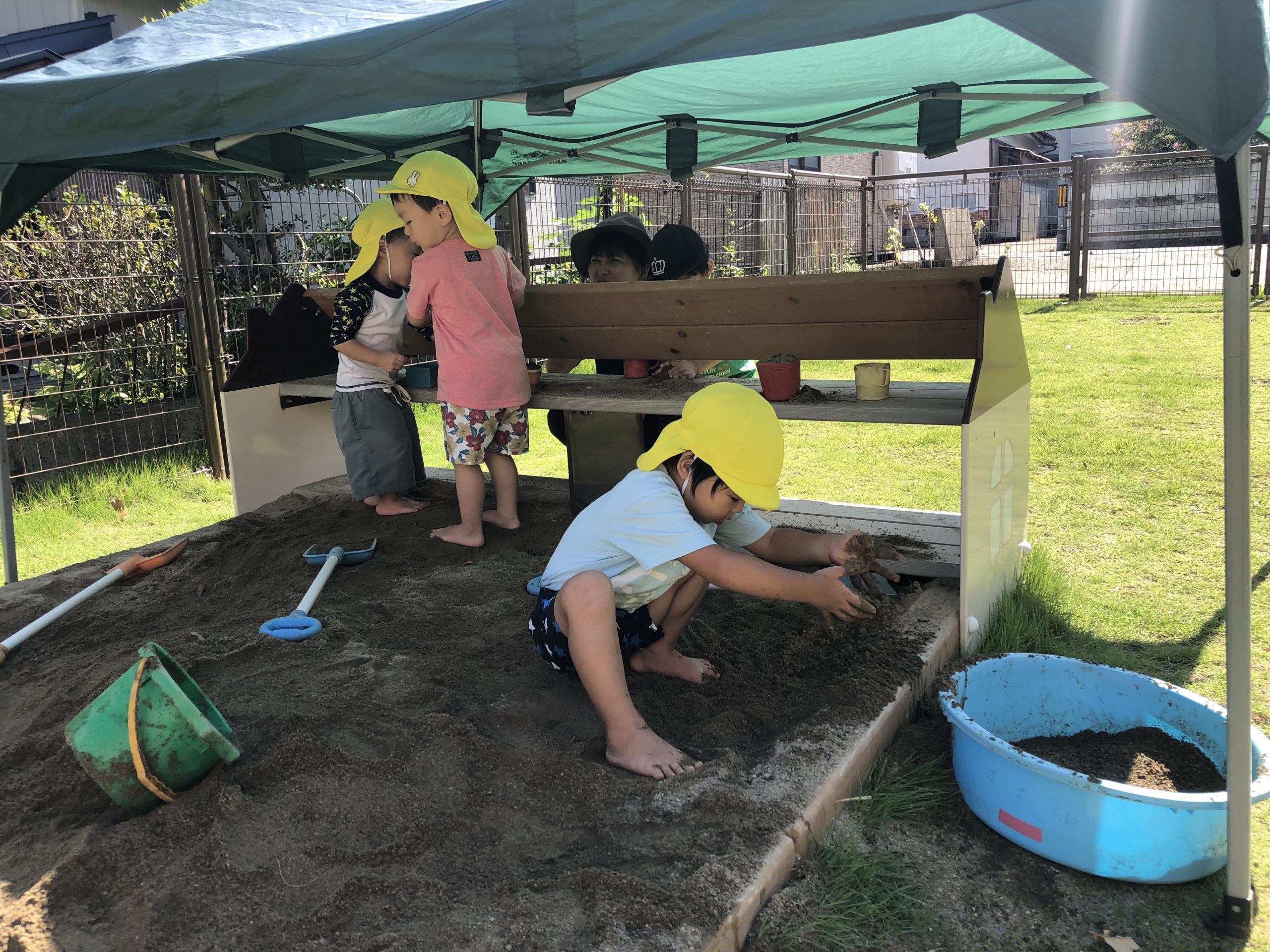 砂、虫、水、なかま‥ 2021.09.02 青い空の下、園庭で遊ぶひまわり組の子どもたち。 砂で作った誕生ケーキ、ちょうちょが飛んできて「あ!!ちょうちょ!」追いかけよう‥。 滑り台 「〇〇ちゃんおいでー」 「一緒に遊ぼうよ」 「どうぞ」差し出した手には水の入ったカップ。 「なにがはいってますか?」 「ラーメンだよたべて」 「ありがとう、美味しかったよ」 「あ!!ほら、トンボ」 トンボ、トンボ、トンボ‥。 みーんな大喜び。 すてきな仲間がいて楽しい毎日。