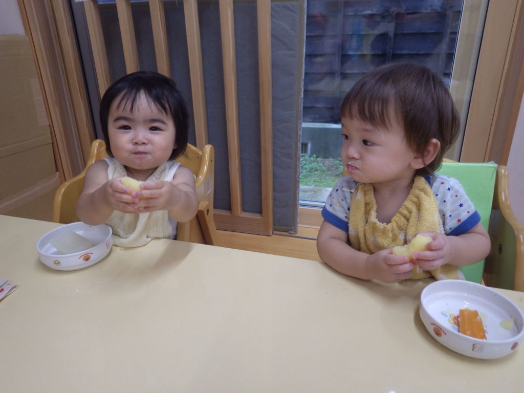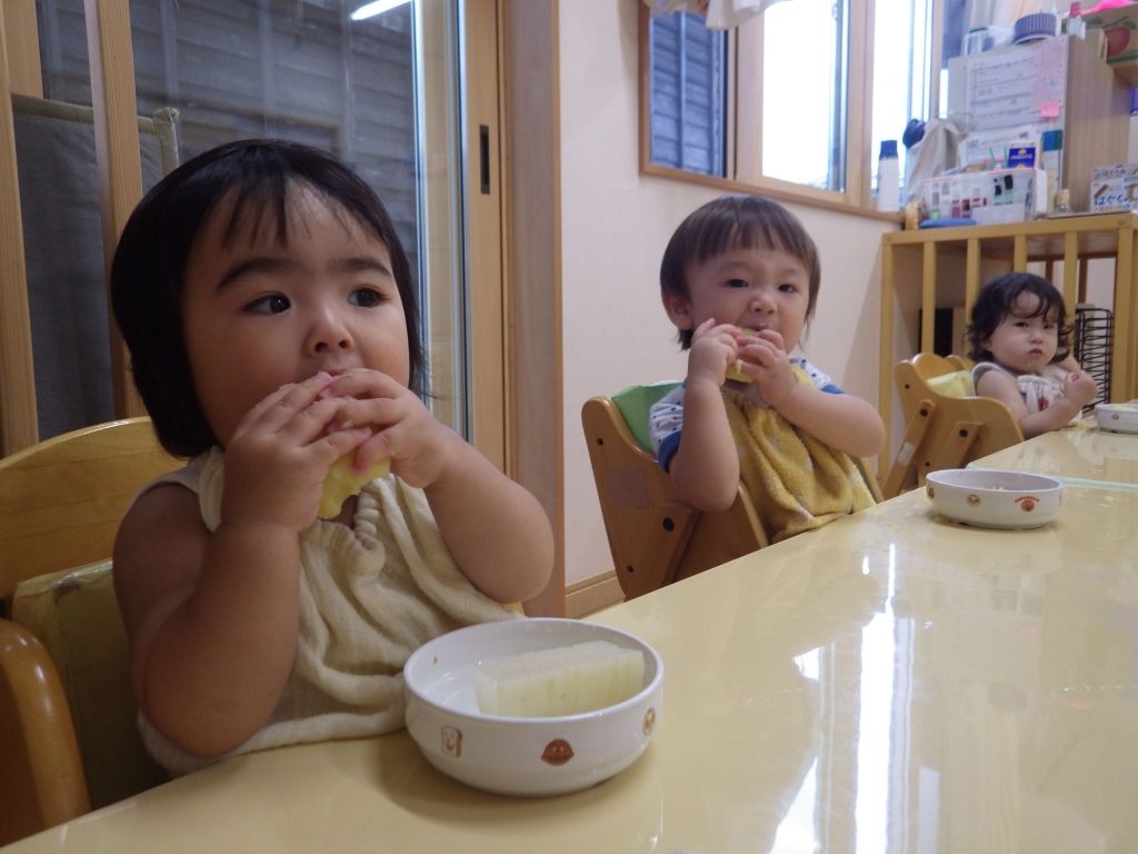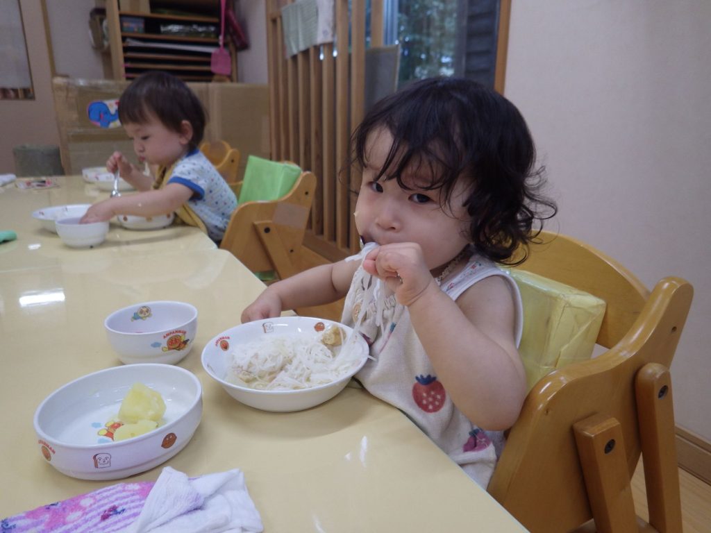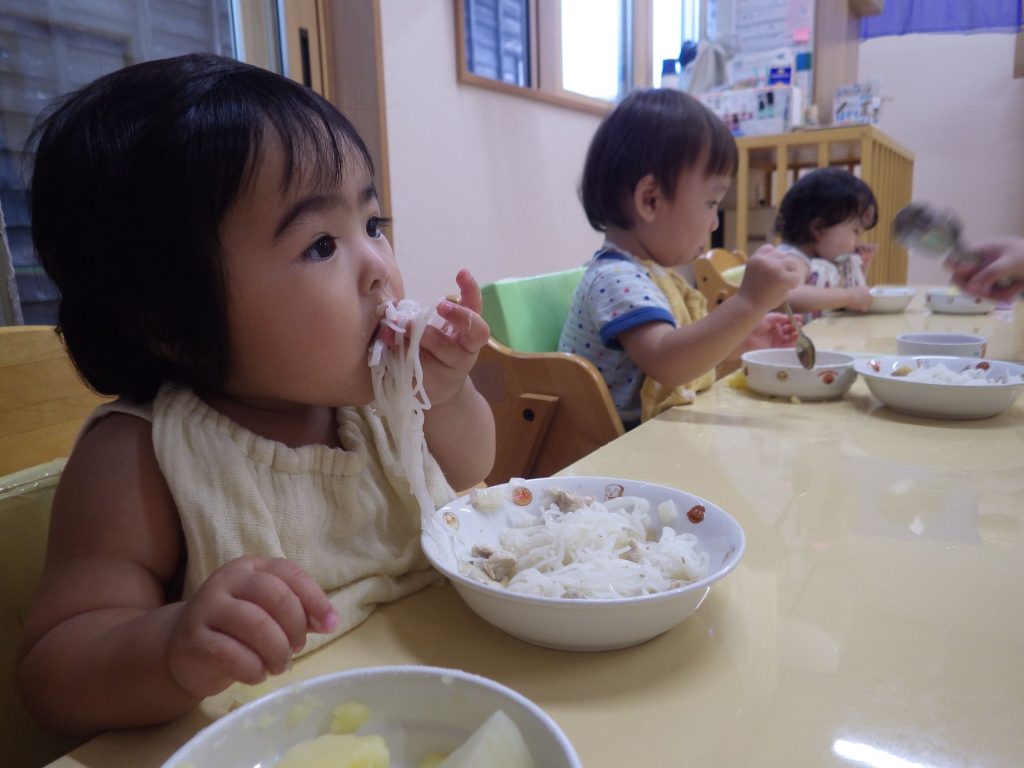美味しい!! 2024.07.26 給食の時間です。 もも組の子どもたちは土鍋野菜を美味しそうに食べていました。 今日の給食はけんちん風うどんです。 うどんも副菜も手づかみで美味しそうに食べていました。 美味しいよ!!と、じゃがいもを見せてくれました。
