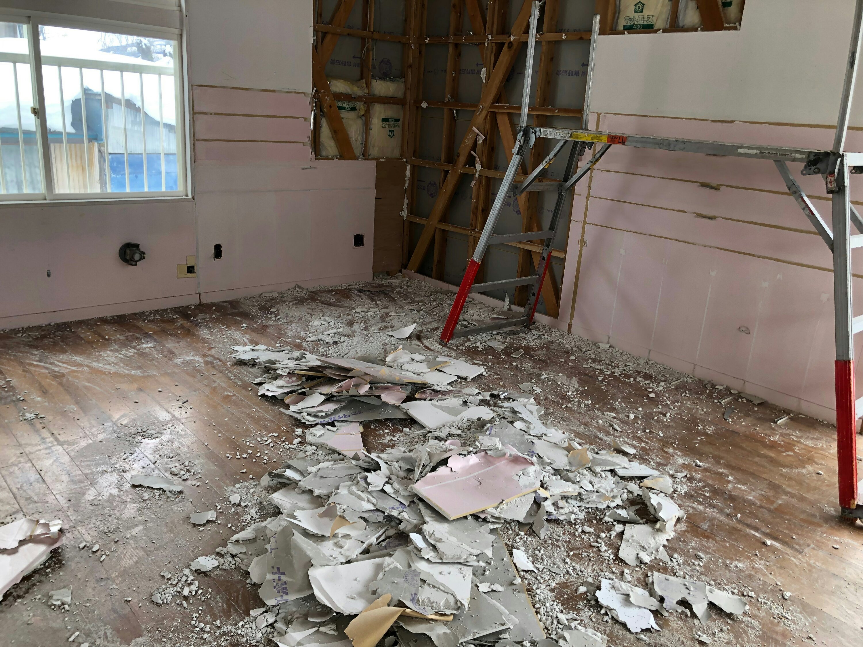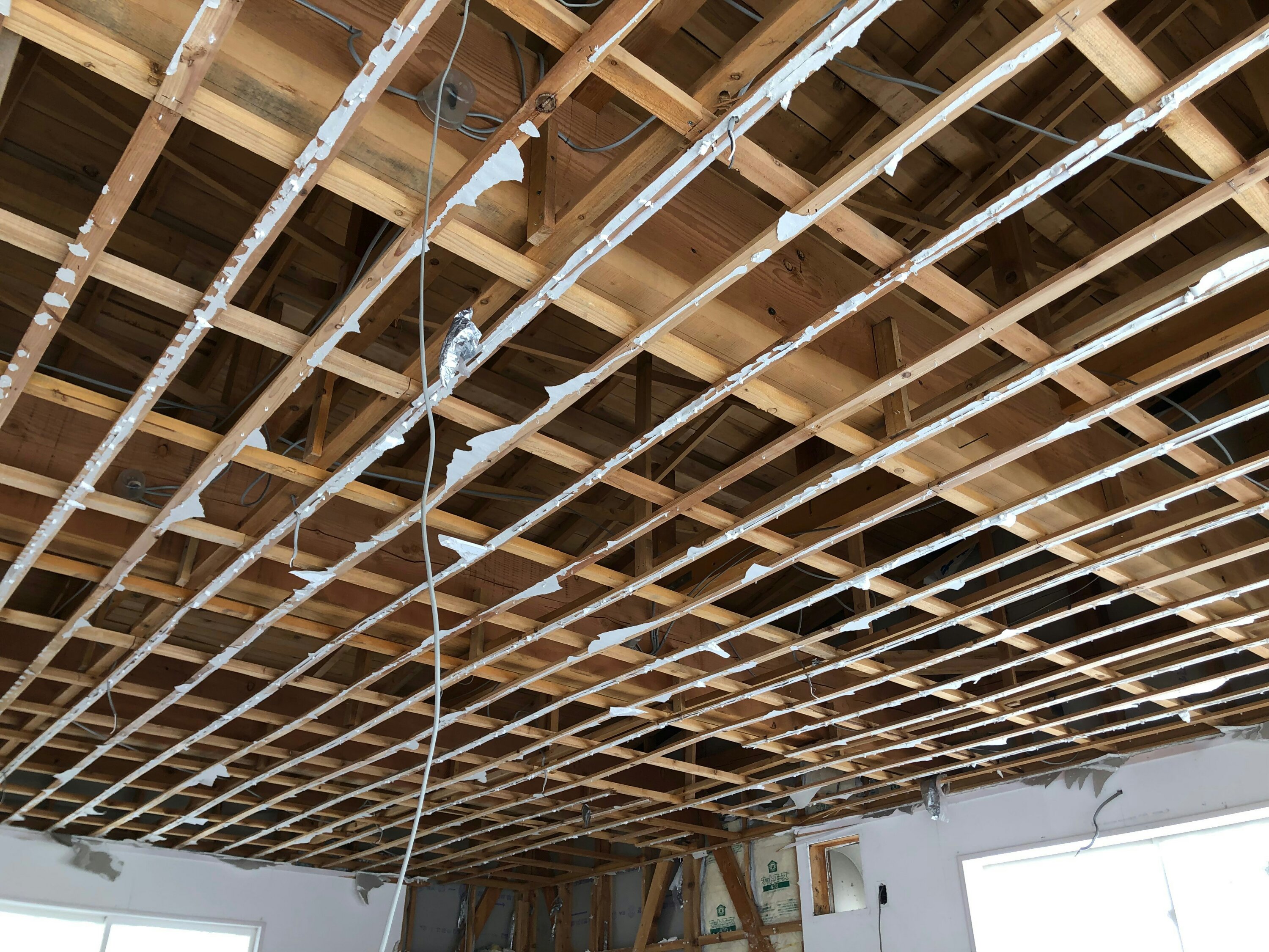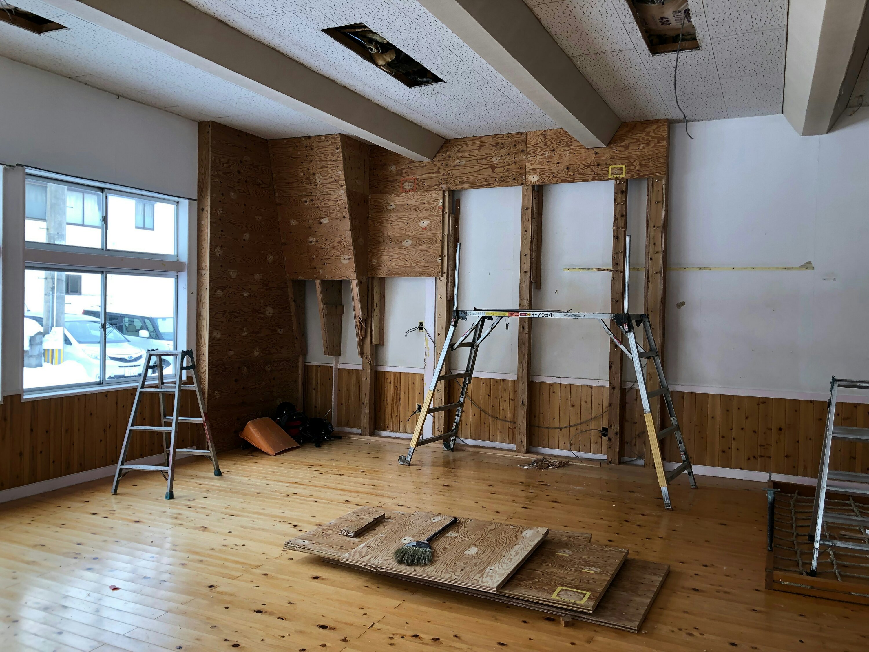 一番奥のもも組の部屋の天井が剥がされ、木の骨組みが見えました。