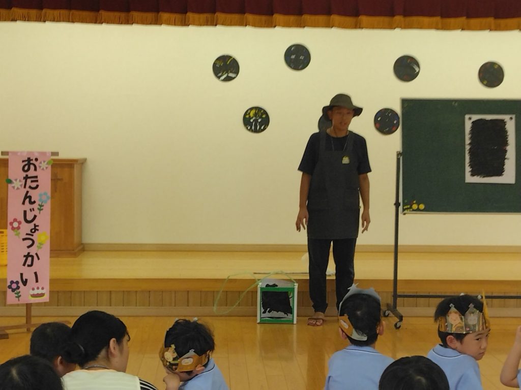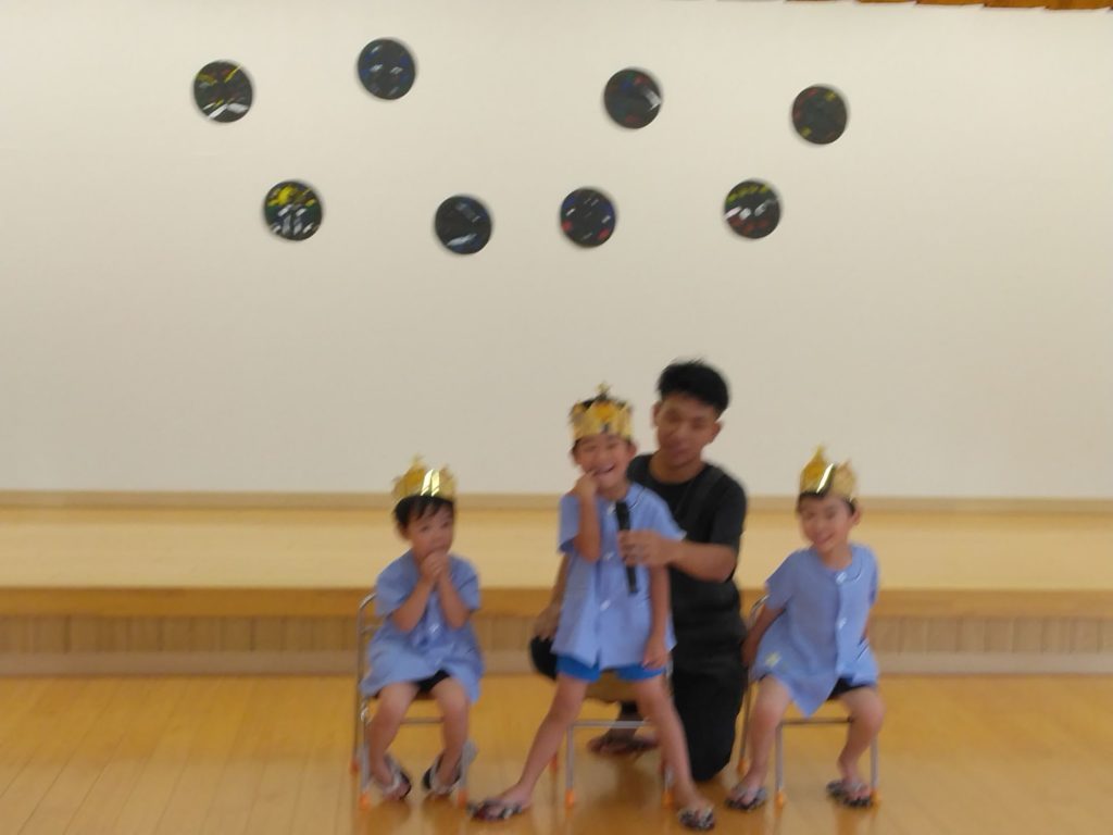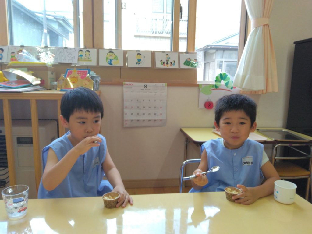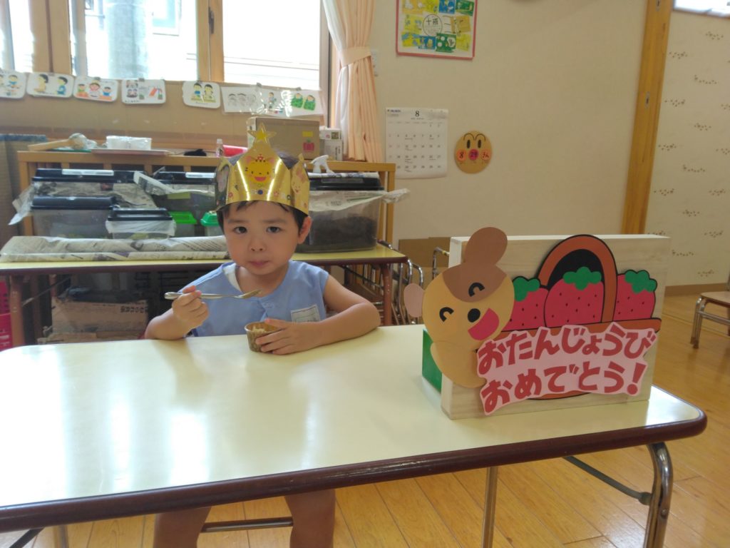 誕生会(以上児) 2025.08.29 今日は8月生まれの誕生会がありました。3人の子どもたちが、わくわくドキドキしながら前に座り、名前と何歳になったのかを発表してくれました。 お楽しみタイムでは、虫採りにでかけ、黒く塗ったクレヨンを削った下から何の虫が出てくるかを楽しみました。 みんなでおいしいおやつもいただき嬉しそうな表情でした。 誕生会のおやつはきな粉豆腐でした!! 子どもたちはこのきな粉豆腐が大好きです!!