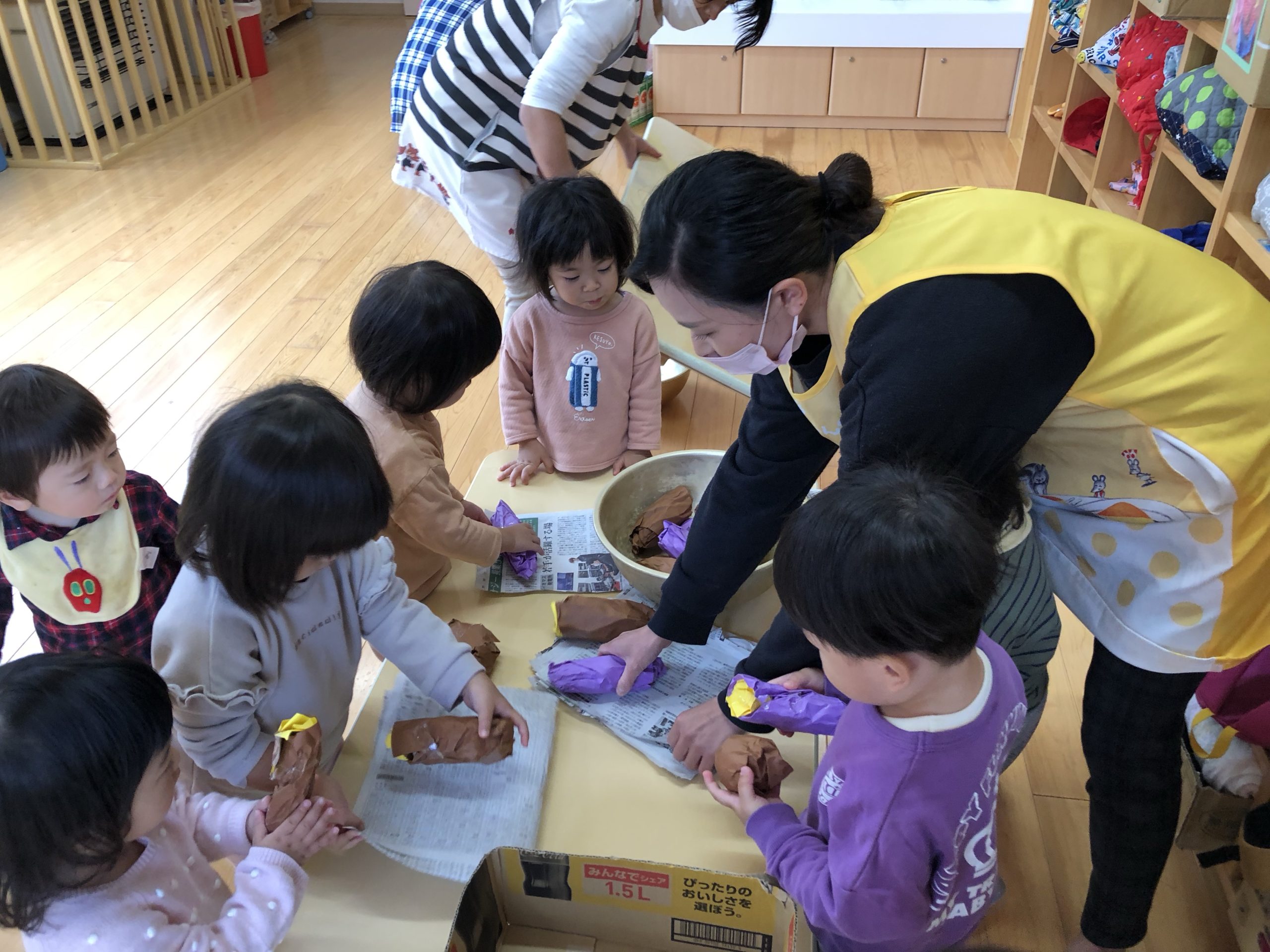 お楽しみタイムでは焼き芋をみんなでつくろう!!と、用意した折り紙の芋をみんなで新聞紙で包んでいました。焚き火に見立てた新聞紙に芋を入れて、さあ!食べよう!!の声に焼き芋はどこだ?と折り紙で作った焼き芋の中を一生懸命探している姿も可愛い!!と、先生たちの声が聞こえました。