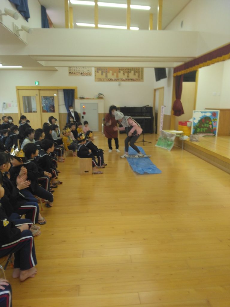 今日のお楽しみタイムは「ペーパーさんのピクニック」でした。楽しいピクニックのはずが様々なアクシデントに遭うペーパーさん。でも、ペーパーさんは新聞紙を使っていろいろなものを作り出すことができました!風が吹いて寒くなれば大きな帽子を作り、川が現れれば橋も作ってしまうそんな素敵なペーパーさんの姿をワクワクしながら見ていた子どもたちでした。