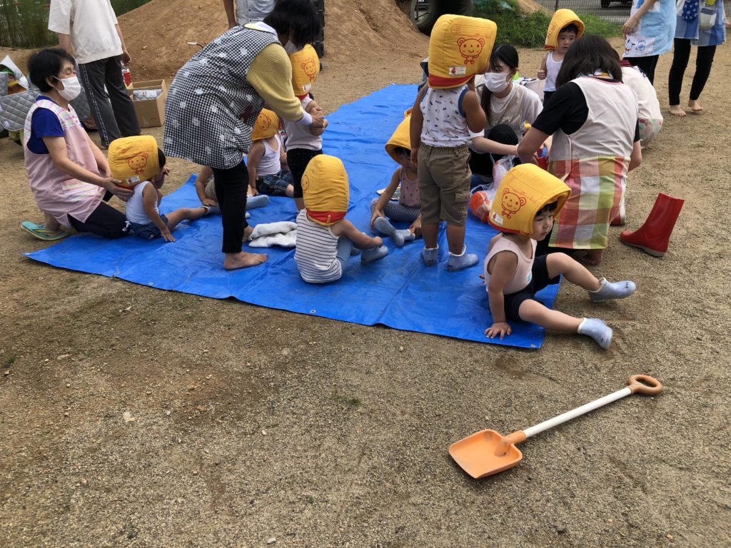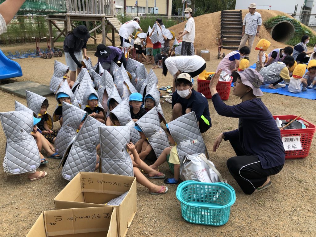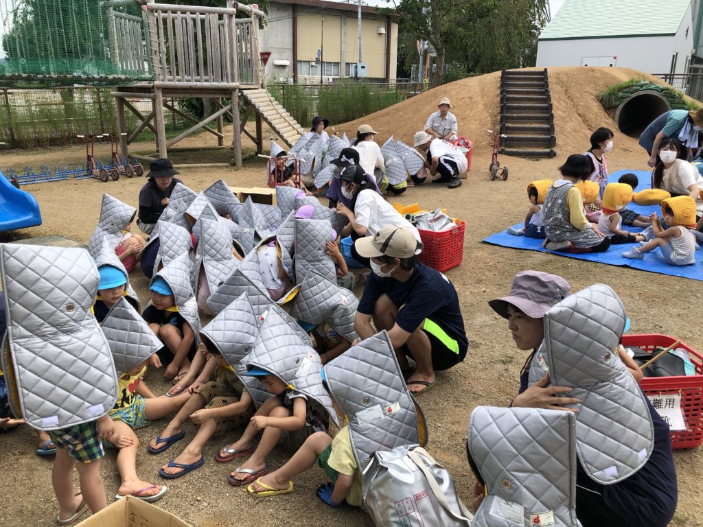 大型遊具の所に集まり、そこで子どもたちは防災頭巾を被りました。