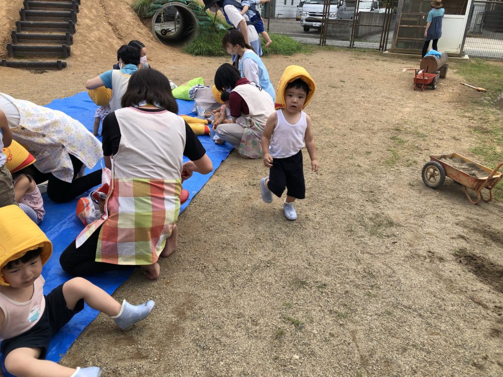 未満児クラスは朝、園庭で遊んでお部屋に戻って朝の会の時間でした。