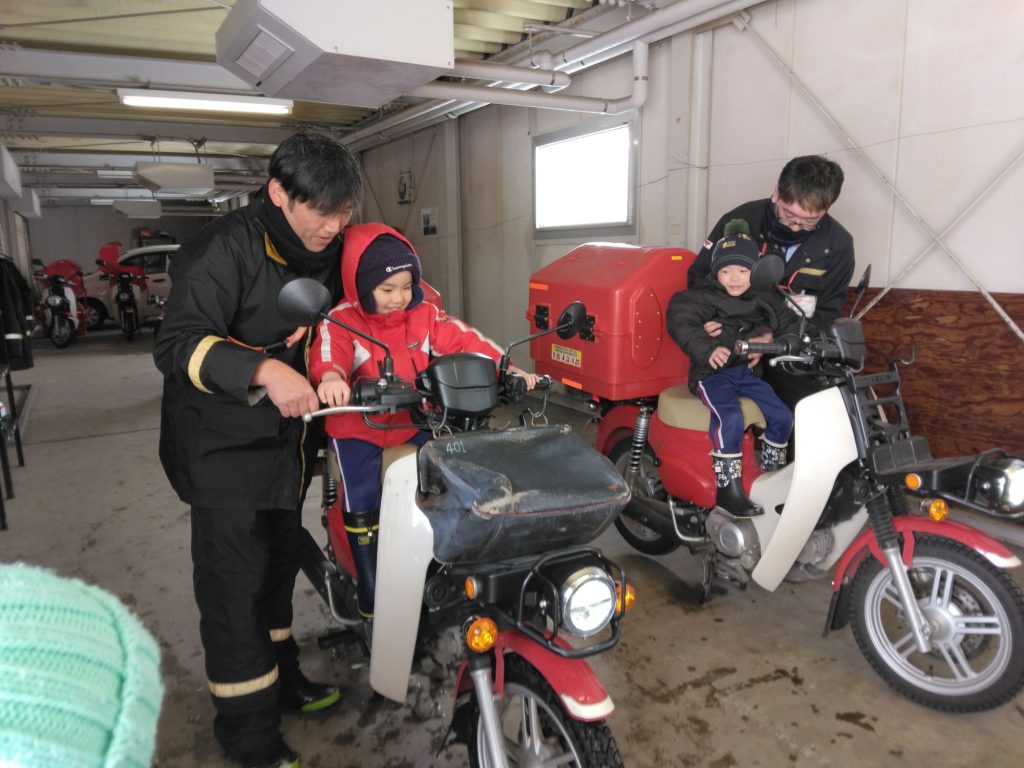 ハンコの作業を経験した後には外に出てバイクや郵便配達の車に実際に乗ってみました。