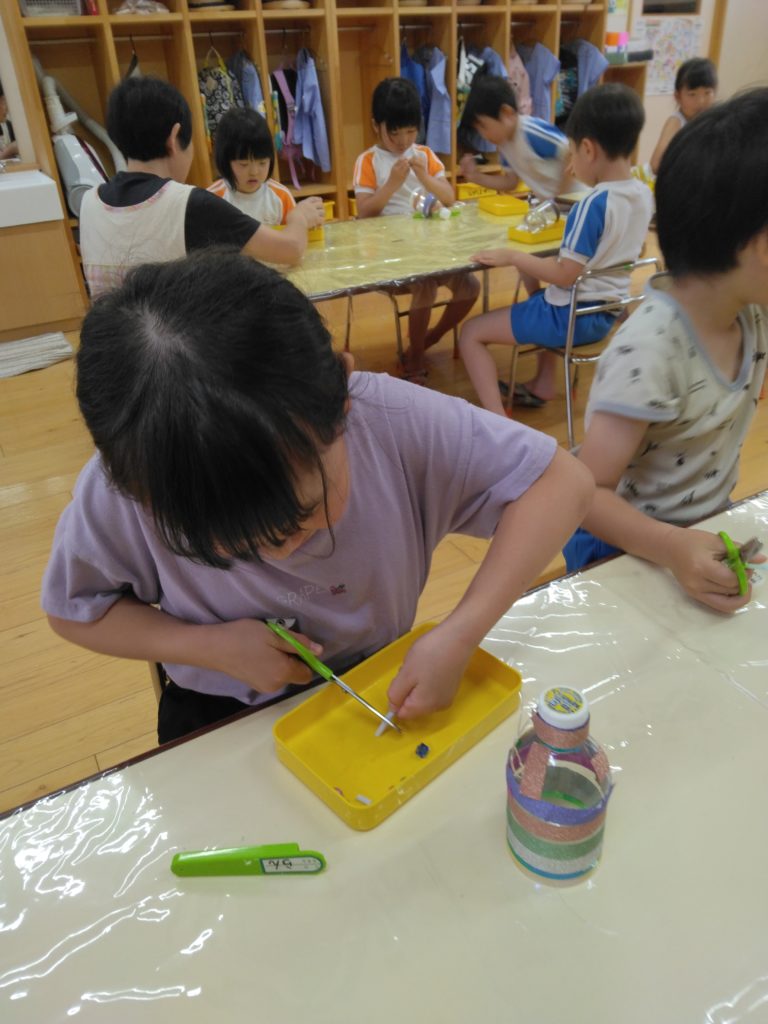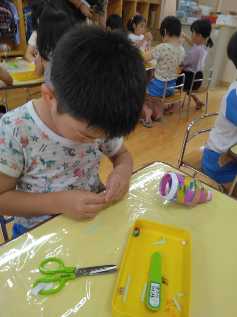 風鈴作り!! 2023.06.15 今日、ゆり組の子どもたちは実習生の指導を受けながら風鈴作りをしました。 紐を玉結びにするところは流石年長さん!! どんな風鈴がいいのかなーと、一人ひとり考えながら素敵な風鈴ができました!!