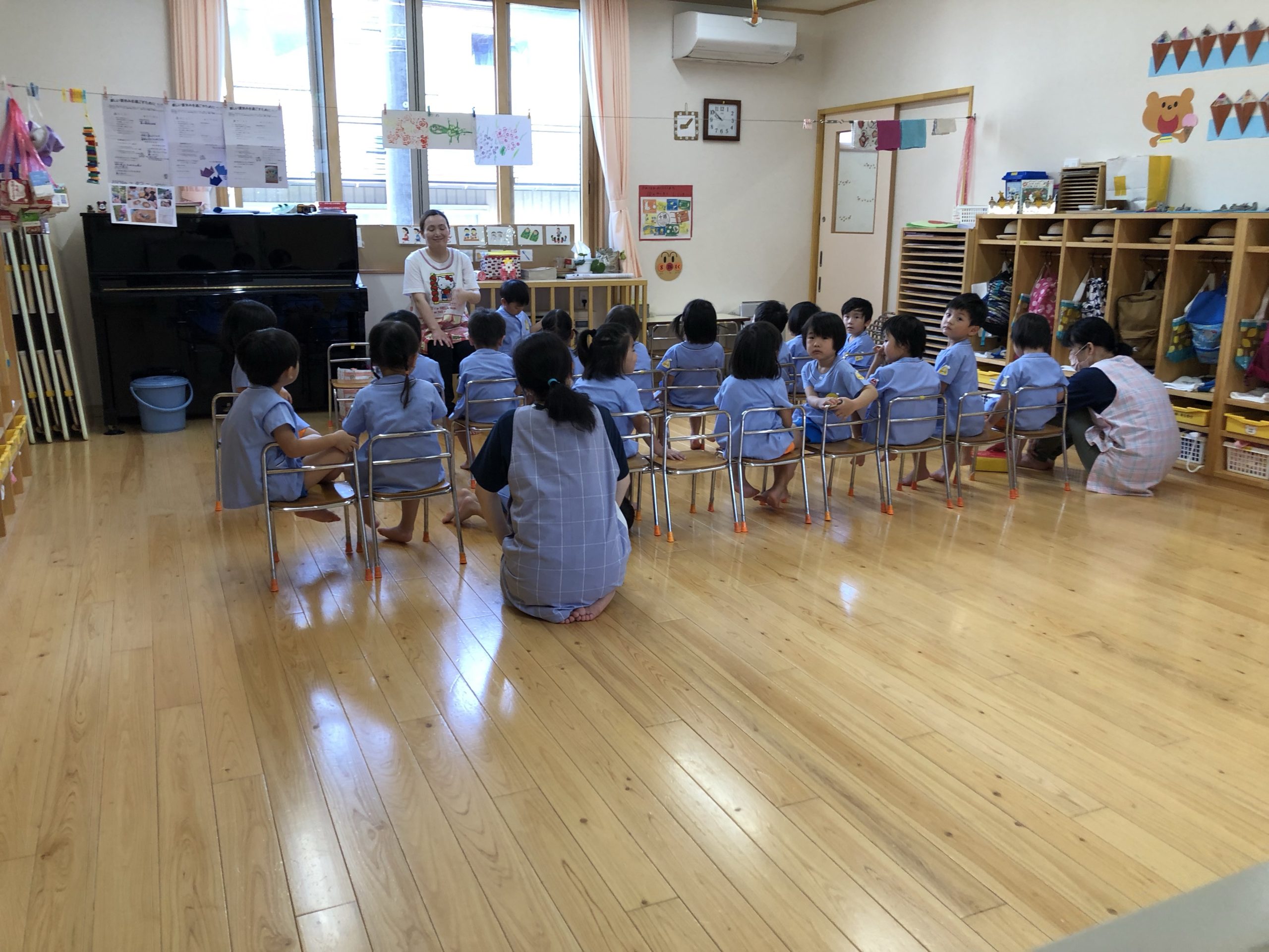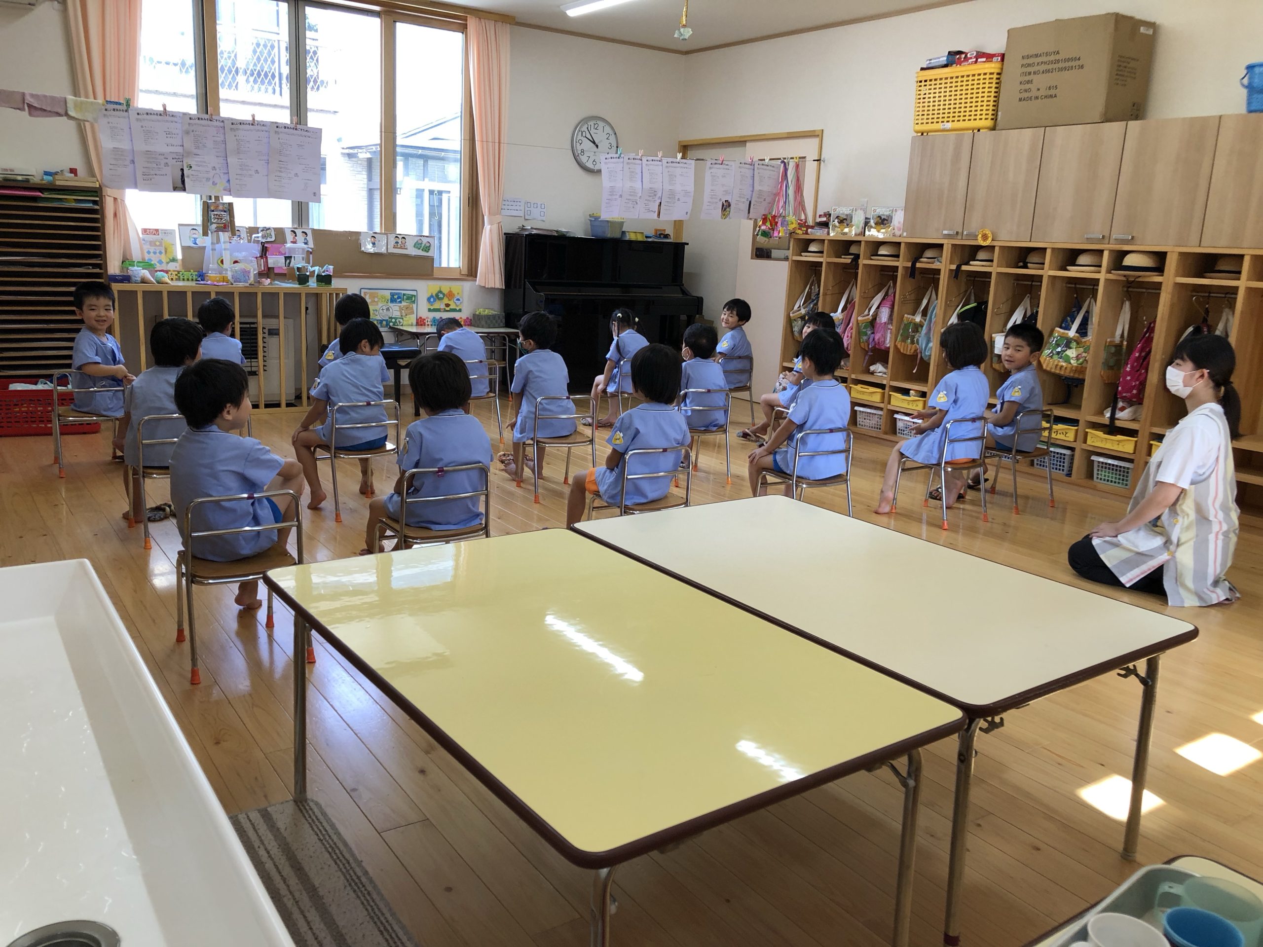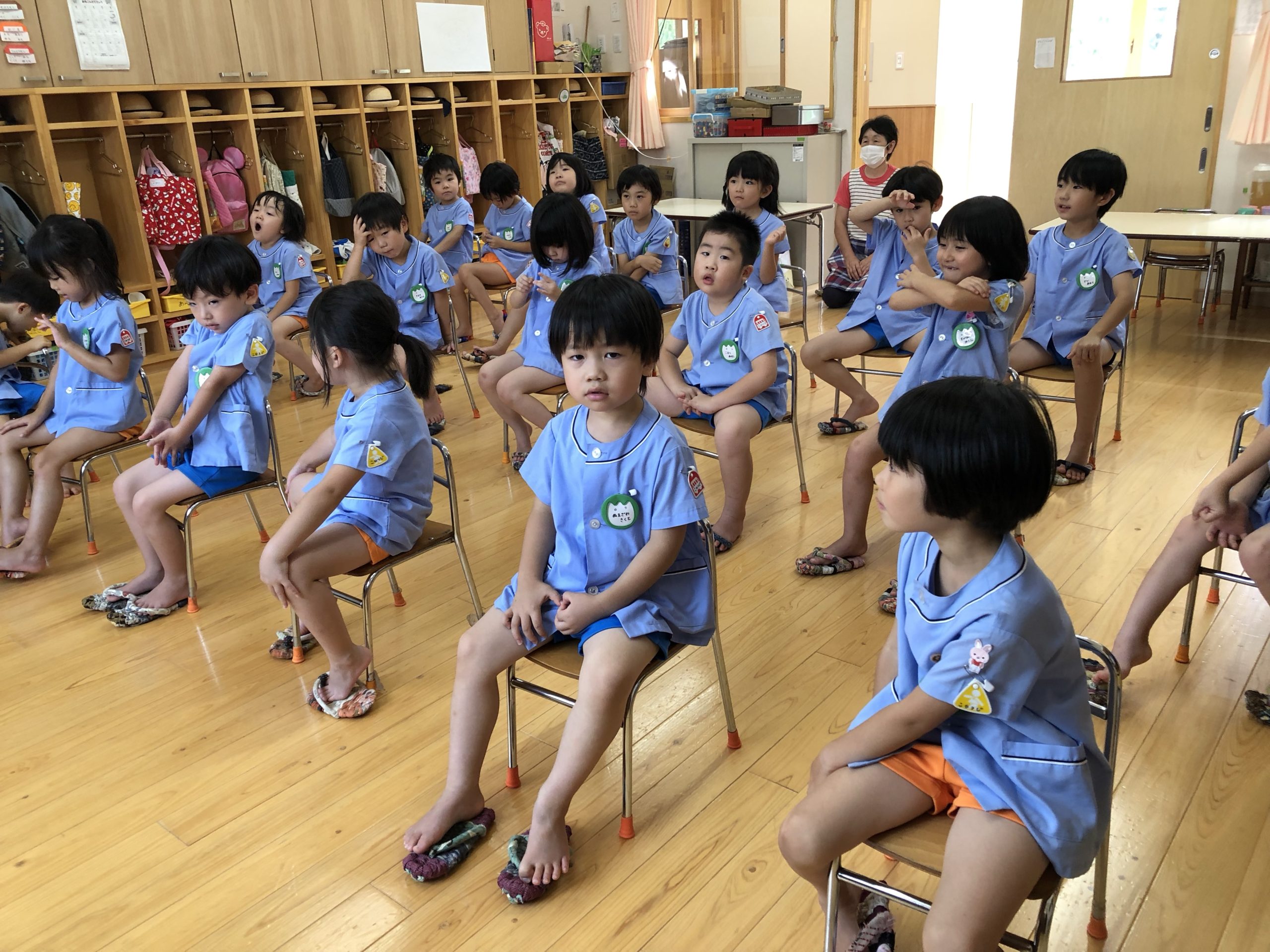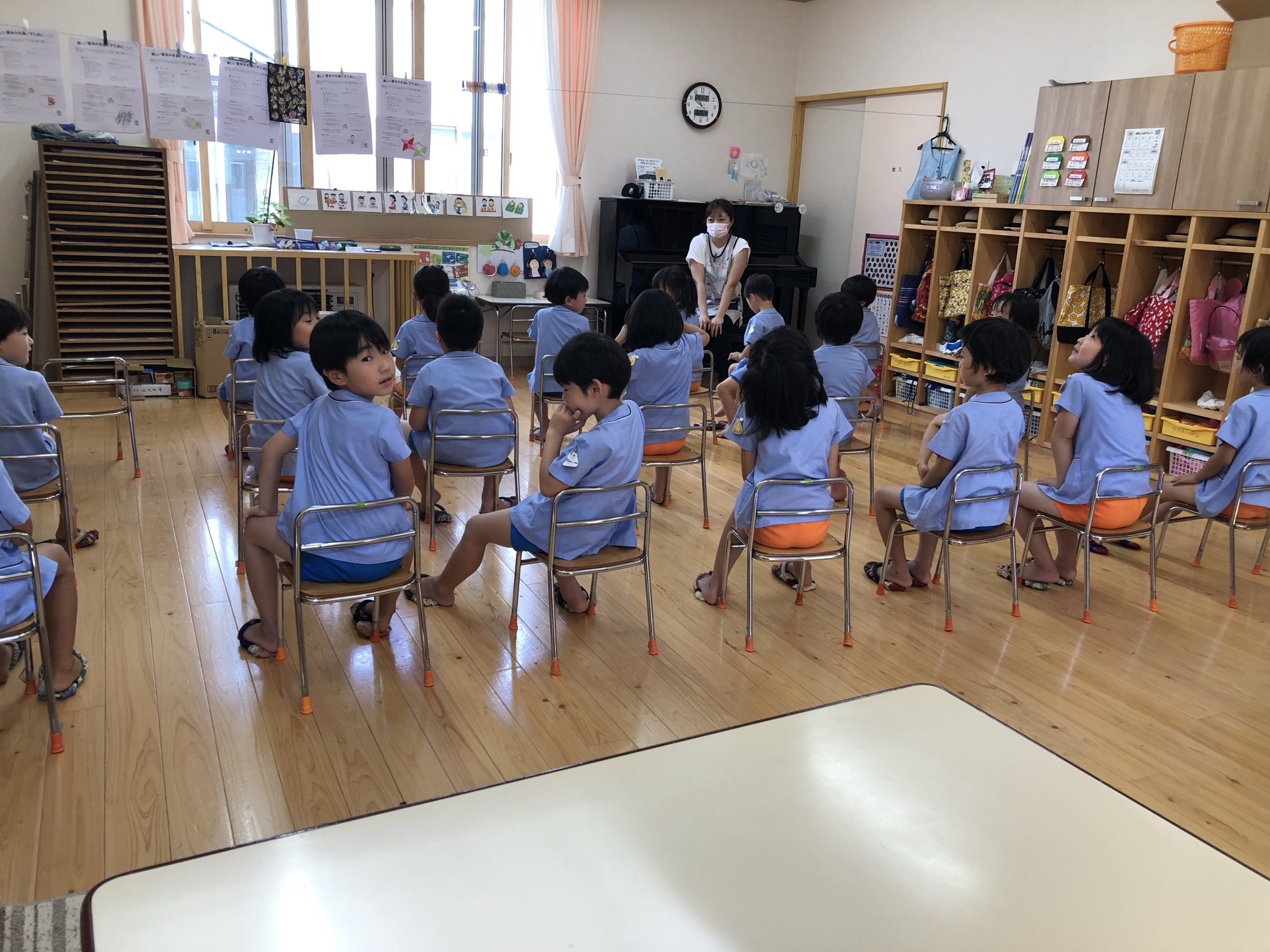 2学期始業式!! 2021.08.27 長い夏休みもあっという間に終わりました。 夏休みを家庭で過ごしていた子どもたちも元気に登園して来ました 久しぶりの再会に笑顔いっぱいの子どもたちでした!! コロナ感染拡大予防の為、始業式は各クラスで放送を通して行われました。 夏休みに楽しかったことを2人お友だちが発表してくれました。 「夏野菜を切ったこと」「セミの抜け殻を集めたこと」 この2学期も子どもたちの声と笑顔が輝きますように。