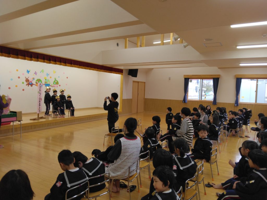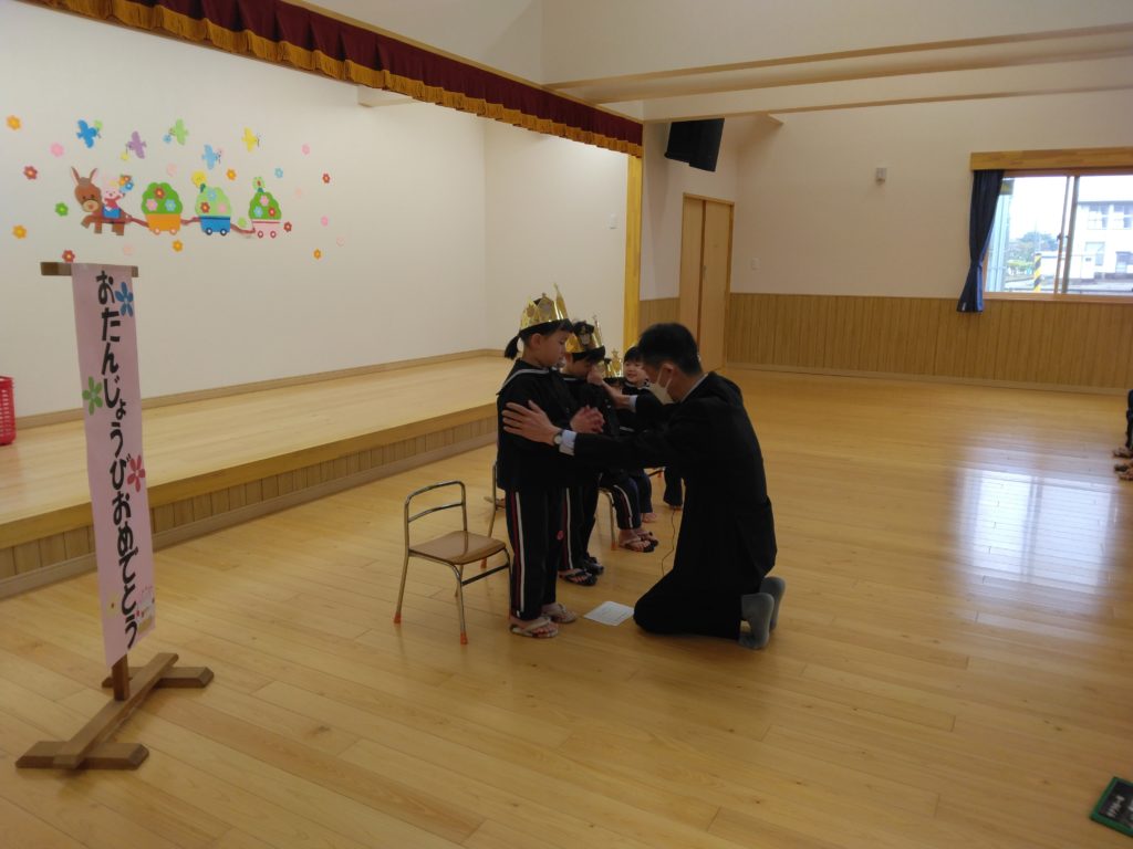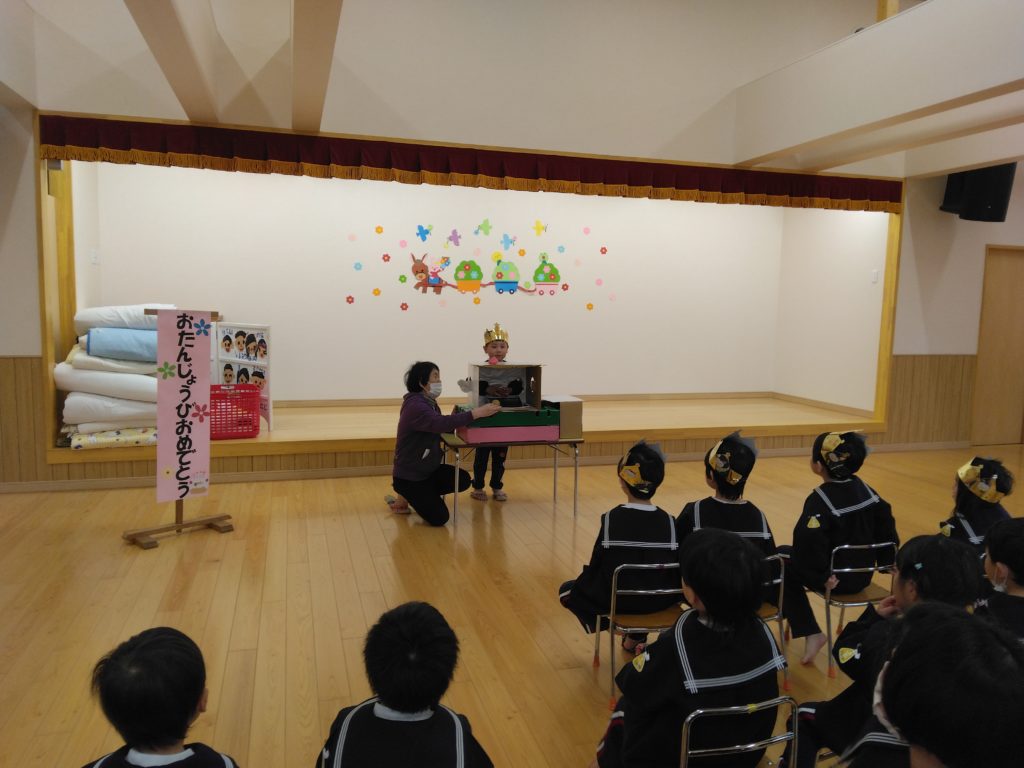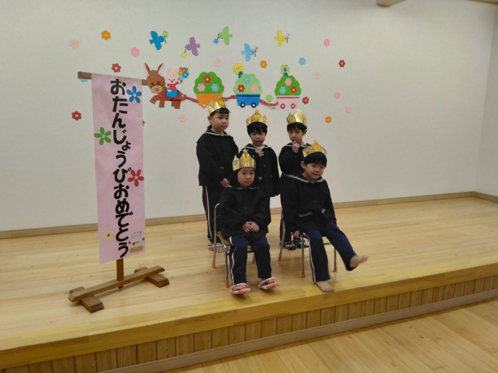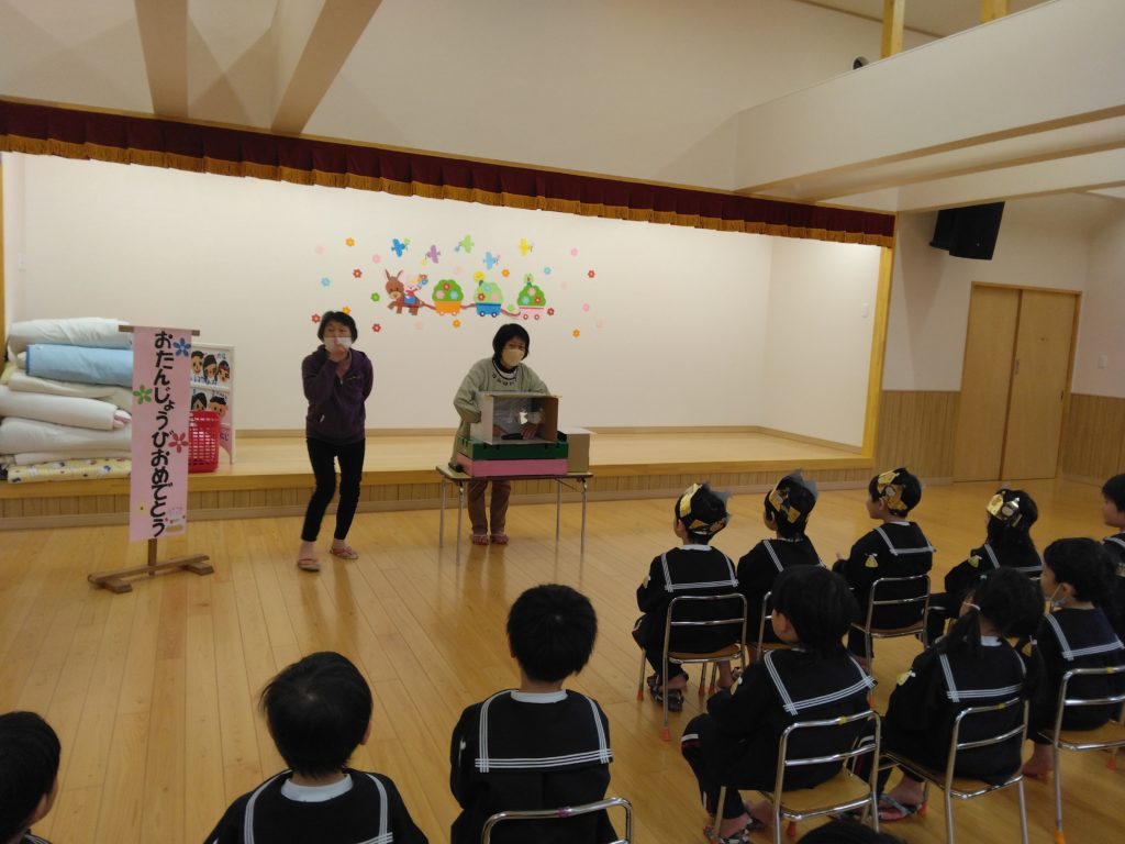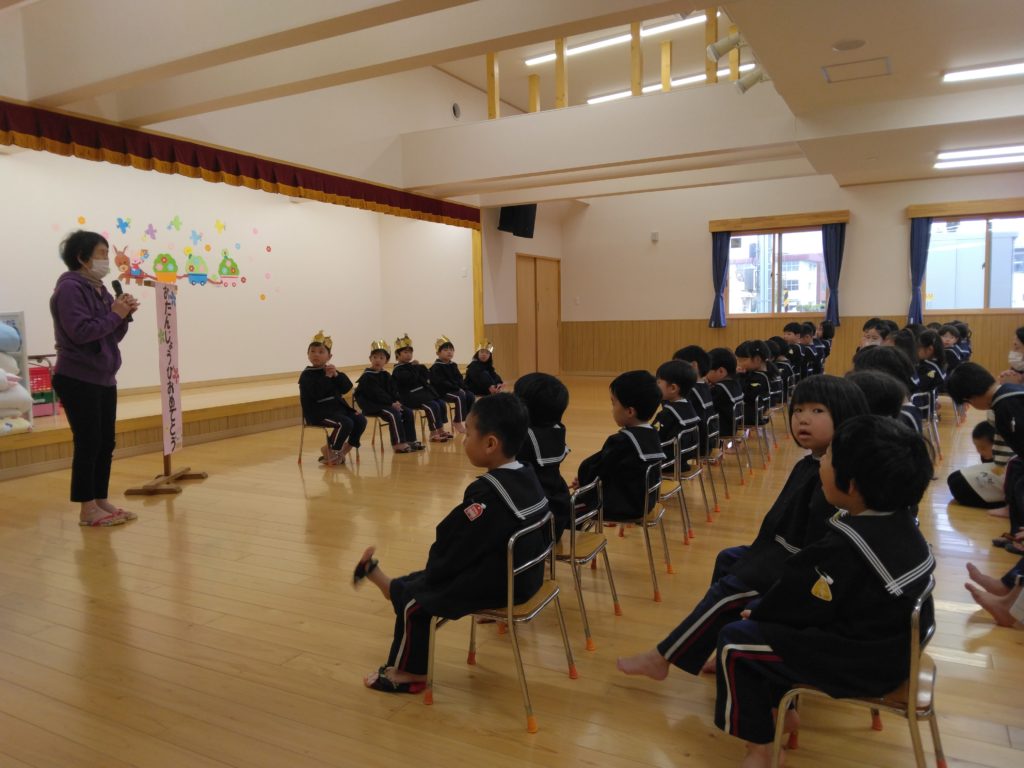 先日、今年度初めてのお誕生会が行われました。以上児クラスの子どもたちは遊戯室に集まり楽しい時間を過ごしました。