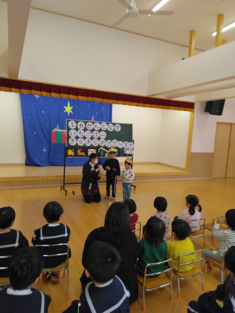 今月のお楽しみタイムは「へんしんトンネル」が出てきました。そこをくぐると変身していくのです。クリスマスと言えば”プレゼント”プレゼントが通るとなんと”トナカイ”に変身!”トナカイ”が通ると次は”イチゴケーキ”となにやらしりとりでつながっていく事がわかり、子どもたちはワクワクしながら次は何かな?と一所懸命考えていました。