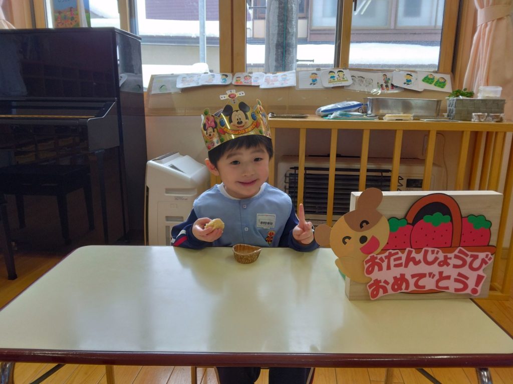 今日の誕生会はたんぽぽ組の一人でしたが、みんなの前に嬉しそうに座り、でもちょっぴり恥ずかしそうにもしていました。