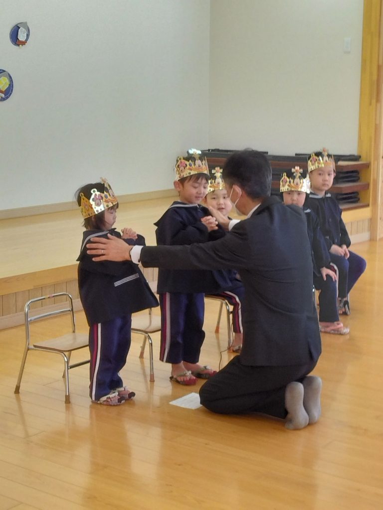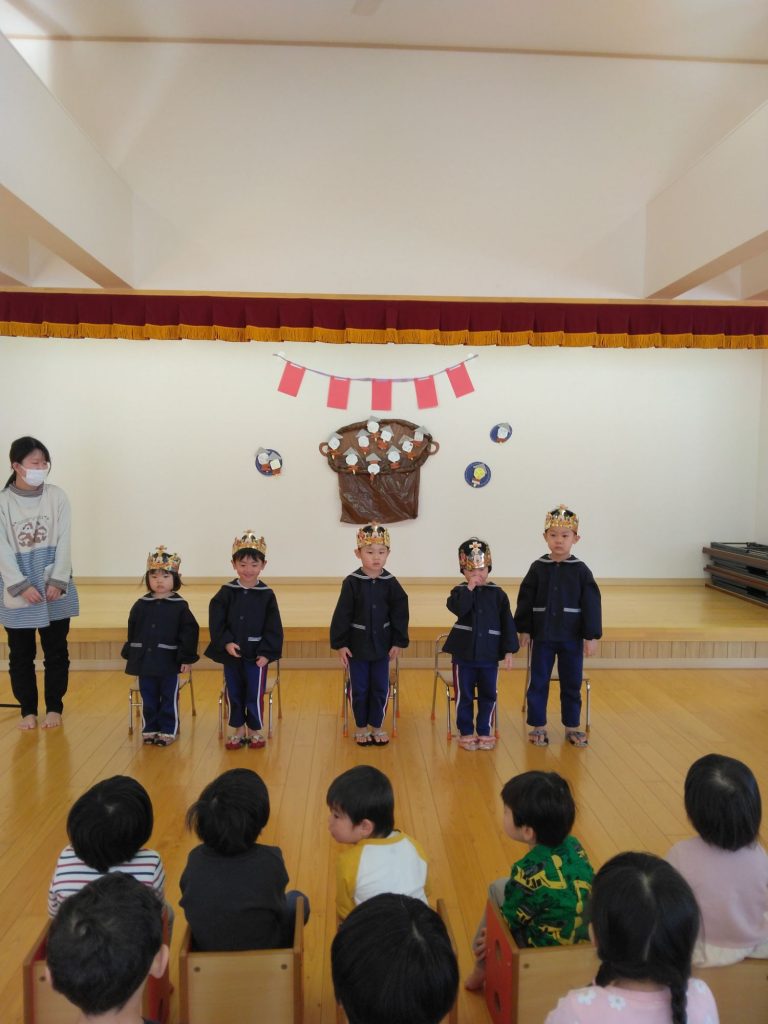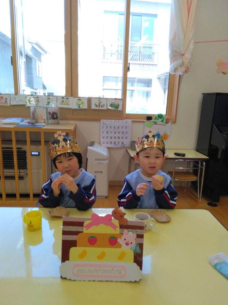 今日は2月生まれのお友だち4人と1月のお誕生会をお休みしたお友だち1人の5人をお祝いしました。