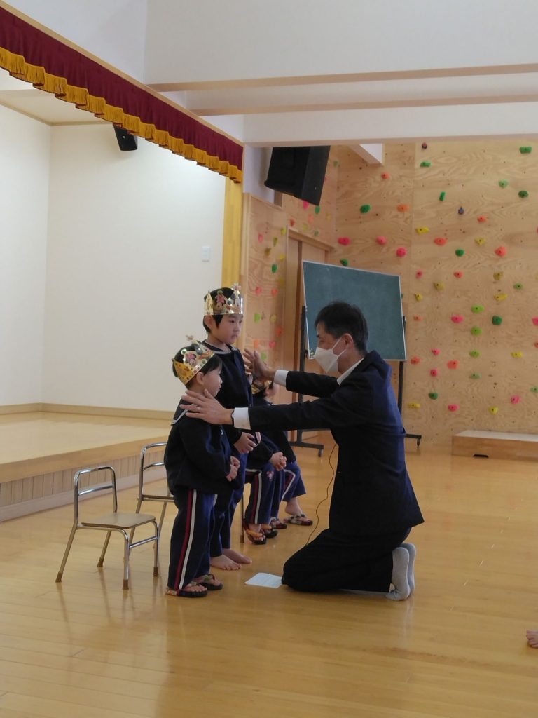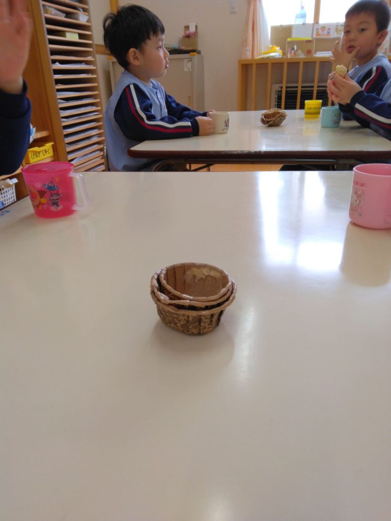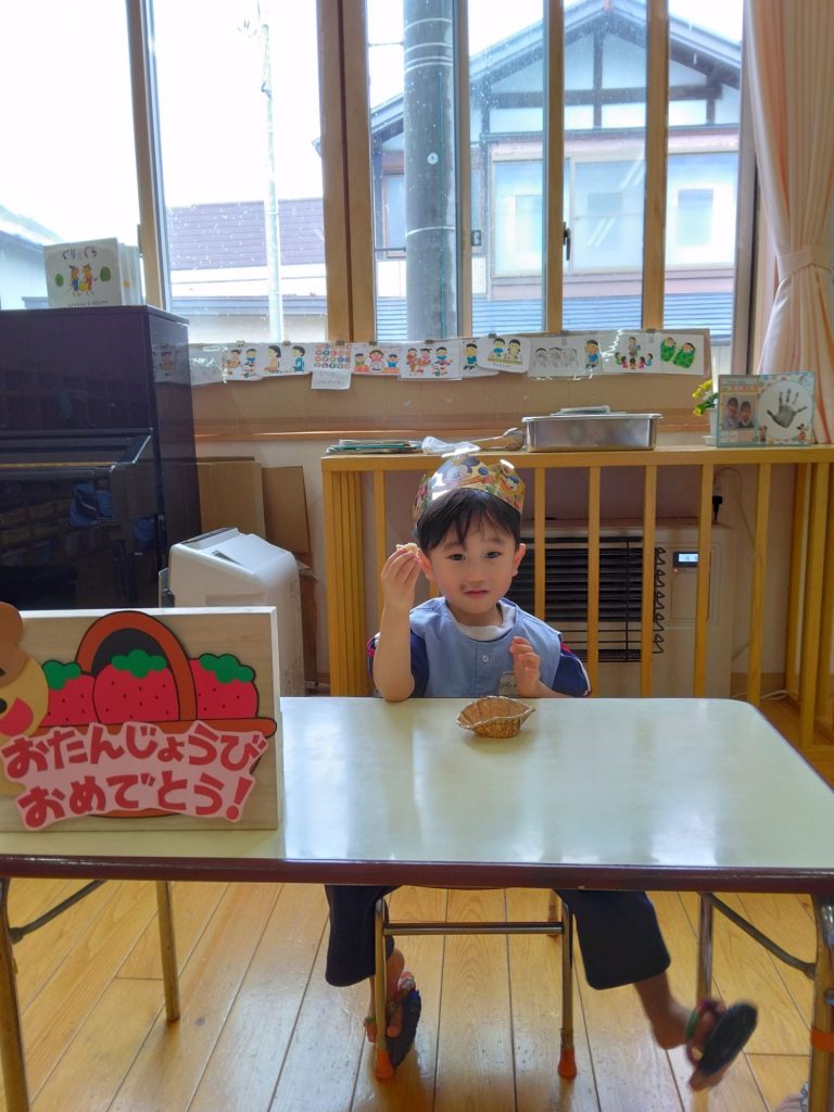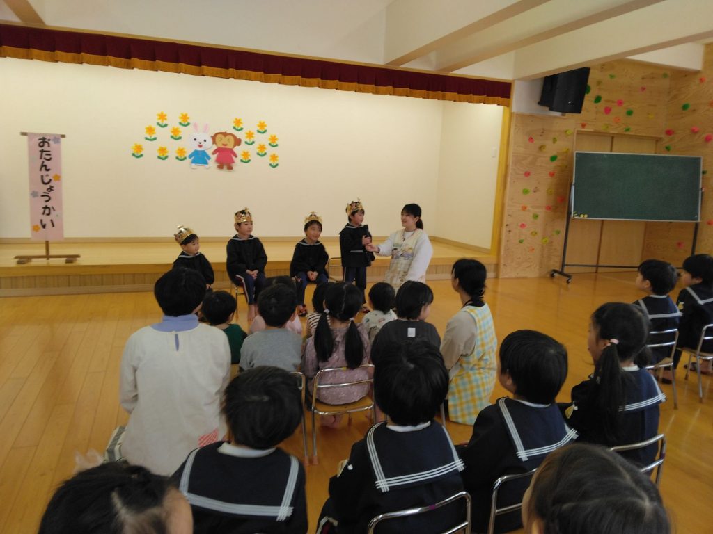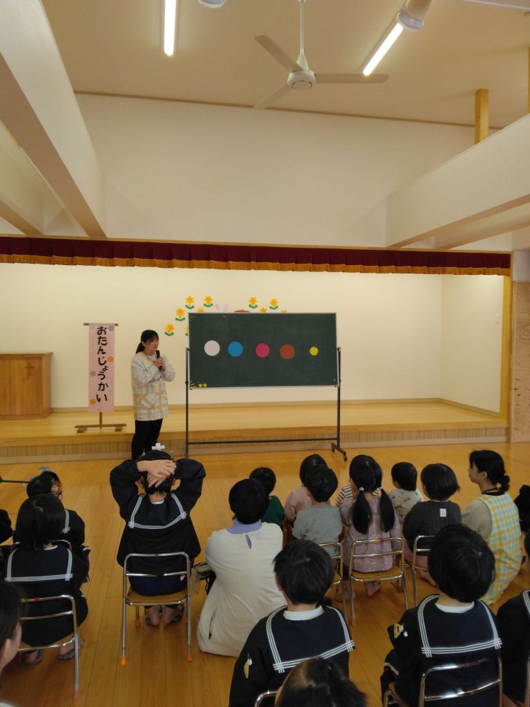 3月お誕生会(以上児) 2025.03.06 4月からずーっと「ぼくの誕生会はいつ?」と楽しみに待っていた3月生まれの子どもたち。ニコニコの笑顔で今日の日を迎えました。 お楽しみタイムは5つの色の丸が何かに変わります!さてさてなんでしょう… 白い丸には細長い物が2つ付くと… 青い丸には三角が1つ付くと… 赤い丸には細長い物が8本付くと… みんなで推理しながら楽しみました! 美味しいケーキを食べた後はきれいにお片づけしていました。すみれ組さんはテーブルごとにカップを集めて順番を決めて捨てます。子どもたちで決めたルールです。