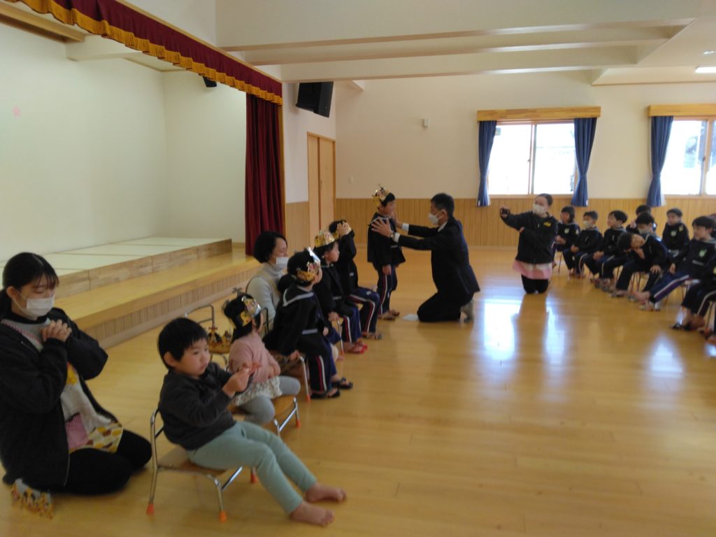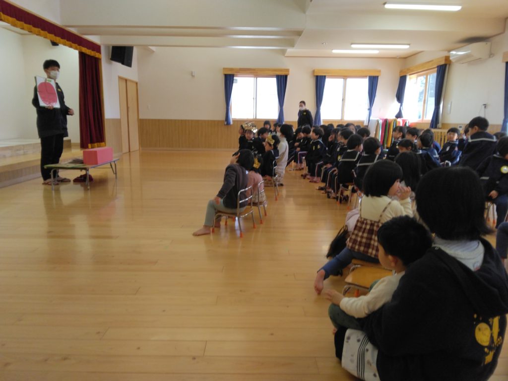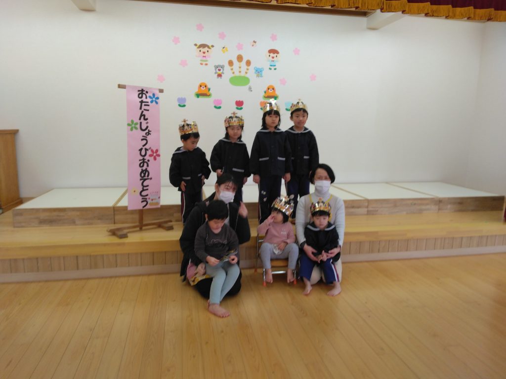 3月の誕生会 2023.03.16 2022年度最後のお誕生日会が行われました。 毎月、お友だちの誕生会をお祝いをしてきましたがいよいよ自分たちの番です。 すこーし緊張、いっぱい緊張いろいろな表情でお友だちの前に座りました。 マイクを持って自己紹介もしました! お楽しみタイムでは司会の先生の好物は何でしょう?と、パズルが一個ずつ増えていくのを見ながら応えていました。
