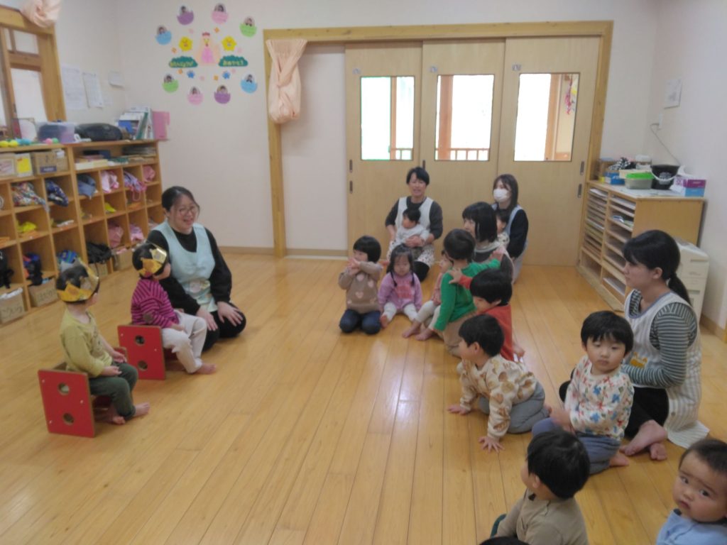 今日はすずらん組1名、ひまわり組1名の誕生児をもも組と一緒にお祝いしました。