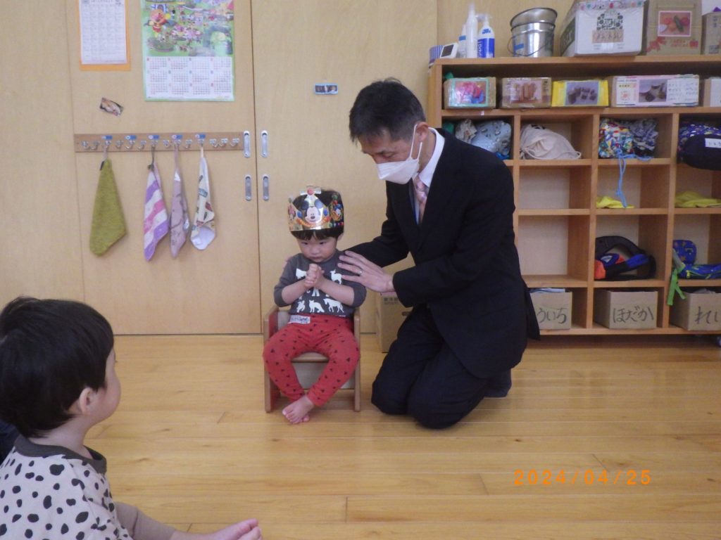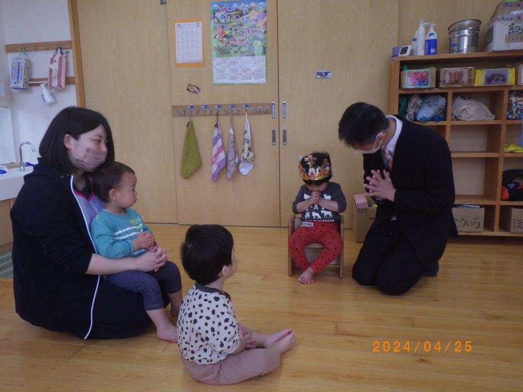 4月生まれ誕生会(未満児) 2024.04.25 今月の誕生児はもも組とすずらん組にいましたが、もも組のお友だちはお休みだったのですずらん組で誕生会を行いました。 みんなの前に冠をかぶって嬉しそうに座る姿がとても可愛らしかったです。牧師先生は誕生児にもそしてクラスのお友だちのことも祈ってくださいました。 その後はお楽しみタイム! 誕生児のお友だちが大好きな「はたらく車」の歌に合わせてスケッチブックシアターをみせてくれたのですが、とっても嬉しそうに一緒にその歌を口ずさんでいました。