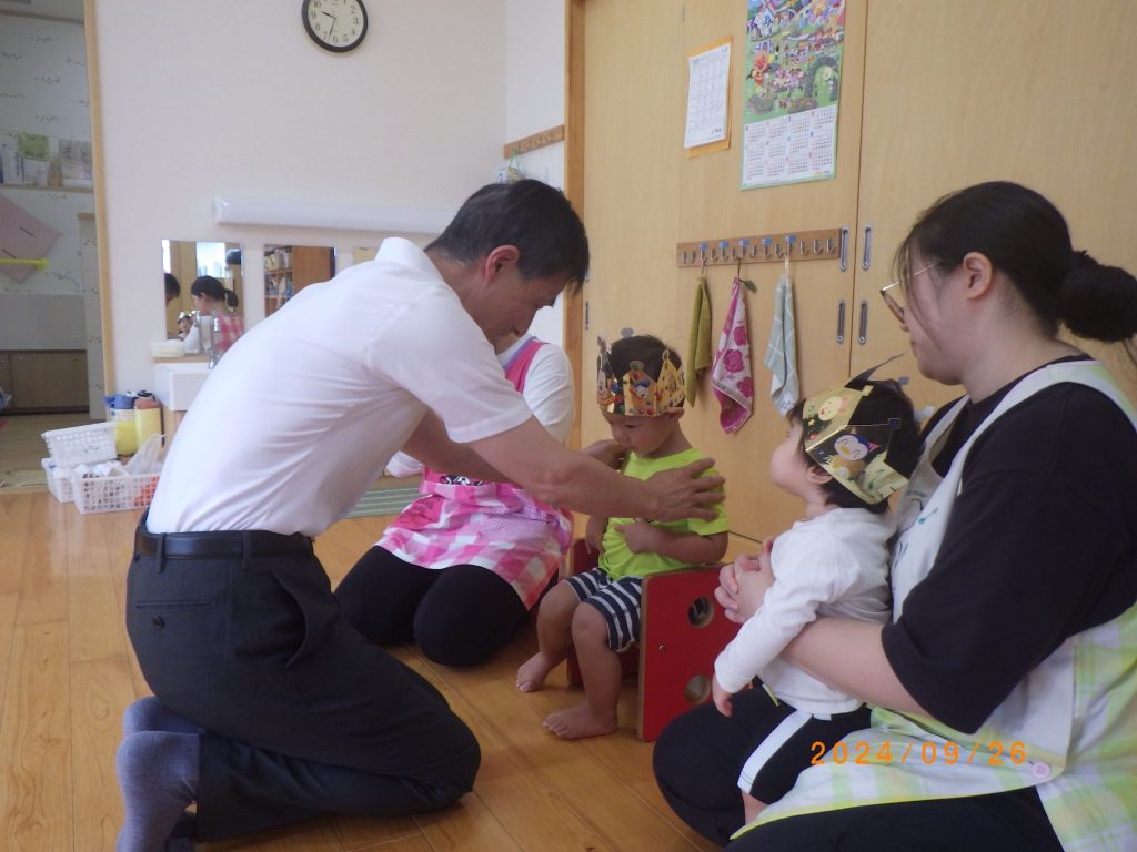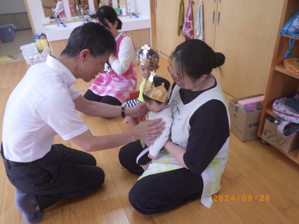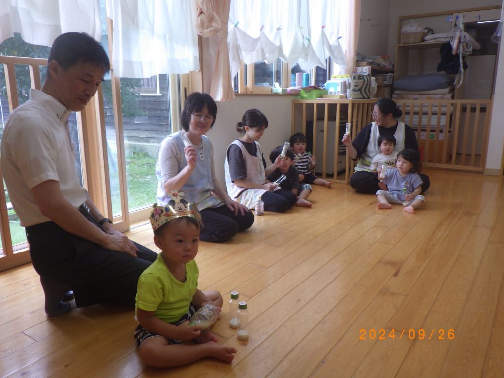 9月生まれの誕生会(未満児) 2024.09.26 今日は3人のお友だちのお祝いをする予定でしたが残念ながら1人はお休みとなり、2人のお友だちのお祝いをしました。 緊張した表情で誕生席に座る姿は可愛らしかったです。牧師先生にもお祈りしてもらい、嬉しい時を過ごしました。お楽しみタイムでは曲に合わせてみんなで手作りマラカスを鳴らしまし、お米で作った優しいマラカスの音を楽しみました。